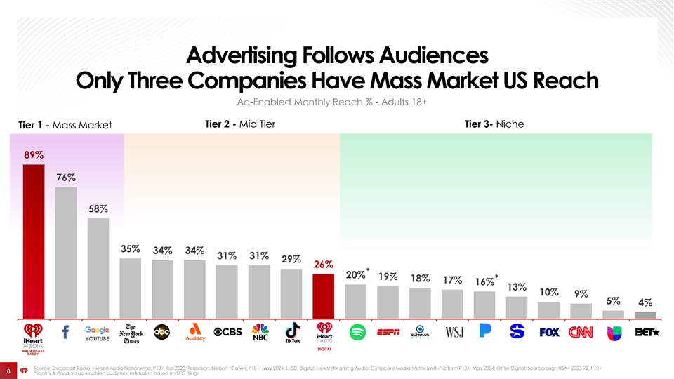 广告追随受众仅有三家公司拥有大众市场美国覆盖广告启用月度达到%-成人18 + Tier 2-Mid Tier 3-利基Tier 1-大众市场89% 76% 58% 35% 34% 34% 31% 31% 29% 26%*20% 19% 18%*17% 16% 13% 10% 9% 5% 4% iHM Facebook谷歌新ABC Audacy CBS NBC TikTok iHeartRadio Spotify ESPN Cumulus WSJ Pandora SiriusXM Fox News CNN Univision BET广播YouTube York Times Digital YOUTUBE Radio数字来源;广播电台:Nielsen Audio Nationwide,P18 +,2023年秋季;电视:Nielsen NPower,P18 +,2024年5月,L + SD;Digital;News/Streaming Audio:康姆斯克 Media Metrix Multi-Platform P18 +,2024年5月;Other Digital:Scarborough USA + 2023 R2,P18 + 8*Spotify & Pandora广告启用受众根据SEC文件估算8