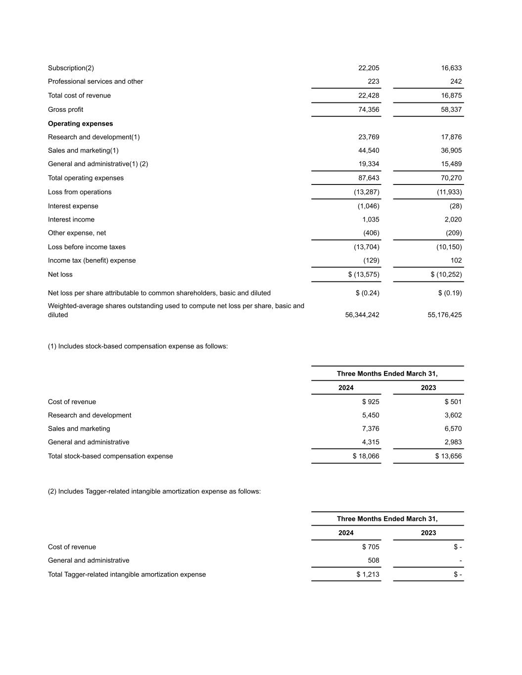 订阅(2)22,20516,633专业服务及其他223242总收入成本22,42816,875毛利润74,35658,337营业费用研发(1)23,76917,876销售和营销(1)44,54036,905一般和行政(1)(2)19,33415,489营业费用总额87,64370,270营业亏损(13,287)(11,933)利息支出(1,046)(28)利息收入1,0352,020其他费用净额(406)(209)所得税前亏损(13,704)(10,150)所得税(收益)费用(129)102净亏损$(13,575)$(10,252)归属于普通股股东的每股净亏损,基本和稀释后$(0.24)$(0.19)用于计算每股净亏损的加权平均流通股,基本和稀释后56,344,24255,176,425(1)包括以下基于股票的补偿费用:截至2024年3月31日的三个月2023年收入成本$ 925 $ 501研发5,4503,602销售和营销7,3766,570一般和行政4,3152,983基于股票的补偿费用总额$ 18,066 $ 13,656(2)包括与Tagger相关的无形摊销费用如下:截至3月31日的三个月,20242023收入成本$ 705 $-一般和行政508-与Tagger相关的无形摊销费用总额$ 1,213 $-