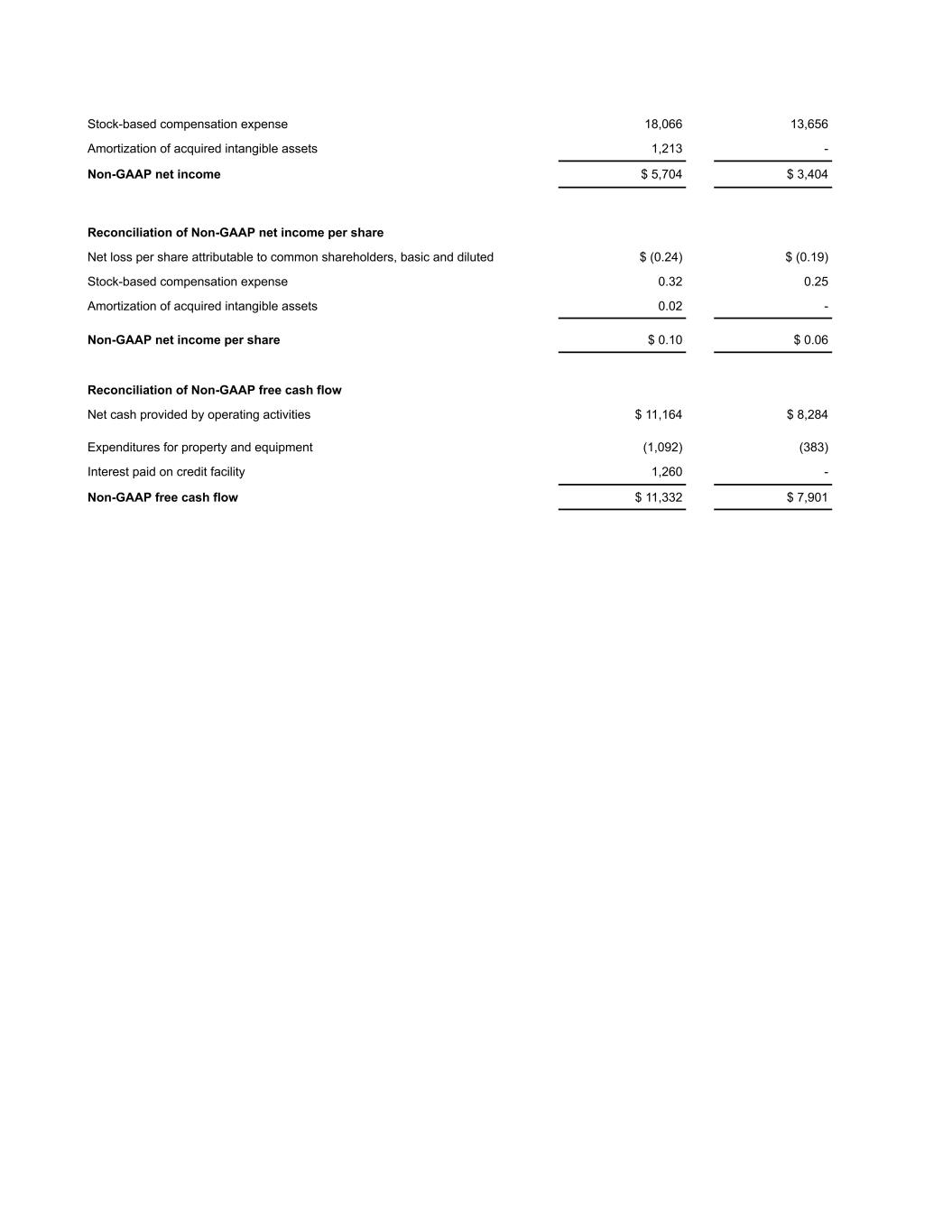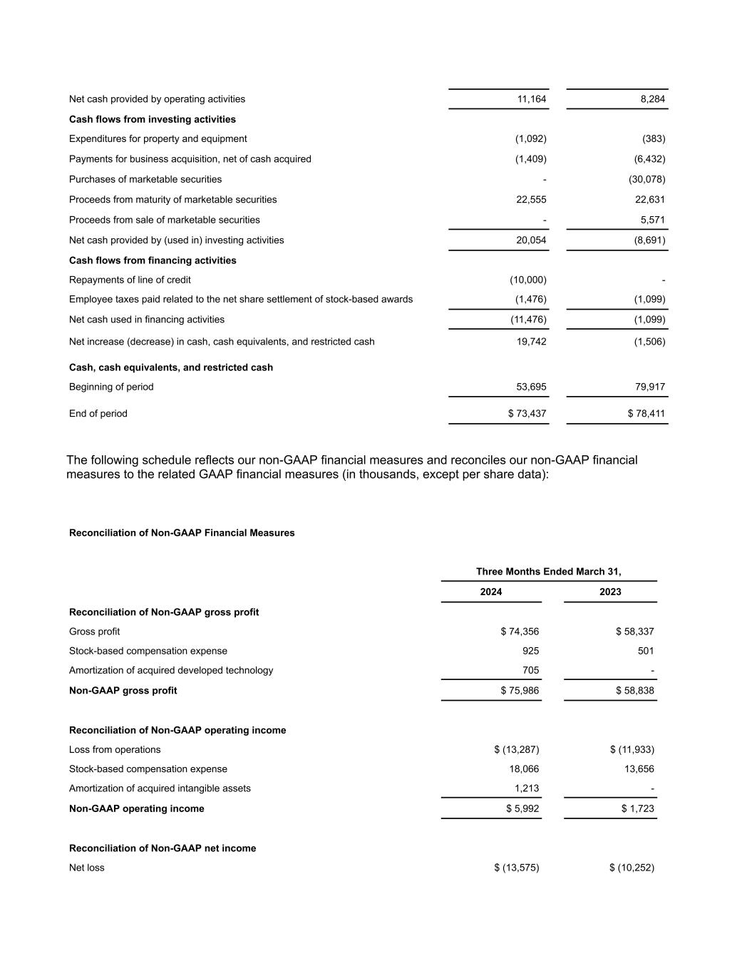经营活动提供的现金净额11,1648,284投资活动现金流物业及设备支出(1,092)(383)业务收购付款,取得的现金净额(1,409)(6,432)购买有价证券-(30,078)有价证券到期收益22,55522,631出售有价证券收益-5,571投资活动提供(用于)的现金净额20,054(8,691)筹资活动产生的现金流量偿还信用额度(10,000)-支付的与以股票为基础的奖励的净份额结算相关的职工税款(1,476)(1,099)以筹资活动使用的现金净额(11,476)(1,099)现金、现金等价物、限制性现金净增加(减少)19,742(1,506)现金、现金等价物,和受限现金期初53,69579,917期末73,437美元78,411美元以下时间表反映了我们的非GAAP财务指标,并将我们的非GAAP财务指标与相关的GAAP财务指标进行了核对(以千为单位,每股数据除外):非GAAP财务指标的核对截至3月31日的三个月,20242023非公认会计原则毛利润调节毛利润74,356美元58,337美元基于股票的补偿费用925501获得的已开发技术的摊销705-非公认会计原则毛利润75,986美元58,838美元基于股票的补偿费用调节非公认会计原则营业收入运营损失$(13,287)$(11,933)基于股票的补偿费用18,06613,656获得的无形资产的摊销1,213-非公认会计原则营业收入5,992美元1,723非公认会计原则净收入调节净亏损$(13,575)$(10,252)