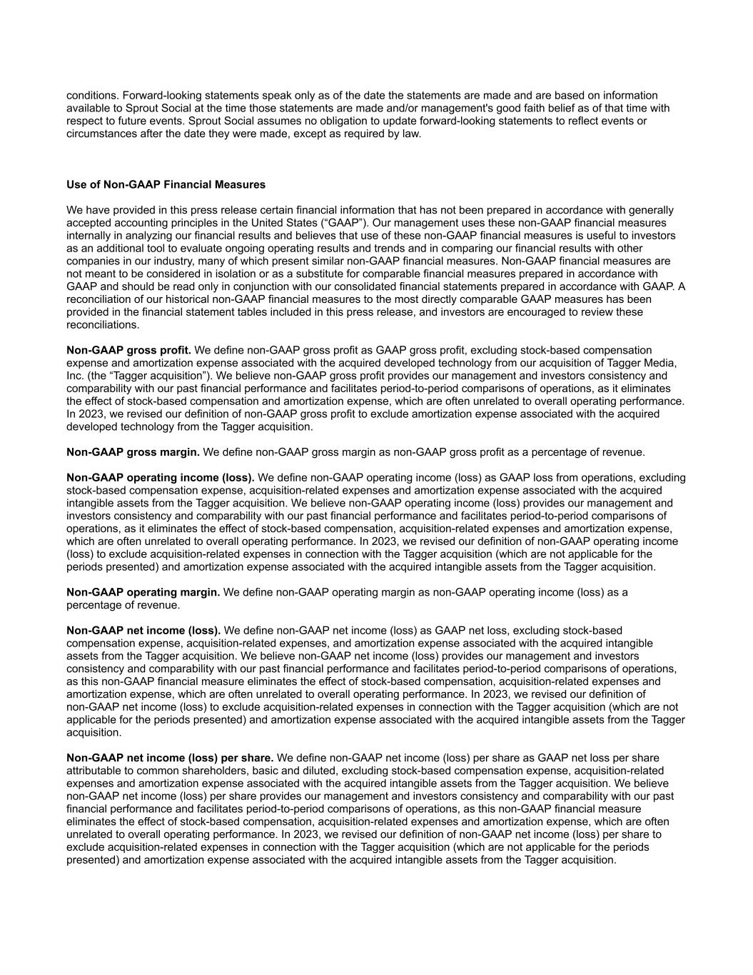 条件。前瞻性陈述仅在做出这些陈述之日起生效,其依据是Sprout Social在做出这些陈述时可获得的信息和/或管理层截至当时对未来事件的善意信念。除非法律要求,否则Sprout Social不承担更新前瞻性陈述以反映作出之日后的事件或情况的义务。非GAAP财务指标的使用我们在本新闻稿中提供了某些未按照美国公认会计原则(“GAAP”)编制的财务信息。我们的管理层在内部使用这些非GAAP财务指标来分析我们的财务业绩,并认为使用这些非GAAP财务指标对投资者有用,作为评估持续经营业绩和趋势以及将我们的财务业绩与我们行业中的其他公司进行比较的额外工具,其中许多公司提供了类似的非GAAP财务指标。非GAAP财务指标不应被孤立地考虑或替代根据GAAP编制的可比财务指标,应仅与我们根据GAAP编制的合并财务报表一起阅读。本新闻稿中包含的财务报表表格提供了我们的历史非GAAP财务指标与最直接可比的GAAP指标的对账,鼓励投资者审查这些对账。非GAAP毛利润。我们将非GAAP毛利润定义为GAAP毛利润,不包括基于股票的补偿费用和与我们收购Tagger Media,Inc.(“Tagger收购”)所获得的开发技术相关的摊销费用。我们认为,非GAAP毛利润为我们的管理层和投资者提供了与我们过去财务业绩的一致性和可比性,并促进了运营的期间比较,因为它消除了基于股票的薪酬和摊销费用的影响,而这些影响通常与整体运营业绩无关。2023年,我们修改了非GAAP毛利润的定义,将与收购的开发技术相关的摊销费用从Tagger收购中排除。Non-GAAP毛利率。我们将Non-GAAP毛利率定义为Non-GAAP毛利润占收入的百分比。Non-GAAP营业收入(亏损)。我们将Non-GAAP营业收入(亏损)定义为GAAP营业亏损,不包括基于股票的补偿费用、与收购相关的费用以及与Tagger收购所获得的无形资产相关的摊销费用。我们认为,非GAAP营业收入(亏损)为我们的管理层和投资者提供了与我们过去财务业绩的一致性和可比性,并促进了运营的期间比较,因为它消除了基于股票的薪酬、收购相关费用和摊销费用的影响,而这些影响通常与整体经营业绩无关。2023年,我们修订了我们对非GAAP营业收入(亏损)的定义,以排除与Tagger收购相关的收购相关费用(不适用于所示期间)以及与Tagger收购所收购的无形资产相关的摊销费用。Non-GAAP营业利润率。我们将Non-GAAP营业利润率定义为Non-GAAP营业收入(亏损)占收入的百分比。Non-GAAP净收入(亏损)。我们将Non-GAAP净收入(亏损)定义为GAAP净亏损,不包括基于股票的补偿费用、与收购相关的费用以及与Tagger收购所获得的无形资产相关的摊销费用。我们认为,非GAAP净收入(亏损)为我们的管理层和投资者提供了与我们过去财务业绩的一致性和可比性,并促进了运营的期间比较,因为这种非GAAP财务指标消除了基于股票的薪酬、收购相关费用和摊销费用的影响,而这些费用通常与整体运营业绩无关。2023年,我们修订了我们对非GAAP净收入(亏损)的定义,以排除与Tagger收购相关的收购相关费用(不适用于所示期间)以及与Tagger收购所获得的无形资产相关的摊销费用。Non-GAAP每股净收益(亏损)。我们将Non-GAAP每股净收益(亏损)定义为GAAP归属于普通股股东的每股净亏损,基本和稀释,不包括基于股票的补偿费用, 与收购相关的费用和与从Tagger收购中获得的无形资产相关的摊销费用。我们认为,非GAAP每股净收入(亏损)为我们的管理层和投资者提供了与我们过去财务业绩的一致性和可比性,并促进了运营的期间比较,因为这种非GAAP财务指标消除了基于股票的薪酬、收购相关费用和摊销费用的影响,而这些影响通常与整体运营业绩无关。2023年,我们修订了非GAAP每股净收入(亏损)的定义,以排除与Tagger收购相关的收购相关费用(不适用于所示期间)以及与Tagger收购所收购的无形资产相关的摊销费用。