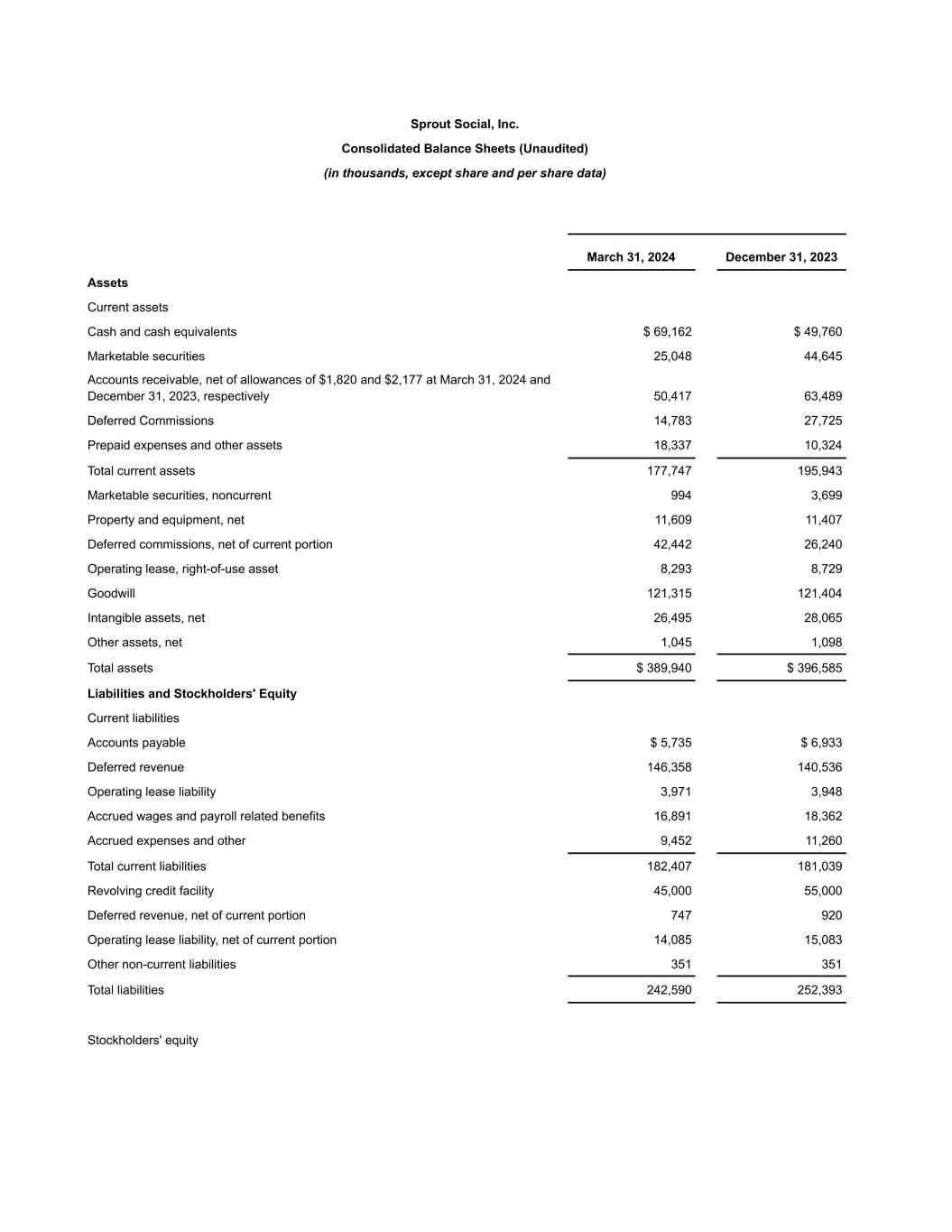 Sprout Social, Inc.合并资产负债表(未经审计)(以千为单位,股票和每股数据除外)2024年3月31日2023年12月31日资产流动资产现金和现金等价物69,162美元49,760美元有价证券25,04844,645应收账款,扣除2024年3月31日和2023年12月31日的备抵后分别为1,820美元和2,177美元50,41763,489递延佣金14,78327,725预付费用和其他资产18,33710,324流动资产总额177,747195,943有价证券,非流动9943,699财产和设备,净额11,60911,407递延佣金,扣除流动部分42,44226,240经营租赁,使用权资产8,2938,729商誉121,315121,404 无形资产,净值净额26,49528,065其他资产净额1,0451,098总资产389,940美元396,585美元负债和股东权益流动负债应付账款5,735美元6,933美元递延收入146,358140,536经营租赁负债3,9713,948应计工资和工资相关福利16,89118,362应计费用和其他9,45211,260流动负债总额182,407181,039循环信贷额度45,00055,000递延收入,扣除流动部分747920经营租赁负债,扣除流动部分14,08515,083其他非流动负债351351负债总额242,590252,393股东权益