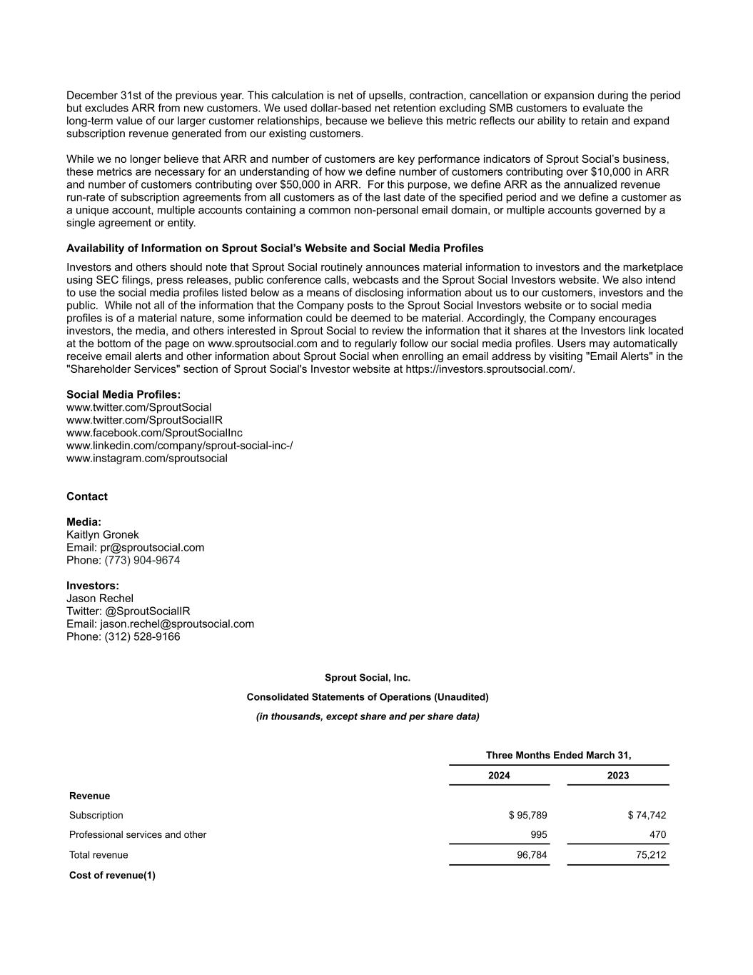 前一年12月31日。这一计算已扣除该期间的追加销售、收缩、取消或扩展,但不包括新客户的ARR。我们使用不包括SMB客户的基于美元的净留存来评估我们更大的客户关系的长期价值,因为我们认为这一指标反映了我们保留和扩大现有客户产生的订阅收入的能力。虽然我们不再认为ARR和客户数量是Sprout Social业务的关键绩效指标,但这些指标对于理解我们如何定义贡献超过10,000美元ARR的客户数量和贡献超过50,000美元ARR的客户数量是必要的。为此,我们将ARR定义为截至指定期间最后一个日期来自所有客户的订阅协议的年化收入运行率,并将客户定义为一个唯一账户、包含一个共同的非个人电子邮件域的多个账户,或受单一协议或实体管辖的多个账户。Sprout Social网站和社交媒体简介中信息的可用性投资者和其他人应注意,Sprout Social通常会使用SEC文件、新闻稿、公开电话会议、网络广播和Sprout Social Investors网站向投资者和市场公布重要信息。我们还打算使用下面列出的社交媒体资料,作为向我们的客户、投资者和公众披露有关我们的信息的一种手段。虽然该公司在Sprout Social投资者网站或社交媒体资料上发布的信息并非所有信息都具有重要性质,但有些信息可能会被视为重要信息。因此,公司鼓励投资者、媒体和其他对Sprout Social感兴趣的人查看其在www.sproutsocial.com页面底部的投资者链接上分享的信息,并定期关注我们的社交媒体资料。用户在注册电子邮件地址时,通过访问Sprout Social投资者网站https://investors.sproutsocial.com/“股东服务”部分的“电子邮件提醒”,可能会自动收到有关Sprout Social的电子邮件提醒和其他信息。社交媒体简介:www.twitter.com/SproutSocial www.twitter.com/SproutSocialIR www.facebook.com/SproutSocialInc www.linkedin.com/company/sprout-social-inc-/www.instagram.com/sproutSocialContact Media:Kaitlyn Gronek Email:pr@sproutsocial.com Phone:(773)904-9674 Investors:Jason Rechel Twitter:@ SproutSocialIR Email:jason.rechel@sproutsocial.com Phone:(312)528-9166 Sprout Social, Inc.合并经营报表(未经审计)(单位:千,股票和每股数据除外)截至2024年3月31日的三个月2023年收入订阅95,789美元74,742美元