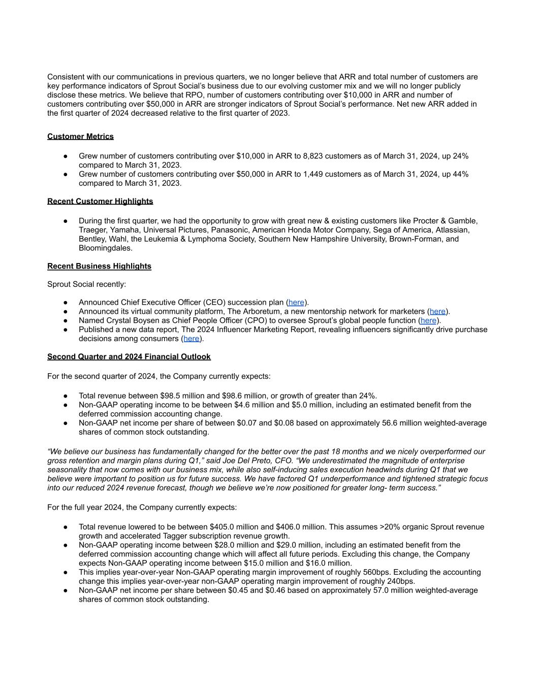 与我们在前几个季度的沟通一致,由于我们不断变化的客户组合,我们不再认为ARR和客户总数是Sprout Social业务的关键绩效指标,我们将不再公开披露这些指标。我们认为,RPO、对ARR贡献超过10,000美元的客户数量以及对Sprout Social贡献超过50,000美元的客户数量是衡量TERM2表现的更强指标。2024年第一季度新增的净ARR相对于2023年第一季度有所下降。客户指标●截至2024年3月31日,为8823个客户贡献超过10,000美元ARR的客户数量增加,与2023年3月31日相比增长24%。●截至2024年3月31日,为1,449名客户贡献超过50,000美元ARR的客户数量增加,与2023年3月31日相比增长44%。最近的客户亮点●在第一季度,我们有机会与伟大的新老客户一起成长,这些新老客户包括宝洁、Traeger、雅马哈、环球影业、松下、美国本田公司、美国世嘉、Atlassian、宾利、Wahl、白血病和淋巴瘤协会、南新罕布什尔大学、布朗-福曼和Bloomingdales。近期业务亮点Sprout Social近期:●宣布首席执行官(CEO)继任计划(此处)。●宣布其虚拟社区平台The Arboretum,一个新的营销人员指导网络(此处)。●任命Crystal Boysen为首席人事官(CPO),负责监督Sprout的全球人事职能(此处)。●发布了一份新的数据报告,即2024年影响者营销报告,揭示了影响者显着推动了消费者的购买决策(此处)。第二季度和2024年财务展望2024年第二季度,公司目前预计:●总收入在9850万美元至9860万美元之间,或增长超过24%。●非美国通用会计准则营业收入将在460万美元至500万美元之间,包括递延佣金会计变更带来的估计收益。●基于约5660万股已发行普通股的加权平均股数,非美国通用会计准则下的每股净收益在0.07美元至0.08美元之间。“我们相信,在过去18个月里,我们的业务已经发生了根本性的好转,我们在第一季度的毛利率和利润率计划中表现出色,”首席财务官Joe Del Preto表示。“我们低估了现在伴随我们的业务组合而来的企业季节性的规模,同时也低估了第一季度自我诱导的销售执行逆风,我们认为这对我们未来的成功定位很重要。我们已经将第一季度表现不佳和收紧战略重点纳入了我们下调的2024年收入预测,尽管我们相信我们现在已经为取得更大的长期成功做好了准备。”对于2024年全年,该公司目前预计:●总收入下调至4.050亿美元至4.060亿美元之间。这是假设> 20%的有机新芽收入增长和加速的Tagger订阅收入增长。●非美国通用会计准则营业收入在2800万美元至2900万美元之间,包括将影响所有未来期间的递延佣金会计变更带来的估计收益。不计入这一变化,该公司预计非美国通用会计准则营业收入在1500万美元至1600万美元之间。●这意味着非美国通用会计准则营业利润率同比提高约560bps。不计入会计变更,这意味着非GAAP营业利润率同比提高约240bps。●基于约5700万股已发行普通股的加权平均股数,非美国通用会计准则下的每股净收益在0.45美元至0.46美元之间。