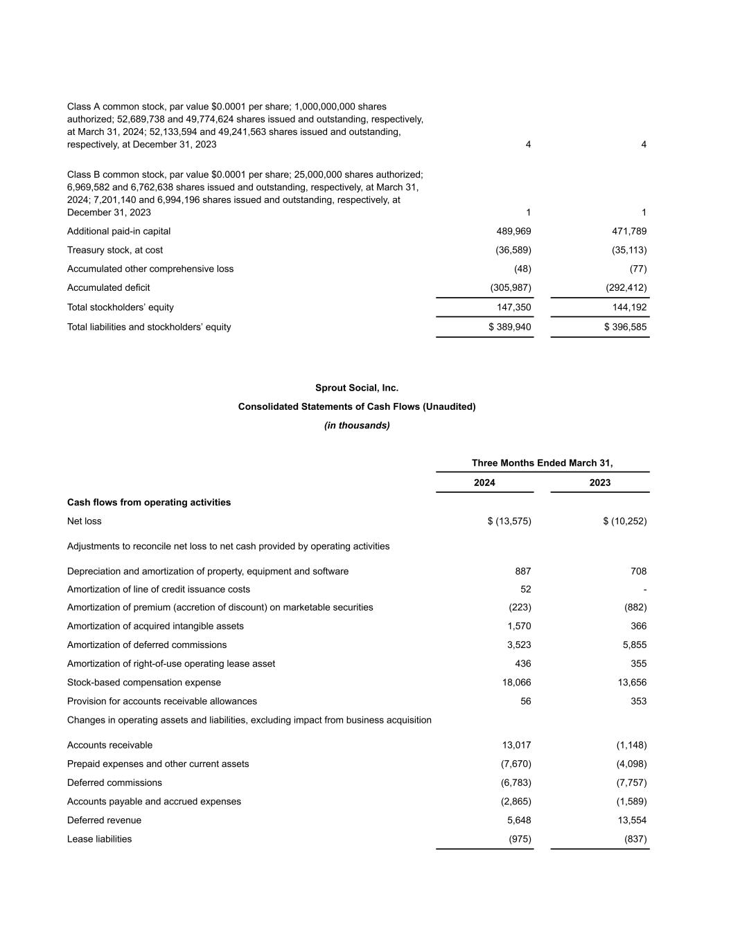 A类普通股,每股面值0.0001美元;授权1,000,000,000股;截至2024年3月31日已发行和流通股分别为52,689,738股和49,774,624股;截至2023年12月31日已发行和流通股分别为52,133,594股和49,241,563股44股B类普通股,每股面值0.0001美元;授权25,000,000股;截至2024年3月31日已发行和流通股分别为6,969,582股和6,762,638股;截至2023年12月31日已发行和流通股分别为7,201,140股和6,994,196股11 额外实收资本 489,969471,789库存股,按成本(36,589)(35,113)累计其他综合亏损(48)(77)累计亏损(305,987)(292,412)股东权益合计147,350144,192负债和股东权益合计$ 389,940 $ 396,585 Sprout Social, Inc.合并现金流量表(未经审计)(单位:千)截至2024年3月31日止三个月2023年经营活动现金流净亏损$(13,575)$(10,252)调整净亏损与经营活动提供的现金净额财产折旧和摊销,设备软件887708信用额度发放费用摊销52-有价证券溢价(折价增值)摊销(223)(882)取得的无形资产摊销1,570366递延佣金摊销3,5235,855使用权经营租赁资产摊销436355以股票为基础的补偿费用18,06613,656计提应收账款备抵56353经营性资产和负债变动,排除业务收购影响应收账款13,017(1,148)预付费用和其他流动资产(7,670)(4,098)递延佣金(6,783)(7,757)应付账款和应计费用(2,865)(1,589)递延收入5,64813,554租赁负债(975)(837)