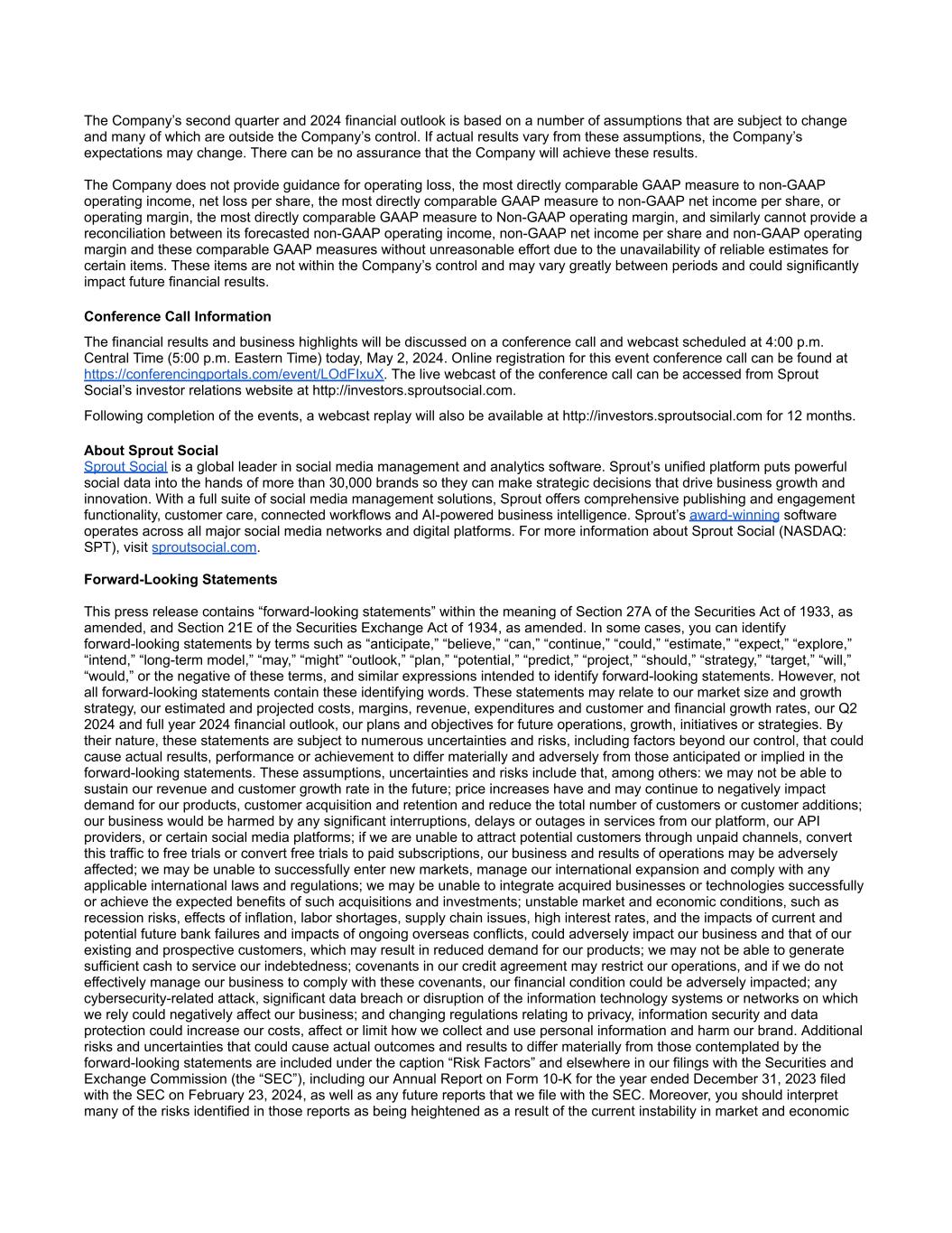 该公司第二季度和2024年财务展望基于多项假设,这些假设可能会发生变化,其中许多假设超出了公司的控制范围。如果实际结果与这些假设不同,公司的预期可能会发生变化。无法保证公司将取得这些成果。该公司没有提供营业亏损的指导,这是与非GAAP营业收入最直接可比的GAAP衡量标准,每股净亏损,与非GAAP每股净收入最直接可比的GAAP衡量标准,或营业利润率,与非GAAP营业利润率最直接可比的GAAP衡量标准,同样,由于无法获得某些项目的可靠估计,因此无法提供其预测的非GAAP营业收入、非GAAP每股净收入和非GAAP营业利润率与这些可比GAAP衡量标准之间的对账,而无需做出不合理的努力。这些项目不在公司的控制范围内,期间之间可能会有很大差异,并可能对未来的财务业绩产生重大影响。电话会议信息财务业绩和业务亮点将在定于美国中部时间今天(2024年5月2日)下午4:00(东部时间下午5:00)举行的电话会议和网络直播中进行讨论。本次活动电话会议的在线注册可在https://conferencingportals.com/event/LOdFIxuX上找到。电话会议的网络直播可从Sprout Social的投资者关系网站http://investors.sproutsocial.com进行。活动结束后,还将在http://investors.sproutsocial.com上提供为期12个月的网络直播重播。关于Sprout SocialSprout Social是社交媒体管理和分析软件的全球领先企业。Sprout的统一平台将强大的社交数据交到30,000多个品牌手中,这样他们就可以做出推动业务增长和创新的战略决策。凭借全套社交媒体管理解决方案,Sprout提供全面的发布和参与功能、客户服务、互联工作流程和人工智能驱动的商业智能。Sprout的获奖软件在所有主要的社交媒体网络和数字平台上运行。欲了解有关Sprout Social(NASDAQ:SPT)的更多信息,请访问sproutsocial.com。前瞻性陈述本新闻稿包含经修订的1933年证券法第27A条和经修订的1934年证券交易法第21E条含义内的“前瞻性陈述”。在某些情况下,您可以通过“预期”、“相信”、“可以”、“继续”、“可能”、“估计”、“预期”、“探索”、“打算”、“长期模型”、“可能”、“可能”、“展望”、“计划”、“潜力”、“预测”、“项目”、“应该”、“战略”、“目标”、“将”、“将”或这些术语的否定词来识别前瞻性陈述,以及旨在识别前瞻性陈述的类似表述。然而,并非所有的前瞻性陈述都包含这些识别词。这些陈述可能涉及我们的市场规模和增长战略、我们的估计和预计成本、利润率、收入、支出以及客户和财务增长率、我们的2024年第二季度和2024年全年财务展望、我们对未来运营、增长、举措或战略的计划和目标。就其性质而言,这些陈述受到众多不确定性和风险的影响,包括我们无法控制的因素,这些因素可能导致实际结果、业绩或成就与前瞻性陈述中预期或暗示的存在重大不利差异。这些假设、不确定性和风险包括,除其他外:我们可能无法在未来维持我们的收入和客户增长率;价格上涨已经并可能继续对我们产品的需求、客户获取和保留产生负面影响,并减少客户总数或客户增加;我们的业务将受到来自我们的平台、我们的API提供商或某些社交媒体平台的服务的任何重大中断、延迟或中断的损害;如果我们无法通过无偿渠道吸引潜在客户,将这些流量转换为免费试用或将免费试用转换为付费订阅,我们的业务和经营业绩可能会受到不利影响;我们可能无法成功进入新市场、管理我们的国际扩张并遵守任何适用的国际法律法规;我们可能无法成功整合收购的业务或技术或实现此类收购和投资的预期收益;不稳定的市场和经济状况,例如衰退风险、通货膨胀的影响、劳动力短缺、供应链问题、高利率,以及当前和未来潜在的银行倒闭的影响和持续的海外冲突的影响, 可能会对我们的业务以及我们现有和潜在客户的业务产生不利影响,从而可能导致对我们产品的需求减少;我们可能无法产生足够的现金来偿还我们的债务;我们的信贷协议中的契约可能会限制我们的运营,如果我们不能有效管理我们的业务以遵守这些契约,我们的财务状况可能会受到不利影响;任何与网络安全相关的攻击、重大数据泄露或我们所依赖的信息技术系统或网络的中断都可能对我们的业务产生负面影响;以及与隐私相关的法规发生变化,信息安全和数据保护可能会增加我们的成本,影响或限制我们收集和使用个人信息的方式,并损害我们的品牌。可能导致实际结果和结果与前瞻性陈述所设想的结果和结果存在重大差异的其他风险和不确定性包含在“风险因素”标题下以及我们向美国证券交易委员会(“SEC”)提交的文件的其他地方,包括我们于2024年2月23日向SEC提交的截至2023年12月31日止年度的10-K表格年度报告,以及我们向SEC提交的任何未来报告。此外,你应该将那些报告中确定的许多风险解释为由于当前市场和经济的不稳定而加剧