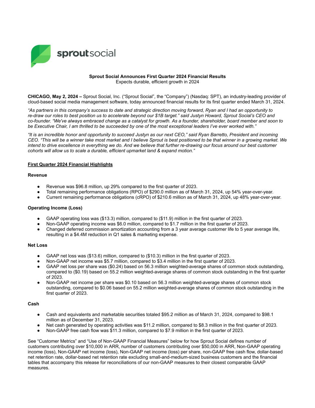 Sprout Social公布2024年第一季度财务业绩,预计2024年将实现持久、高效的增长芝加哥,2024年5月2日– Sprout Social, Inc.(“Sprout Social”,即“公司”)(纳斯达克:SPT)是一家行业领先的基于云的社交媒体管理软件提供商,今天公布了截至2024年3月31日的第一季度财务业绩。“作为这家公司迄今为止所取得的成功以及向前发展的战略方向的合作伙伴,我和Ryan有机会重新划定我们的角色,以使我们处于最佳位置,从而加速超越10亿美元的目标。”Sprout Social的首席执行官兼联合创始人Justyn Howard表示。“我们一直将变革视为增长的催化剂。作为创始人、股东、董事会成员以及即将成为执行主席,我很高兴能由我共事过的最杰出的领导者之一接任。”“能够接替Justyn成为我们的下一任首席执行官,这是令人难以置信的荣幸和机会,”总裁兼新任首席执行官Ryan Barretto表示。“这将是一个赢者通吃的市场,我相信Sprout最适合成为一个不断增长的市场中的赢家。我们打算在我们所做的每一件事上推动卓越。我们相信,进一步围绕我们最好的客户群体重新调整我们的重点,将使我们能够扩展一个持久、高效的高档土地&扩张行动。”2024年第一季度财务摘要营收●营收为9680万美元,与2023年第一季度相比增长29%。●截至2024年3月31日,剩余履约义务(RPO)总额为2.90亿美元,同比增长54%。●截至2024年3月31日,当前剩余履约义务(CRPO)为2.106亿美元,同比增长48%。营业收入(亏损)● GAAP营业亏损为(13.3)百万美元,而2023年第一季度为(11.9)百万美元。●非美国通用会计准则营业收入为600万美元,2023年第一季度为170万美元。●将递延佣金摊销会计从3年平均客户寿命改为5年平均寿命,导致第一季度销售和营销费用减少440万美元。净亏损● GAAP净亏损为(13.6)百万美元,而2023年第一季度为(10.3)百万美元。●非美国通用会计准则净利润为570万美元,而2023年第一季度为340万美元。● GAAP每股净亏损为(0.24美元),基于5630万股已发行普通股加权平均股,而2023年第一季度基于5520万股已发行普通股加权平均股的净亏损为(0.19美元)。●根据已发行普通股加权平均股5630万股计算,非美国通用会计准则每股净收益为0.10美元,而根据2023年第一季度已发行普通股加权平均股5520万股计算,每股净收益为0.06美元。现金●截至2024年3月31日,现金及等价物和有价证券总额为9520万美元,而截至2023年12月31日为9810万美元。●经营活动产生的现金净额为1120万美元,而2023年第一季度为830万美元。●非美国通用会计准则自由现金流为1130万美元,而2023年第一季度为790万美元。请参阅下面的“客户指标”和“非GAAP财务指标的使用”,了解Sprout Social如何定义贡献超过10,000美元ARR的客户数量、贡献超过50,000美元ARR的客户数量、非GAAP营业收入(亏损)、非GAAP净收入(亏损)、非GAAP每股净收入(亏损)、非GAAP自由现金流、基于美元的净留存率、不包括中小型企业客户的基于美元的净留存率以及本新闻稿随附的财务表格,用于将我们的非GAAP指标与其最接近的可比GAAP指标进行对账。