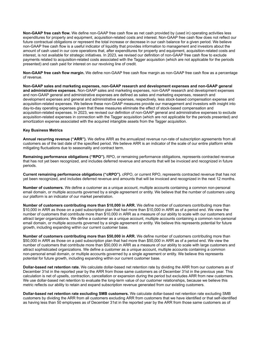 非美国通用会计准则自由现金流。我们将非美国通用会计准则自由现金流定义为经营活动提供(用于)的净现金减去财产和设备支出、购置相关成本和利息。非GAAP自由现金流不反映我们未来的合同义务,也不代表我们在特定时期内现金余额的总增减。我们认为,非美国通用会计准则自由现金流是流动性的一个有用指标,它向管理层和投资者提供了有关我们核心业务中使用的现金数量的信息,在扣除财产和设备支出、与收购相关的成本和利息之后,这些现金无法用于战略举措。2023年,我们修订了非公认会计原则自由现金流的定义,以排除与Tagger收购相关的收购相关成本相关的付款(不适用于所示期间)以及为我们的循环信贷额度利息支付的现金。非GAAP自由现金流利润率。我们将非GAAP自由现金流利润率定义为非GAAP自由现金流占收入的百分比。非美国通用会计准则下的销售和营销费用、非美国通用会计准则下的研发费用以及非美国通用会计准则下的一般和管理费用。Non-GAAP销售和营销费用、Non-GAAP研发费用和Non-GAAP一般和管理费用分别定义为销售和营销费用、研发费用和一般和管理费用,减去基于股票的薪酬费用和收购相关费用。我们认为,鉴于这些措施消除了基于股票的薪酬和收购相关费用的影响,这些非GAAP措施为我们的管理层和投资者提供了对日常运营费用的洞察力。2023年,我们修订了对非GAAP一般和管理费用的定义,以排除与Tagger收购相关的收购相关费用(不适用于所示期间)以及与Tagger收购所收购的无形资产相关的摊销费用。关键业务指标年度经常性收入(“ARR”)。我们将ARR定义为截至指定期间最后一个日期来自所有客户的订阅协议的年化收入运行率。我们认为ARR是衡量我们整个平台规模的一个指标,同时缓解季节性和合同期限带来的波动。剩余履约义务(“RPO”)。RPO或剩余履约义务是指尚未确认的合同收入,包括递延收入和将在未来期间开具发票和确认的金额。当前剩余履约义务(“CRPO”)。CRPO或当前RPO是指尚未确认的合同收入,包括递延收入和将在未来12个月内开具发票并确认的金额。客户数量。我们将客户定义为唯一帐户、包含共同非个人电子邮件域的多个帐户或受单一协议或实体管辖的多个帐户。我们认为,使用我们平台的客户数量是我们市场渗透率的一个指标。ARR贡献超过10,000美元的客户数量。我们将ARR贡献超过10,000美元的客户数量定义为付费订阅计划中截至期末拥有超过10,000美元ARR的客户数量。我们将贡献超过10,000美元ARR的客户数量视为衡量我们与客户一起扩展和吸引更大组织的能力的标准。我们将客户定义为一个独特的账户,包含一个共同的非个人电子邮件域的多个账户,或受单一协议或实体管辖的多个账户。我们认为,这代表了未来增长的潜力,包括在我们目前的客户群范围内进行扩张。ARR贡献超过50,000美元的客户数量。我们将ARR贡献超过50,000美元的客户数量定义为付费订阅计划中截至期末拥有超过50,000美元ARR的客户数量。我们将贡献超过50,000美元ARR的客户数量视为衡量我们与大客户一起扩展和吸引成熟组织的能力的一个衡量标准。我们将客户定义为一个独特的账户,包含一个共同的非个人电子邮件域的多个账户,或受单一协议或实体管辖的多个账户。我们认为,这代表了未来增长的潜力,包括在我们目前的客户群范围内进行扩张。以美元为基础的净留存率。我们计算以美元为基础的净留存率的方法是,将截至报告年度12月31日的客户的ARR除以截至上一年度12月31日的相同客户的ARR。这一计算已扣除该期间的追加销售、收缩、取消或扩展,但不包括新客户的ARR。我们使用基于美元的净留存来评估我们客户关系的长期价值, 因为我们认为这一指标反映了我们保留和扩大现有客户产生的订阅收入的能力。不包括SMB客户的以美元为基础的净留存率。我们计算不包括SMB客户的以美元为基础的净留存率的方法是,将我们已识别出或自我识别为截至报告年度员工人数低于50人的客户的所有客户的不包括ARR的ARR除以这些相同客户截至