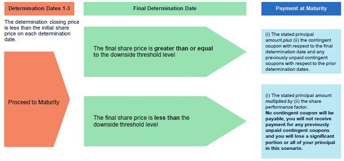 如果确定收盘价高于或等于前三个确定日期中任一日期的初始股价,证券将自动赎回,以获得相当于规定本金金额加上相关确定日期的或有息票和先前确定日期的任何先前未支付的或有息票的提前赎回付款。一旦赎回证券,将不会再支付任何款项。如果证券之前没有被赎回,且最终股价大于或等于下行阈值水平,则到期支付的款项将是规定的本金金额、与最终确定日期相关的或有息票以及与先前确定日期相关的任何先前未支付的或有息票的总和。但是,如果证券之前没有被赎回,最终股价低于下跌阈值水平,投资者将面临最终股价下跌的风险,与初始股价相比,在1比1的基础上。在这种情况下,到期付款将低于证券规定本金金额的60%,可能为零。证券的投资者必须愿意承担损失全部本金的风险,也要承担得不到任何或有息票的风险。此外,投资者不参与任何标的股份的增值。