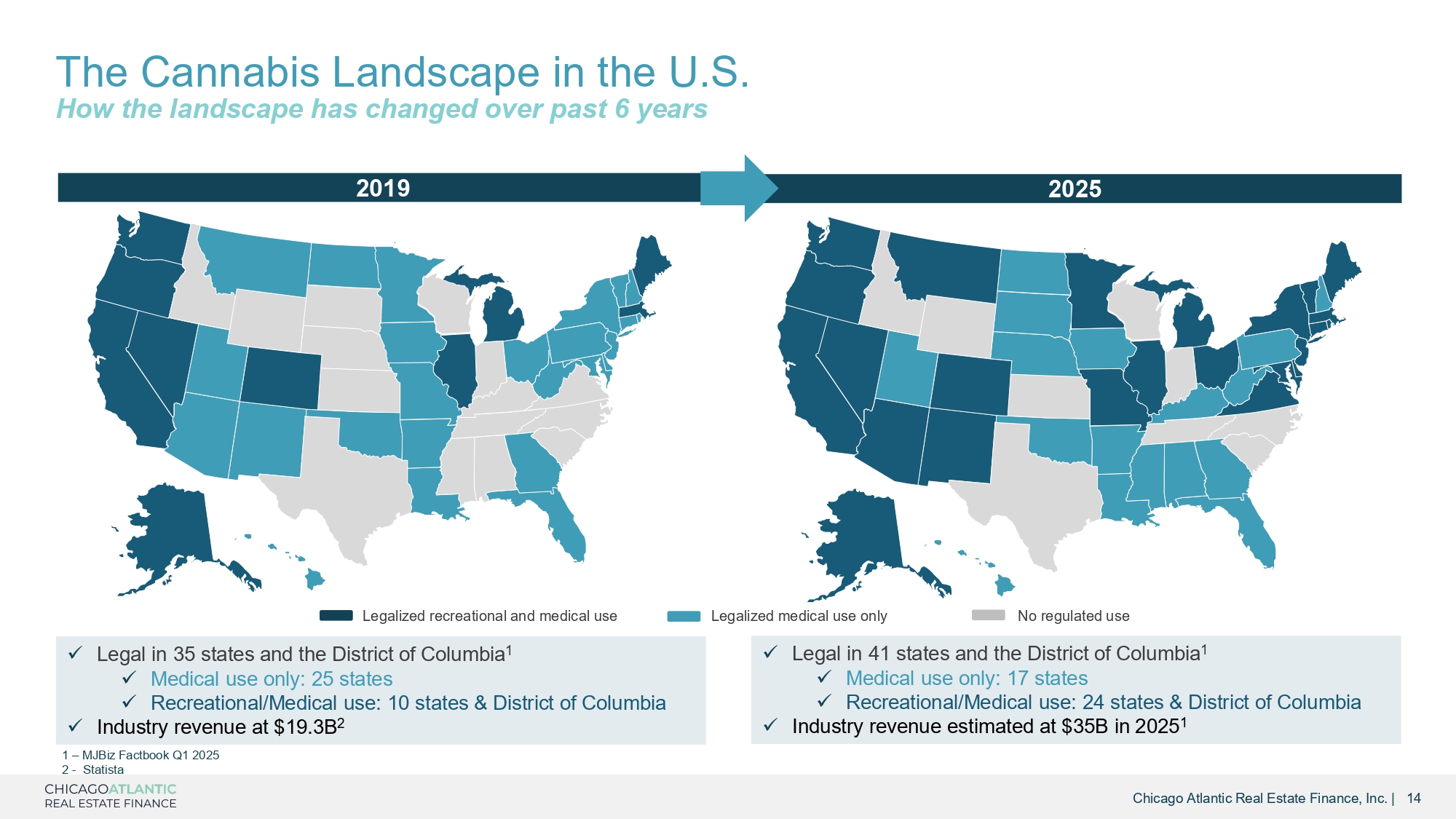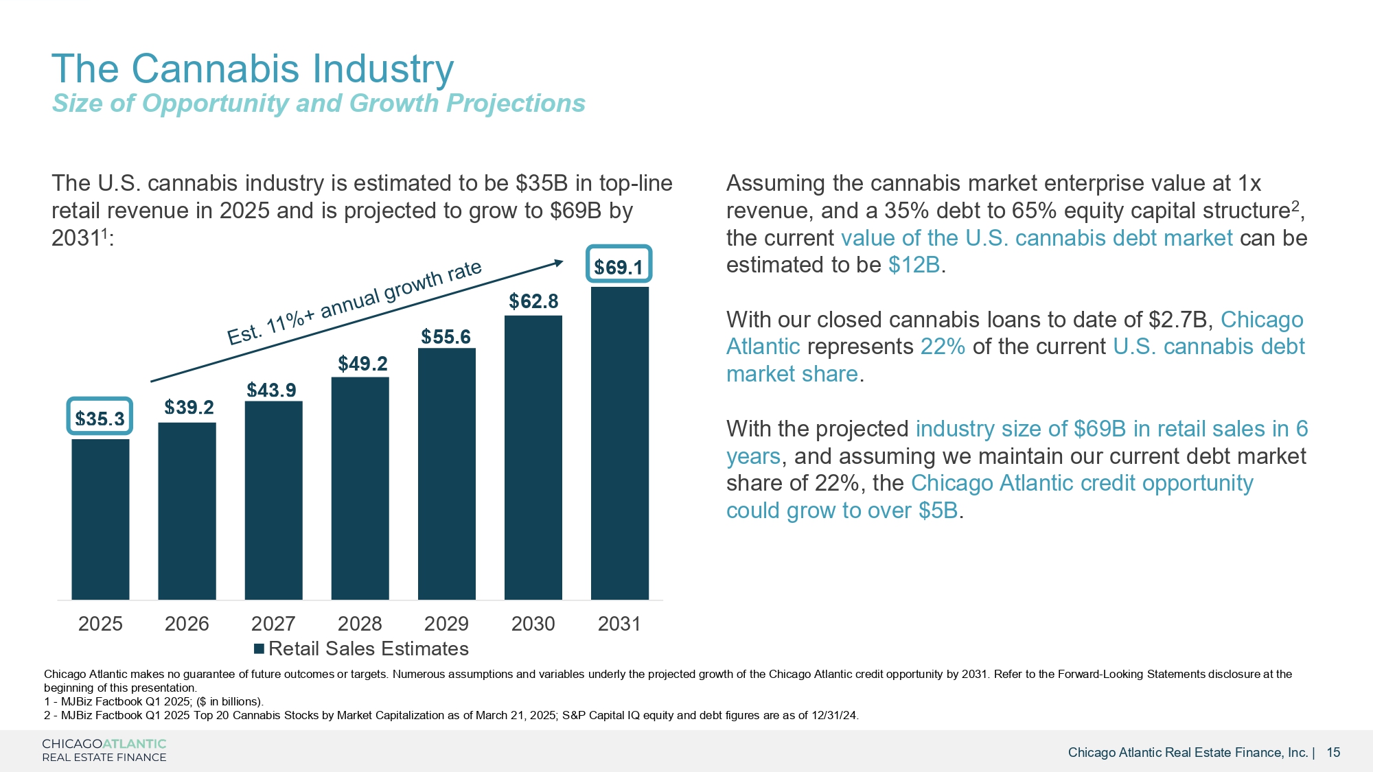 美国的大麻格局过去6年中景观发生了怎样的变化20192025 x 41个州和哥伦比亚特区的合法用途1 x仅医疗用途:17个州x娱乐/医疗用途:24个州和哥伦比亚特区x 2025年行业收入估计为35B美元1合法的娱乐和医疗用途合法的医疗用途仅无规范用途x 35个州的合法用途和哥伦比亚特区1 x仅医疗用途:25个州x娱乐/医疗用途:10个州和哥伦比亚特区x行业收入为$ 19.3B 21 – MJBiz Factbook 2025年第一季度2-Statista Chicago Atlantic Real Estate Finance, Inc. | 14