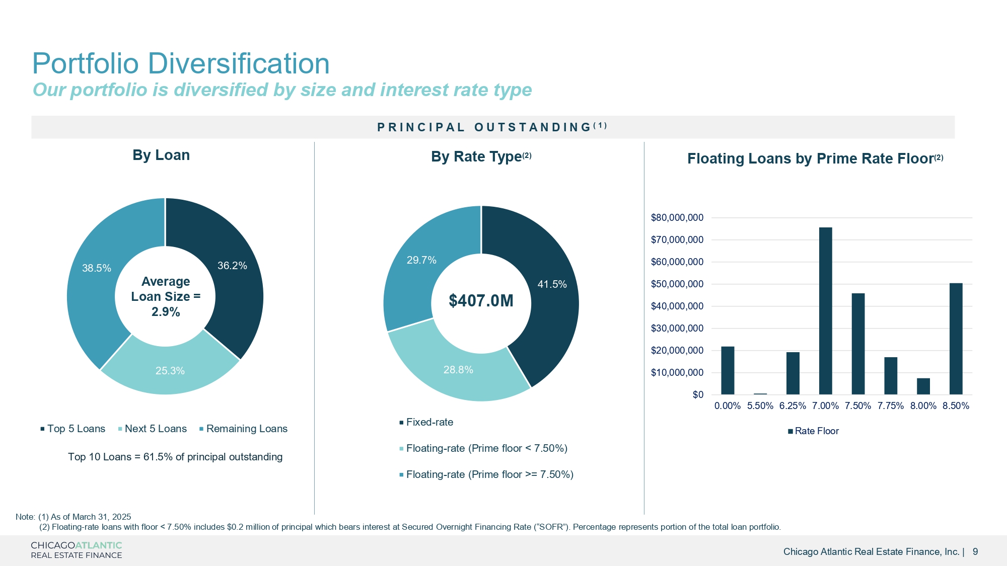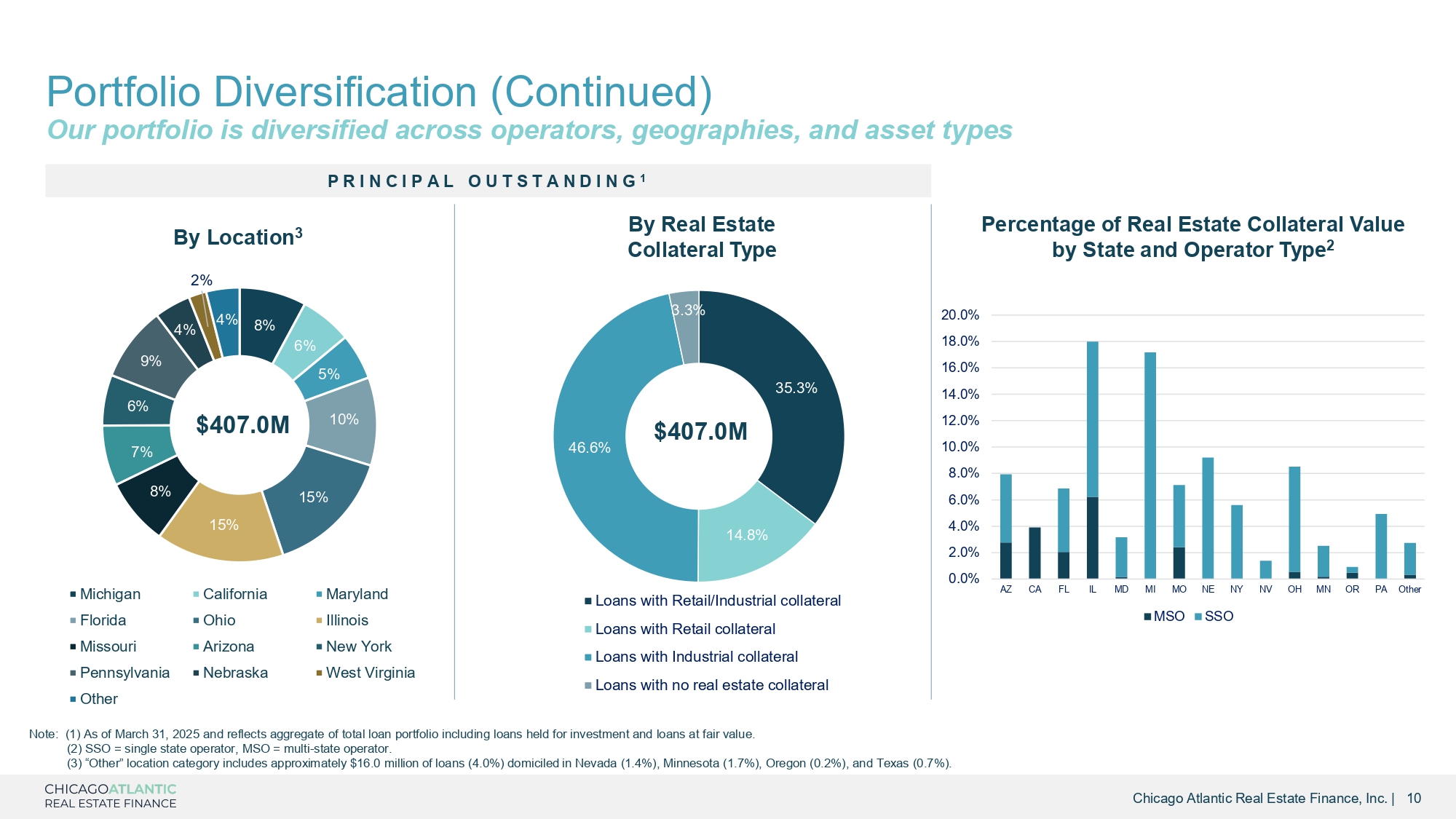 投资组合多样化我们的投资组合按规模和利率类型进行多样化P RI NCI P A L O UT S T A NDI NG(1)按贷款注:(1)截至2025年3月31日(2)下限< 7.50%的浮动利率贷款包括按有担保隔夜融资利率(“SOFR”)计息的0.2百万美元本金。百分比代表总贷款组合的一部分。36.2% 25.3% 38.5% Top 5 Loans Next 5 Loans Remaining Loans Top 10 Loans = 61.5% of Principal Outstanding Average Loan Size = 2.9% 41.5% 28.8% 29.7% Fixed-rate floating-rate(Prime floor < 7.50%)Floating-rate(Prime floor > = 7.50%)by rate type(2)floating loans by prime rate floor(2)$ 00.00% 5.50% 6.25% 7.00% 7.50% 7.75% 8.00% 8.50% $ 10,000,000 $ 30,000,000 $ 20,000,000 $ 40,000,000 $ 50,000,000 $ 60,000,000 $ 80,000,000 $ 70,000,000 rate floor Chicago Atlantic Real Estate Finance, Inc. | 9 $ 407.0m
