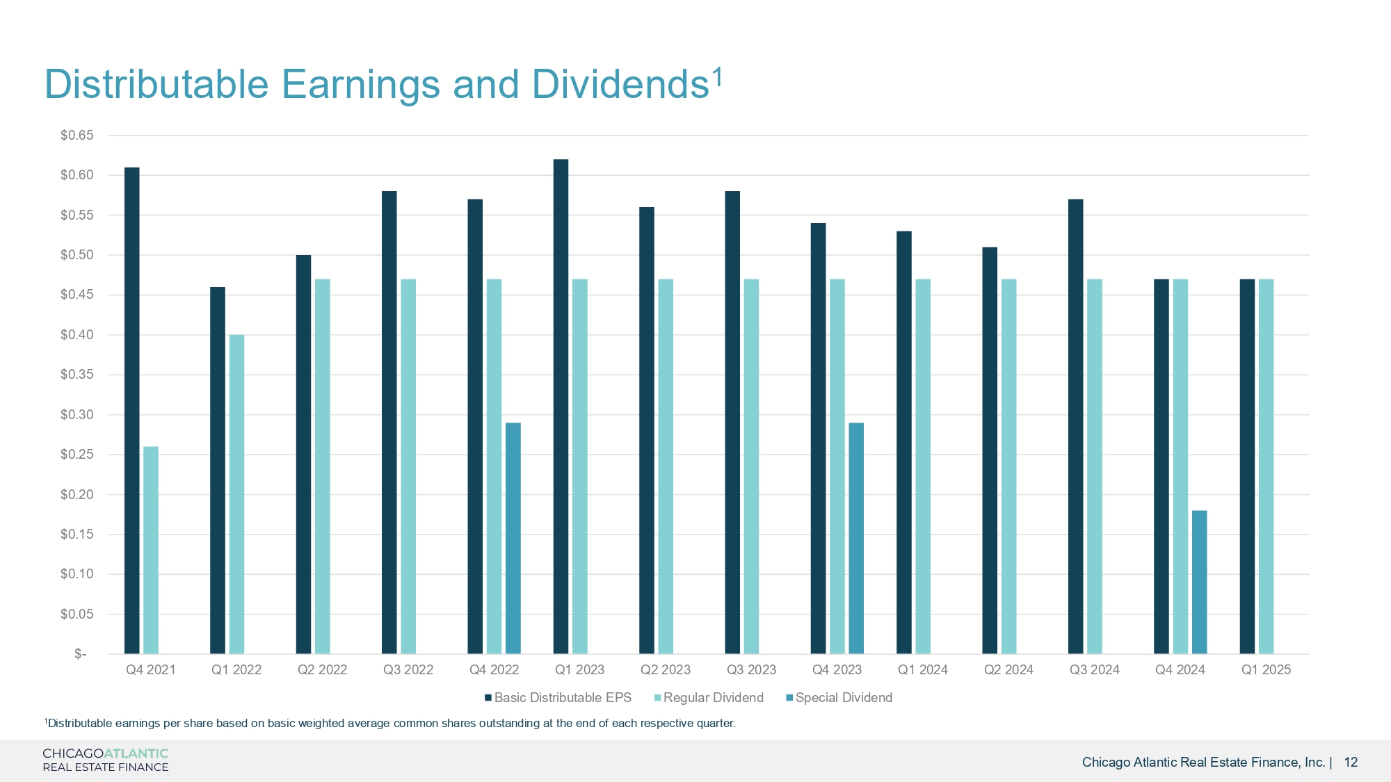 可分配收益和股息1 $ 0.65 $ 0.60 $ 0.55 $ 0.50 $ 0.45 $ 0.40 $ 0.35 $ 0.30 $ 0.25 $ 0.20 $ 0.15 $ 0.10 $ 0.05 $-Q4 2021 Q1 2022 Q2 2022 Q3 2022 Q4 2023 Q2 2023 Q3 2023 Q4 2023特别股息Q1 2024 Q2 2024 Q3 2024 Q4 2024 Q1 2025基本可分配每股收益定期股息1可分配每股收益,基于各季度末已发行在外的基本加权平均普通股。Chicago Atlantic Real Estate Finance, Inc. | 12