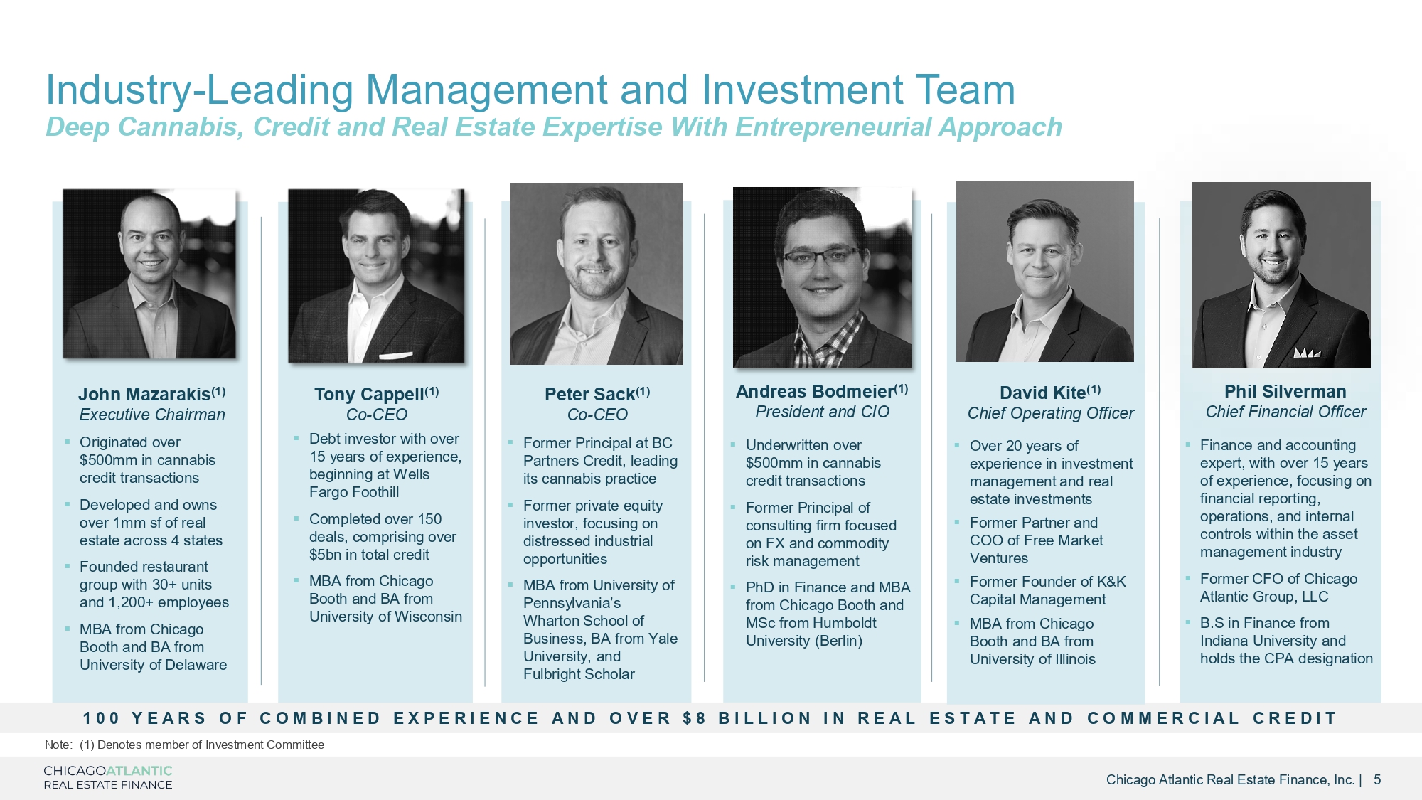 ▪商业抵押房地产投资信托基金和机构贷款给大麻行业的国家许可运营商。▪管理由借款人、地域和资产类型组成的多元化投资组合,具有强大的房地产抵押品覆盖率和贷款与企业价值比率。▪旨在通过持续的股息和资本增值,为股东提供风险调整后的总回报。▪作为牵头或共同牵头安排人,以及其专有采购网络和直接发起团队,可以访问Chicago Atlantic领先的大麻借贷平台▪经验丰富且强大的发起团队自2019年成立以来负责采购和关闭超过27亿美元的信贷额度,其中21亿美元提供给了大麻经营者。Chicago Atlantic Real Estate Finance, Inc. | 4 Chicago AtlanticReal Estate Finance Company Overview~$ 462mm的近期评估中管道(2)自平台成立以来关闭的贷款$ 2.7B +(1)跨平台关闭的95 +大麻贷款(1)$ 407.0mm的未偿贷款本金(3)16.9%的总投资组合收益率(3)当前投资组合中1.1倍的房地产抵押品覆盖率(3)注:(1)截至2025年3月31日,代表我们的保荐人(“Chicago AtlanticGroup,LP”)及其关联公司完成的交易。(2)截至2025年3月31日,包括潜在的辛迪加,并代表跨Chicago Atlantic平台的大麻来源。(3)截至2025年3月31日,代表贷款组合总额。