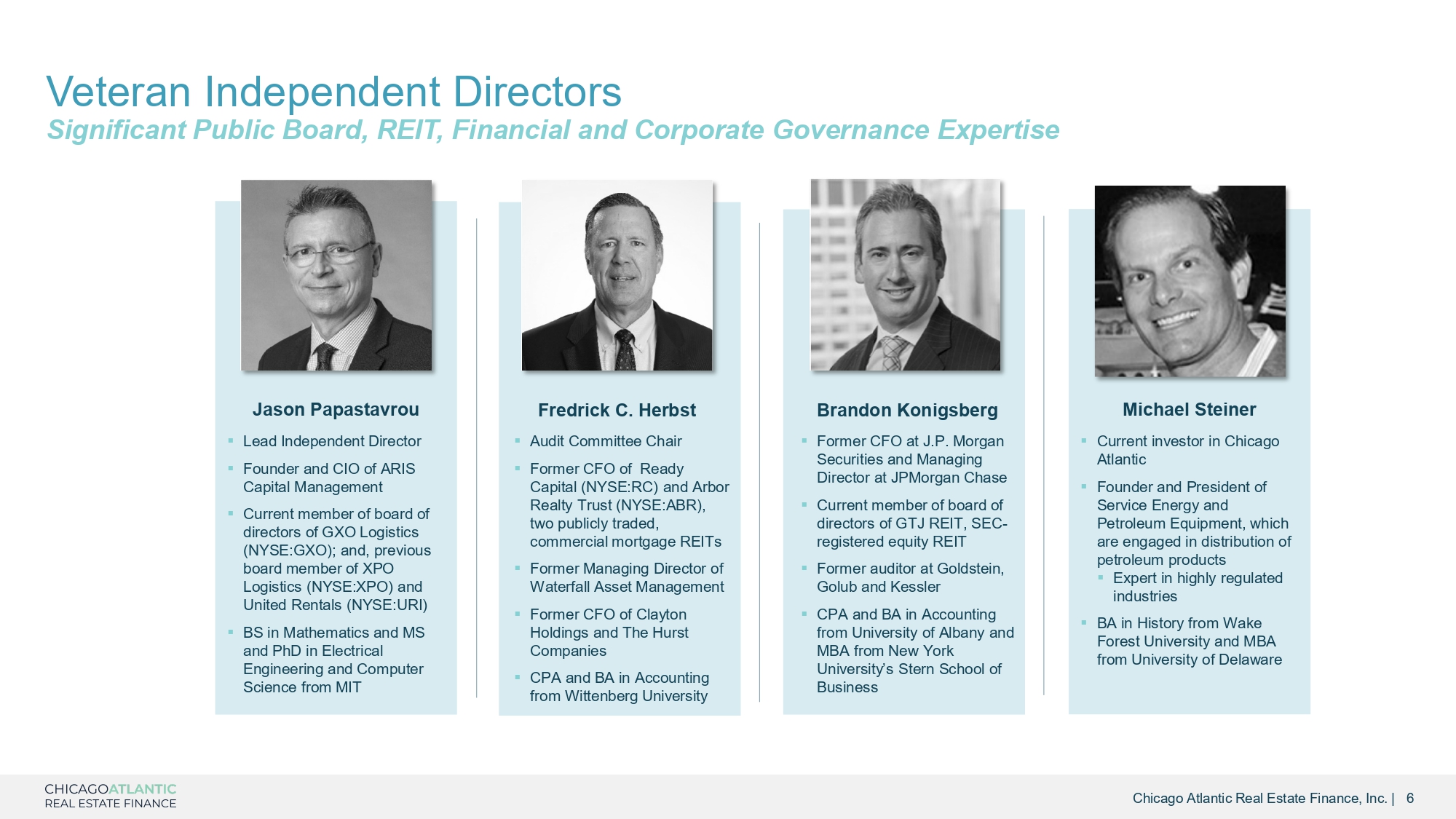 行业-领先的管理和投资团队以创业方法深入研究大麻、信贷和房地产专业知识Peter Sack(1)Co-CEO▪BC Partners Credit前负责人,领导其大麻业务▪前私募股权投资人,关注困境产业机会▪宾夕法尼亚大学沃顿商学院MBA、耶鲁大学学士、富布赖特学者▪财务会计专家,超15年从业经验,专注于资产管理行业内财务报告、运营、内部控制▪曾任Chicago Atlantic集团首席财务官,有限责任公司▪印第安纳大学金融学学士学位,拥有注册会计师职称Andreas Bodmeier(1)总裁兼首席信息官▪承销了超过500mm的大麻信贷交易▪专注于外汇和大宗商品风险管理的咨询公司前负责人▪芝加哥布斯金融博士、MBA,洪堡大学(柏林)理学硕士John Mazarakis(1)执行主席▪起源于超过500mm美元的大麻信贷交易▪开发并在4个州拥有超过1mm sF的房地产▪成立餐饮集团,30 +家单位,1200 +员工▪芝加哥MBA展位以及特拉华大学Tony Cappell(1)Co-CEO的学士学位▪超15年经验债权投资者,起步于富国银行山麓▪完成超150笔交易,包括超过50亿美元的总信贷▪Chicago Booth MBA和University of Wisconsin 100 MBA,YEA R S O F C O M B I N ED EXPER I EN C E A N D O VER $ 8 B I L L I O N I N R EA L EST A T E A ND CO M M E RCI A L CRE DI T注:(1)表示投资委员会成员David Kite(1)首席运营官▪超20年投资管理经验和房地产投资▪Free Market Ventures前合伙人兼首席运营官▪K & K Capital Management前创始人▪Chicago Booth MBA和伊利诺伊大学Phil Silverman BA 首席财务官Chicago Atlantic Real Estate Finance, Inc. Real Estate Finance,Inc. | 5