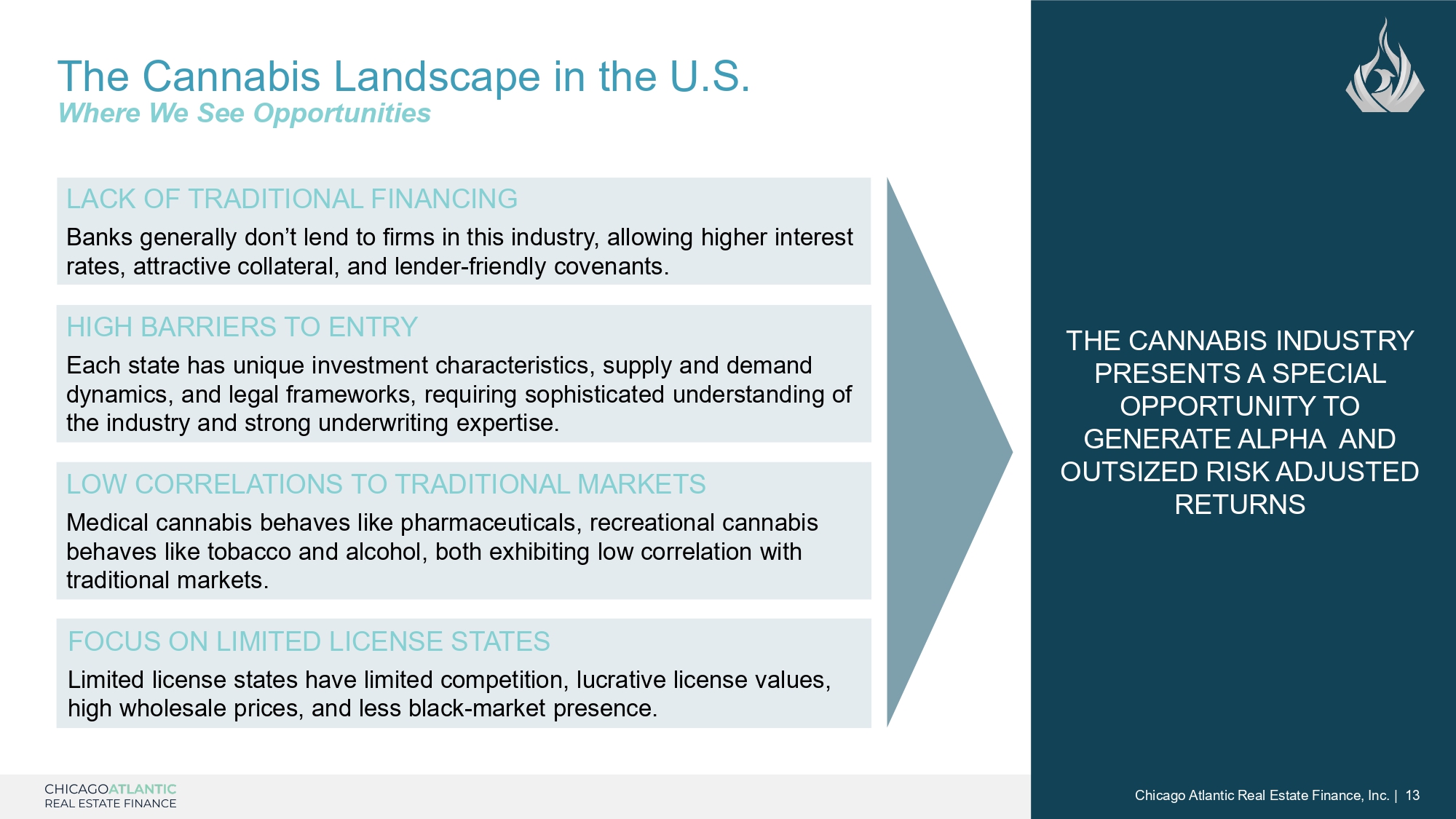 市场和行业数据在本演示文稿中,公司依赖并参考了从其认为可靠的第三方来源获得的某些信息和统计数据,包括市场研究公司的报告。公司未对任何此类第三方信息的准确性或完整性进行独立验证。由于大麻行业相对较新且发展迅速,此类市场和行业数据可能会在较短时间内发生重大变化。重要通知本次演示文稿由Chicago Atlantic Real Estate Finance, Inc.(“REFI”或“公司”)一家上市公司进行,该公司已选择作为REIT就联邦所得税目的征税。本演示文稿仅供参考,并非出售任何证券或工具的要约或购买要约的招揽。REFI不是注册投资顾问,由Chicago Atlantic REIT Manager,LLC(我们的“管理人”)管理。本演示不是我们的管理人的沟通,也不是为了维护任何现有客户或投资者或招揽新客户或管理人的投资者而设计的。我们定期在我们的网站REFI.REIT上为投资者发布重要信息。我们打算将该网页用作披露重大信息的手段,以遵守我们在FD条例下的披露义务,并定期发布和更新投资者介绍和类似材料。REFI鼓励投资者、分析师、媒体和其他对REFI感兴趣的人关注我们网站的投资者关系部分,此外还可以关注我们不定期在我们网站上发布的新闻稿、SEC文件、公开电话会议、演示文稿、网络广播和其他信息。过去的表现并不能保证未来的结果。无法保证此处引用的任何投资策略在所有市场条件下都能奏效。您独自承担评估与此处提及的任何潜在投资或投资策略相关的优点和风险的责任。此处包含的信息无意提供,也不应被依赖于为REFI或其任何关联公司提供会计、法律或税务建议或投资建议。非GAAP财务指标本演示文稿包括某些非GAAP财务指标,包括可分配收益,以评估我们的业绩,不包括某些交易和某些GAAP调整的影响,我们认为这些调整不一定表明我们当前的贷款活动和运营。我们认为,非GAAP财务指标对管理层、投资者、分析师和其他感兴趣的各方评估我们的业绩很有用,但不应孤立地看待,也不能替代根据GAAP计算的财务指标。我们将可分配收益定义为,在特定时期内,根据公认会计原则计算的净收入(亏损),不包括(i)非现金股权补偿费用,(ii)折旧和摊销,(iii)任何未实现的收益、亏损或其他非现金项目记录在该期间的净收入(亏损)中,无论这些项目是否计入其他综合收益或亏损,或净收益(亏损);但可分配收益不排除,在具有递延利息特征的投资(如OID、具有PIK利息的债务工具和零息证券)的情况下,我们尚未以现金形式收到的应计收入,(iv)当前预期信用损失准备金和(v)根据GAAP变化和某些非现金费用的一次性事件,在每种情况下,均经过我们的管理人与我们的独立董事讨论并经此类独立董事的多数批准。我们认为,在根据公认会计原则确定的净收入的补充基础上提供可分配收益有助于股东评估我们业务的整体表现。作为REIT,我们被要求分配至少90%的年度REIT应税收入,并按常规公司税率纳税,只要我们每年分配的此类应税收入低于100%。鉴于这些要求以及我们认为股息通常是股东投资于我们普通股的主要原因之一,我们通常打算在董事会授权的情况下,尝试向我们的股东支付相当于我们的净应税收入的股息。可分配收益是我们的董事会在授权股息时考虑的众多因素之一,虽然不是直接衡量净应税收入的指标,但随着时间的推移,该指标可以被视为衡量我们股息的有用指标。Chicago Atlantic Real Estate Finance, Inc. | 3条重要披露信息