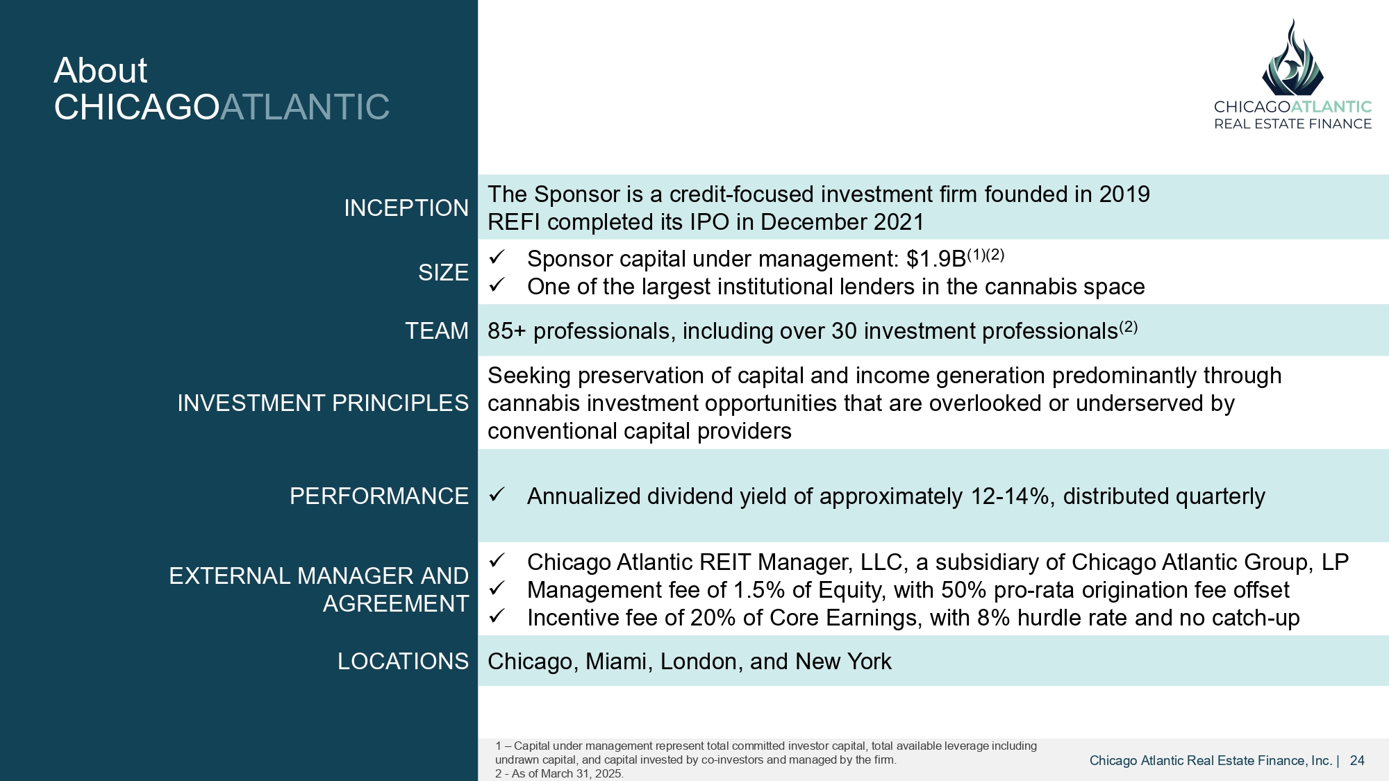关于CHICAGO ATLANTIC保荐人是一家专注于信贷的投资公司,成立于2019年,REFI于2021年12月完成首次公开募股,成立时间x Sponsor capital under management:$ 1.9b(1)(2)x大麻领域最大的机构贷方之一,规模85 +专业人士,其中包括30多名投资专业人士(2)团队主要通过被传统资本提供者投资原则所忽视或服务不足的大麻投资机会寻求资本保全和创收x年化股息收益率约为12-14 %,季度业绩分布x丨芝加哥大西洋丨Chicago Atlantic REIT Manager,LLC,Chicago Atlantic Group的子公司,LP x 1.5%的股权的管理费,50%的发起费用按比例抵消x核心收益20%的激励费用,8%的门槛率和没有追赶的外部经理和协议芝加哥、迈阿密、伦敦和纽约地点1 –管理的资本代表承诺投资者资本总额、包括未提取资本在内的总可用杠杆以及共同投资者投资并由公司管理的资本。2-截至2025年3月31日。Chicago Atlantic Real Estate Finance, Inc. | 24