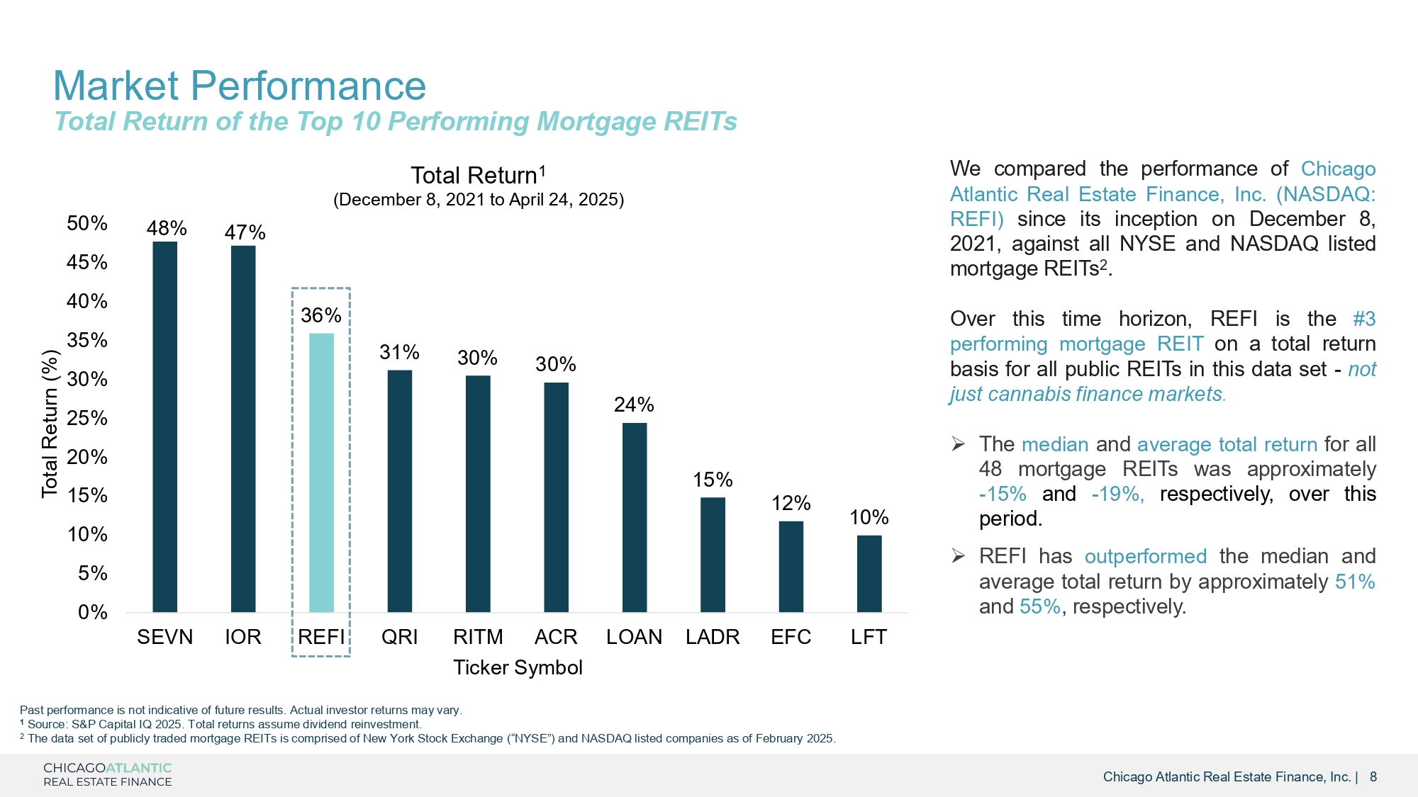 市场表现前10名表现最佳的抵押贷款REITs总回报率31% 30% 30% 24% 15% 12% 10% 36% REFIChicago Atlantic Real Estate Finance, Inc.,Inc. Chicago Atlantic Real Estate Finance, Inc. | 848% 47% 50% 45% 40% 35% 30% 25% 20% 15% 10% 5% 0%贷款LADREFCLFT QRI RITM ACR股票代码总回报(%)总回报1(2021年12月8日至2025年4月24日)我们将TERM7,Inc.(NASDAQ:REFI)自2021年12月8日成立以来的表现与所有在NYSE和NASDAQ上市的抵押贷款REITs 2进行了对比。在这段时间内,在这一数据集中的所有公共REITs中——不仅仅是大麻金融市场——的总回报率基础上,REFI是排名第三的表现抵押房地产投资信托基金。»在此期间,所有48只抵押REITs的中位数和平均总回报率分别约为-15 %和-19 %。» REFI的总回报率分别比中位数和平均水平高出约51%和55%。过去的表现并不代表未来的结果。实际投资者回报可能会有所不同。1资料来源:标普 Capital IQ2025。总回报假设股息再投资。2公开交易的抵押REITs数据集由截至2025年2月的纽约证券交易所(“NYSE”)和纳斯达克上市公司组成。