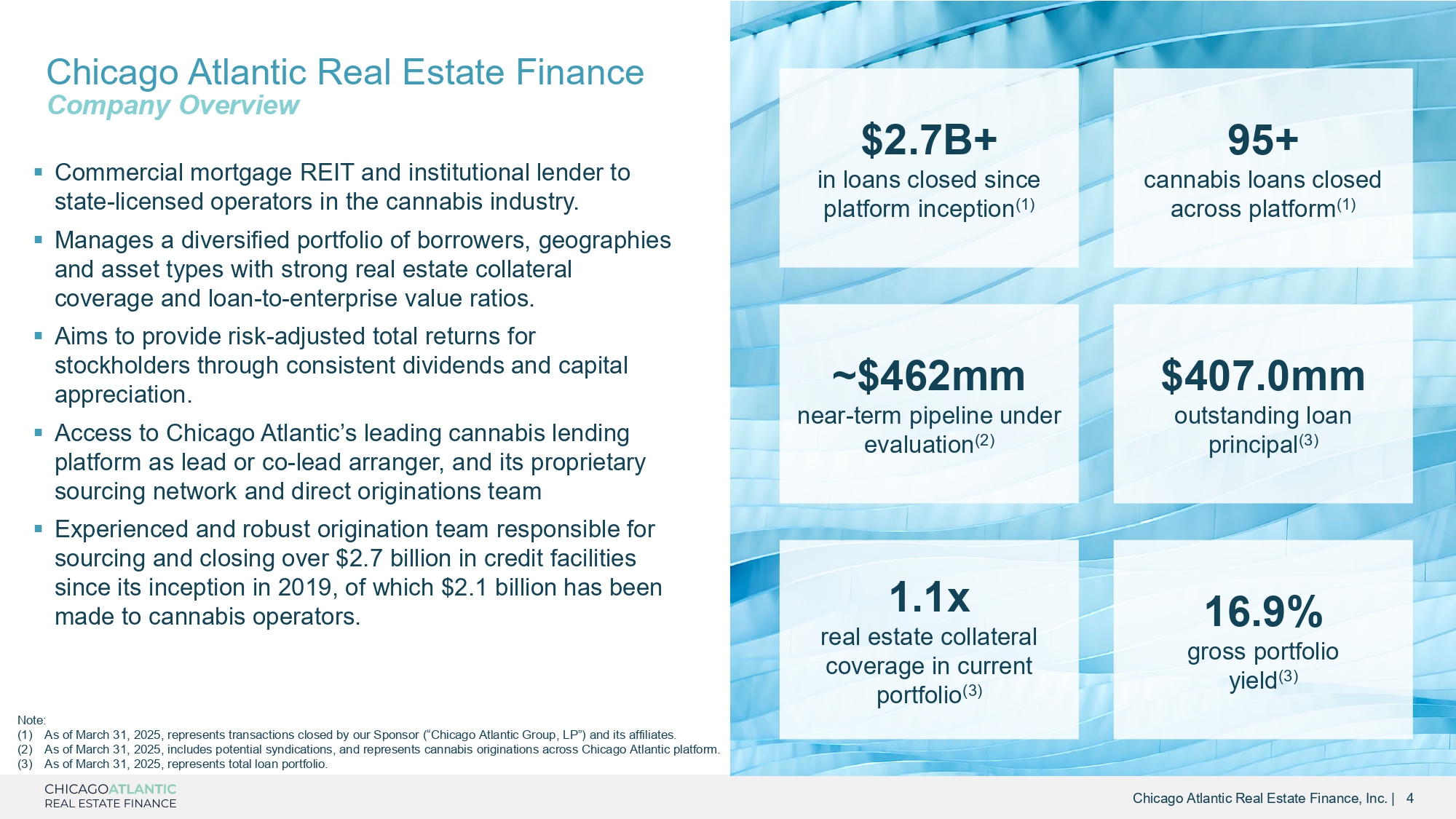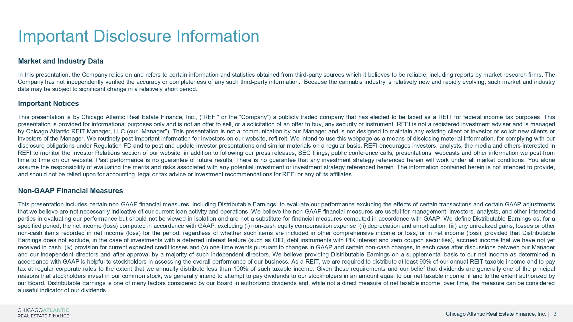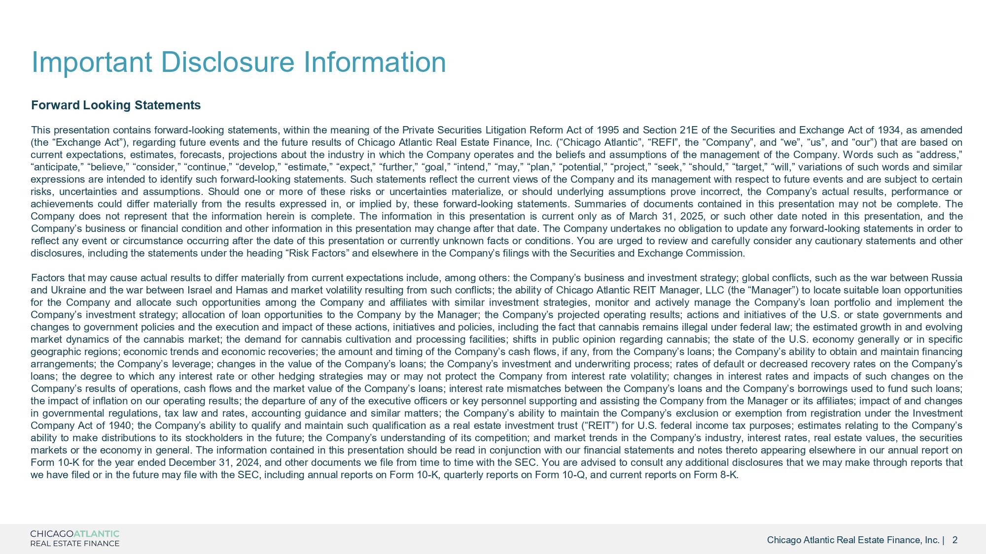 前瞻性陈述本演示文稿包含前瞻性陈述,在1995年《私人证券诉讼改革法案》和经修订的1934年《证券交易法》第21E条(“交易法”)的含义内,关于Chicago Atlantic Real Estate Finance, Inc.(“Chicago Atlantic”、“REFI”、“公司”以及“我们”、“我们”和“我们的”)的未来事件和未来结果,这些前瞻性陈述基于对公司经营所在行业的当前预期、估计、预测、预测以及公司管理层的信念和假设。“地址”、“预期”、“相信”、“考虑”、“继续”、“发展”、“估计”、“预期”、“进一步”、“目标”、“打算”、“可能”、“计划”、“潜力”、“项目”、“寻求”、“应该”、“目标”、“将”等词语的变体和类似表达旨在识别此类前瞻性陈述。此类陈述反映了公司及其管理层目前对未来事件的看法,并受到某些风险、不确定性和假设的影响。如果这些风险或不确定性中的一项或多项成为现实,或者基础假设被证明不正确,公司的实际结果、业绩或成就可能与这些前瞻性陈述中表达或暗示的结果存在重大差异。本演示文稿中包含的文件摘要可能不完整。本公司不代表此处的信息是完整的。本演示文稿中的信息仅截至2025年3月31日,或本演示文稿中注明的其他日期,本演示文稿中的公司业务或财务状况及其他信息可能会在该日期之后发生变化。公司不承担更新任何前瞻性陈述以反映本演示文稿日期之后发生的任何事件或情况或目前未知的事实或条件的义务。我们敦促您审查并仔细考虑任何警示性声明和其他披露,包括公司向美国证券交易委员会提交的文件中“风险因素”标题下的声明和其他地方的声明。可能导致实际业绩与当前预期存在重大差异的因素包括(其中包括):公司的业务和投资战略;全球冲突,例如俄罗斯和乌克兰之间的战争以及以色列和哈马斯之间的战争以及此类冲突导致的市场波动;Chicago Atlantic REIT Manager,LLC(“管理人”)为公司找到合适的贷款机会并在公司和具有类似投资策略的关联公司之间分配此类机会的能力,监测和积极管理公司的贷款组合,实施公司的投资战略;管理人向公司分配贷款机会;公司的预计经营业绩;美国或州政府的行动和倡议以及政府政策的变化以及这些行动、倡议和政策的执行和影响,包括根据联邦法律,大麻仍然是非法的;大麻市场的估计增长和不断变化的市场动态;对大麻种植和加工设施的需求;关于大麻的公众舆论的变化;美国经济的总体状况或特定地理区域的状况;经济趋势和经济复苏;公司现金流的数量和时间,如果有的话,来自公司的贷款;公司获得和维持融资安排的能力;公司的杠杆;公司贷款价值的变化;公司的投资和承销过程;公司贷款的违约率或回收率下降;任何利率或其他对冲策略可能会或可能不会保护公司免受利率波动的影响;利率的变化以及此类变化对公司经营业绩的影响,现金流和公司贷款的市场价值;公司贷款与公司用于为此类贷款提供资金的借款之间的利率不匹配;通货膨胀对我们经营业绩的影响;任何支持和协助公司的执行官或关键人员离开管理人或其关联公司;政府法规、税法和税率的影响和变化, 会计指导和类似事项;公司根据1940年《投资公司法》保持公司被排除或豁免注册的能力;公司为美国联邦所得税目的获得并保持房地产投资信托基金(“REIT”)资格的能力;与公司未来向其股东进行分配的能力有关的估计;公司对其竞争的理解;以及公司所处行业的市场趋势、利率、房地产价值、证券市场或总体经济。本演示文稿中包含的信息应与我们截至2024年12月31日止年度的10-K表格年度报告中其他地方出现的财务报表及其附注以及我们不时向SEC提交的其他文件一起阅读。建议您查阅我们可能通过我们已提交或未来可能向SEC提交的报告进行的任何额外披露,包括10-K表格的年度报告、10-Q表格的季度报告,以及表格8的当前报告-K。Chicago Atlantic Real Estate Finance, Inc. | 2重要披露信息