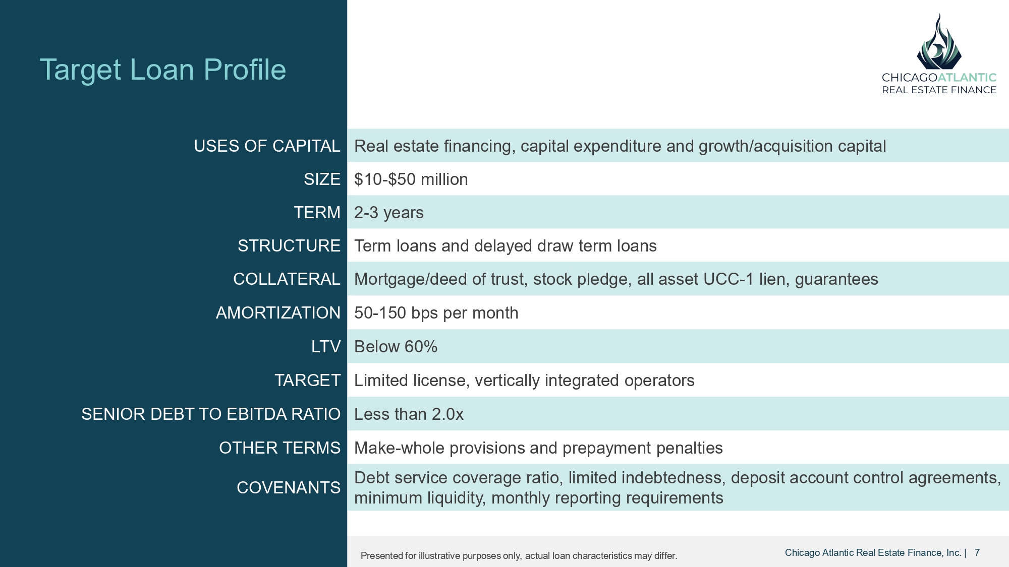 目标贷款简介Chicago Atlantic Real Estate Finance, Inc. | 7仅供说明之用,实际贷款特征可能有所不同。房地产融资、资本支出和增长/收购资本使用10至5000万美元规模2至3年定期贷款和延迟提取定期贷款结构抵押/信托契约、股票质押、全部资产UCC-1留置权,保证抵押品每月摊销低于60% LTV有限许可、垂直整合运营商目标低于2.0倍的优先债务与EBITDA比率-整笔准备金和提前还款罚款其他条款偿债覆盖率、有限债务、存款账户控制协议、最低流动性、月度报告要求契约