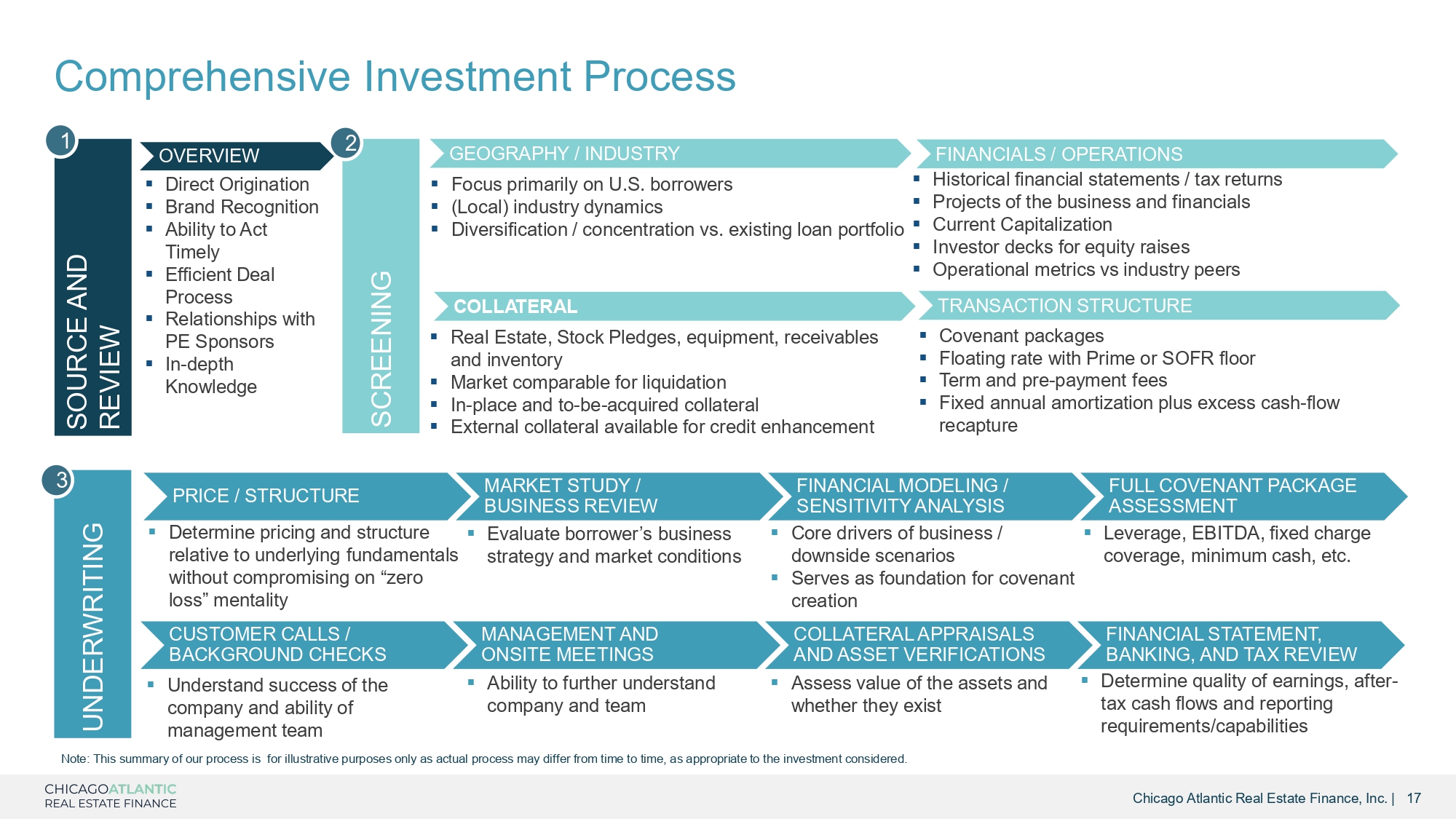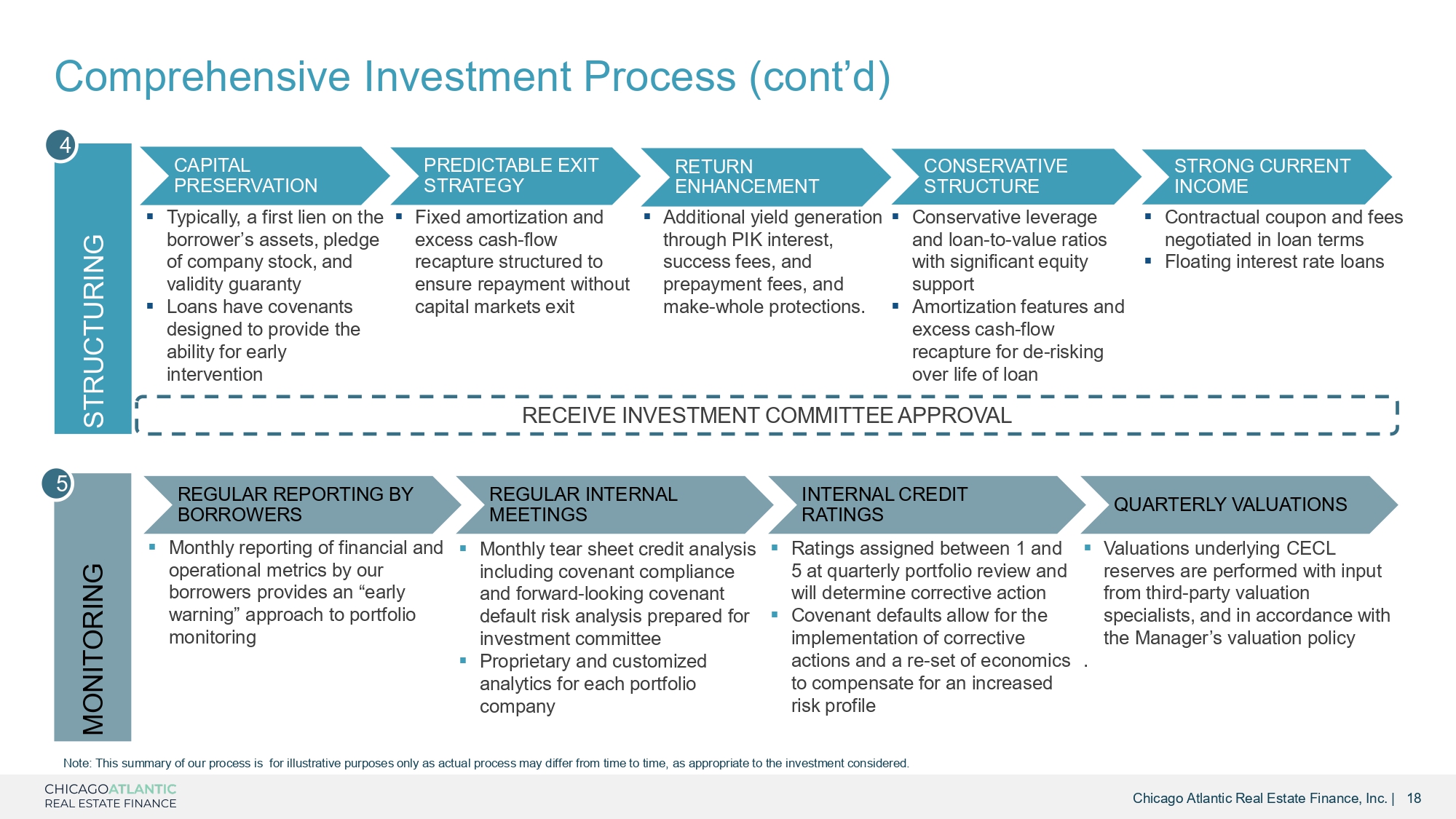 综合投资流程来源和审查1筛选2抵押品地理/行业▪主要关注美国借款人▪(本土)行业动态▪多元化/集中vs.现有贷款组合▪金融/运营▪历史财务报表/纳税申报表▪商业和财务的项目当前资本化▪股权融资的投资者套牌▪运营指标vs行业同行交易结构▪盟约包▪带Prime或SOFR底板的浮动费率▪期限和预付费费用▪固定的年度摊销加上超额现金流回收▪房地产、股票质押、设备、应收账款和存货▪清算的市场可比性▪已到位和即将获得的抵押品▪可用于增信承销的外部抵押品3市场研究/业务审查▪评估借款人的业务战略和市场状况完整的《公约》一揽子评估▪杠杆、EBITDA、固定费用覆盖率、最低现金等管理和现场会议▪进一步了解公司和团队财务建模/敏感性分析的Ability▪业务/下行情景的核心驱动因素▪作为立约抵押评估和资产核查的基础▪评估资产的价值以及是否存在概述▪直接起源▪品牌认知度▪及时采取行动的Ability▪高效的交易流程▪与PE保荐机构的关系▪深度知识价格/结构▪确定定价和结构相对于基本面不妥协“零损失”心态客户来电/背景调查▪了解企业的成功与管理团队的能力财务报表、银行、税务审查▪确定收益质量、税后现金流和报告要求/能力注:我们的流程摘要仅用于说明目的,因为实际流程可能不时有所不同,视所考虑的投资而定。Chicago Atlantic Real Estate Finance, Inc. | 17