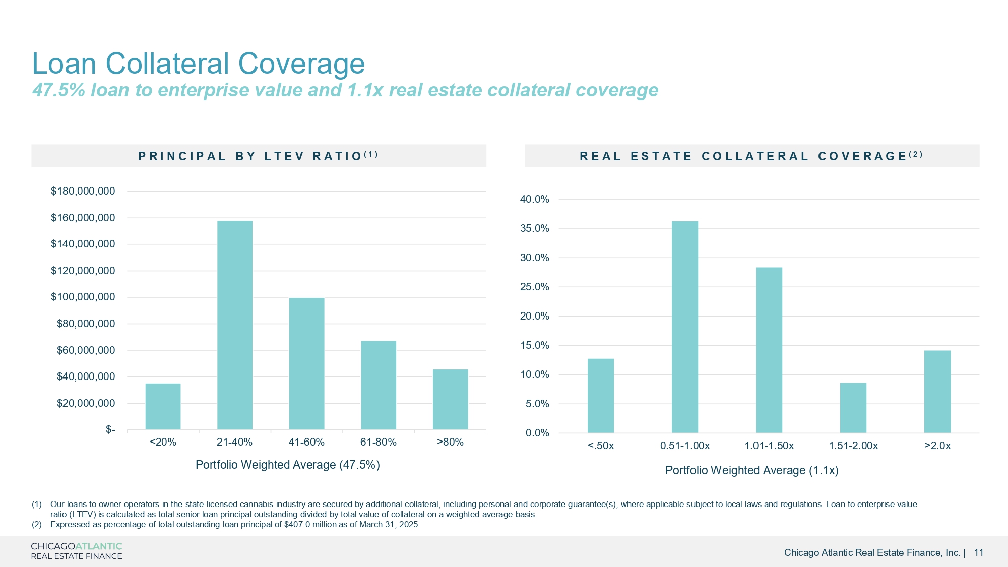 投资组合多元化(续)我们的投资组合在运营商、地区和资产类型上实现多元化P RI NCI P A L O UT S T A NDI NG 1注:(1)截至2025年3月31日,反映总贷款组合的总和,包括为投资而持有的贷款和按公允价值计算的贷款。(2)SSO =单态算子,MSO =多态算子。各州房地产抵押品价值百分比和经营者类型2 20.0% 18.0% 16.0% 14.0% 12.0% 10.0% 8.0% 6.0% 4.0% 2.0% 0.0% AZ 加利福尼亚州 FL或PA其他IL MD MI MO NE NY NV OH MN MSO SSO 35.3% 14.8% 46.6% 3.3%零售/工业抵押贷款贷款零售抵押贷款工业抵押贷款无房地产抵押贷款4.07亿美元房地产抵押类型8% 6% 5% 10% 15% 15% 8% 7% 6% 9% 4% 2% 4%密歇根佛罗里达密苏里宾夕法尼亚其他加州俄亥俄亚利桑那内布拉斯加州马里兰伊利诺斯州纽约西弗吉尼亚州4.07亿美元(3)“其他”地点类别包括约1600万美元的贷款(4.0%)注册地为内华达州(1.4%)、明尼苏达州(1.7%)、俄勒冈州(0.2%)、德克萨斯州(0.7%)。Chicago Atlantic Real Estate Finance, Inc. | 10按地点3
