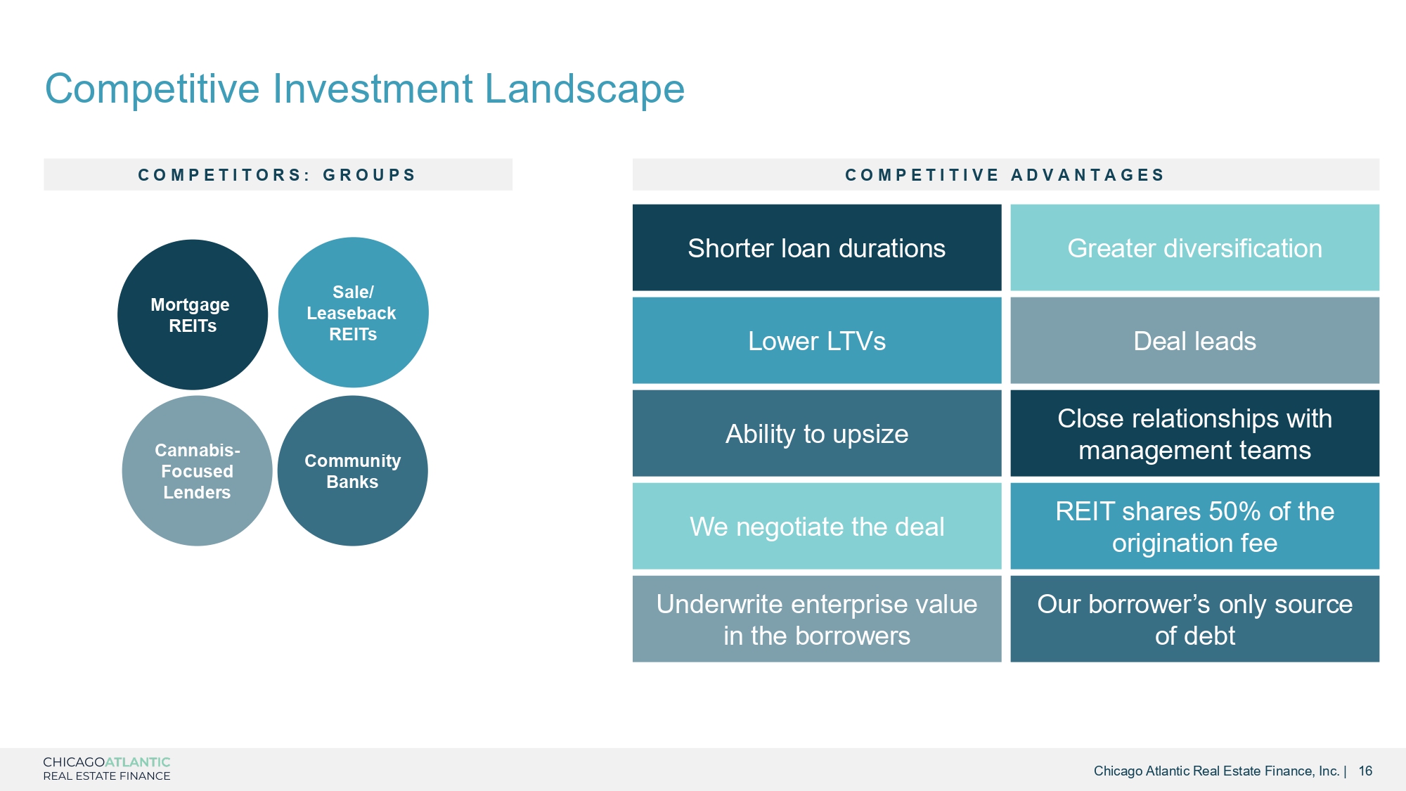 2025202620272028202920302031零售销售估计数Chicago Atlantic不保证未来的结果或目标。到2031年,Chicago Atlantic信贷机会的预计增长有许多假设和变量。请参阅本演示文稿开头的前瞻性陈述披露。1-MJBiz Factbook Q1 2025;(十亿美元)。2-MJBiz Factbook截至2025年3月21日按市值排名的2025年第一季度大麻股票前20名;标普 Capital IQ股权和债务数据截至12/31/24。$ 35.3 $ 39.2 $ 43.9 $ 49.2 $ 55.6 $ 62.8美国大麻行业预计2025年顶线零售收入为$ 35B,预计到2031年将增长到$ 69B 1:$ 69.1大麻行业规模机会和增长预测假设大麻市场企业价值为1倍收入,以及35%的债务到65%的股权资本结构2,美国大麻债务市场的当前价值可估计为$ 12B。迄今为止,我们已关闭的大麻贷款为2美元。7b,Chicago Atlantic占目前美国大麻债务市场份额的22%。预计6年后零售额的行业规模为$ 69B,并假设我们维持目前22%的债务市场份额,则Chicago Atlantic的信贷机会可能会增长到超过$ 5B。Chicago Atlantic Real Estate Finance, Inc. | 15