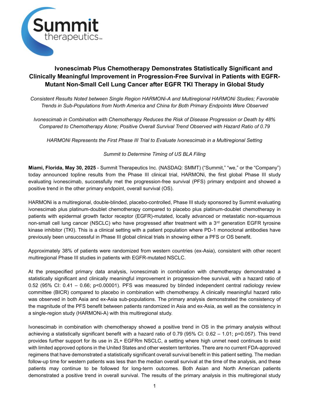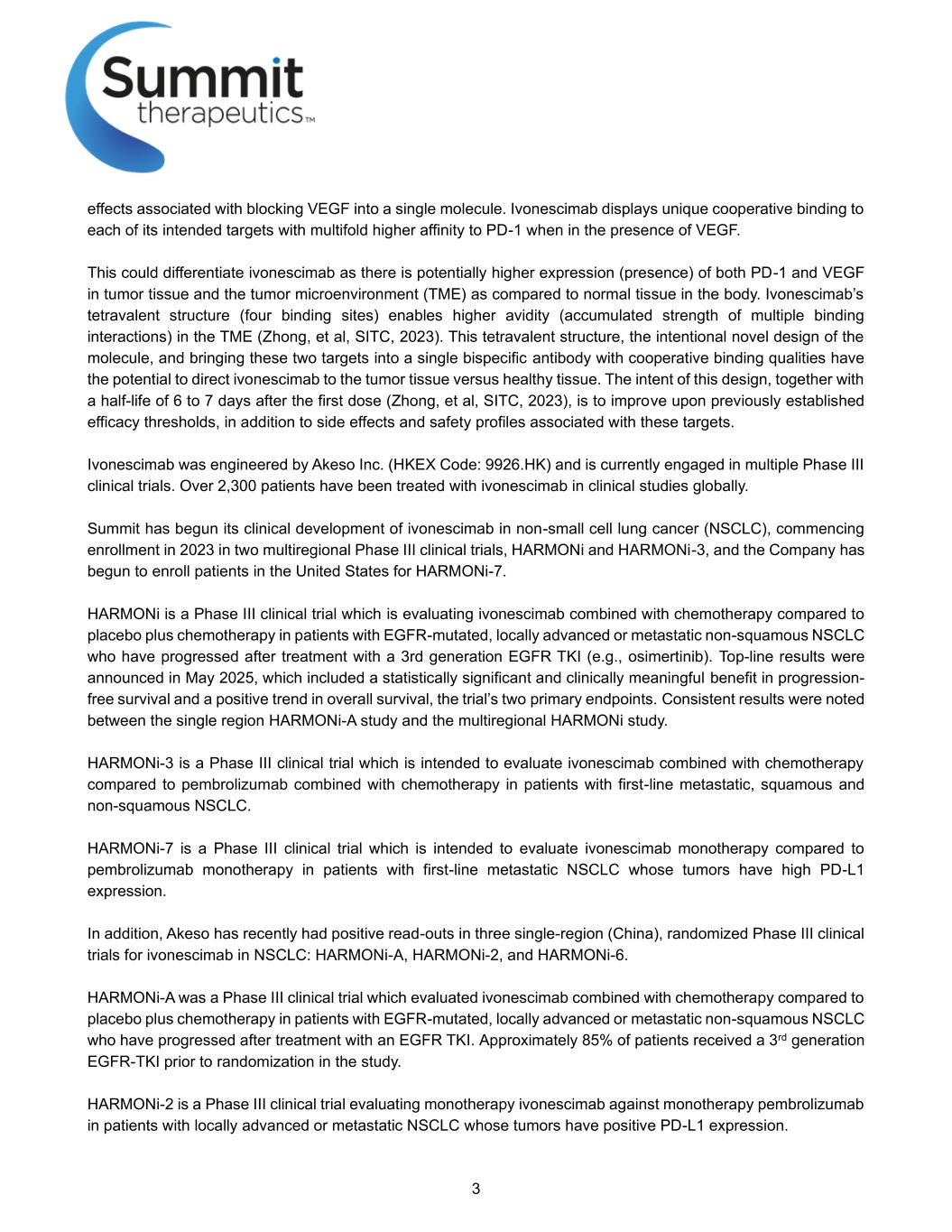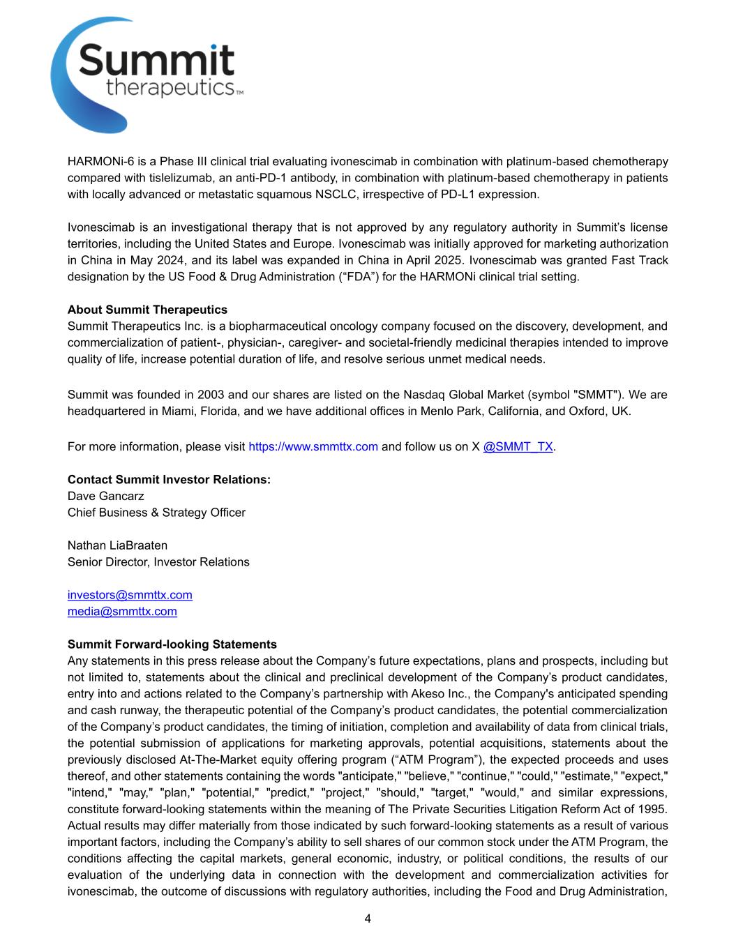 4 HARMONi-6是一项III期临床试验,评估ivonescimab联合铂类化疗与抗PD-1抗体替雷利珠单抗联合铂类化疗在局部晚期或转移性鳞状NSCLC患者中的疗效,无论PD-L1表达如何。Ivonescimab是一种研究性疗法,未获得Summit许可地区任何监管机构的批准,包括美国和欧洲。伊沃奈西单抗最初于2024年5月在中国获批上市许可,并于2025年4月在中国扩标。伊沃奈西单抗获得美国食品药品监督管理局(“FDA”)授予的HarMONI临床试验设置快速通道指定。关于Summit TherapeuticsSummit Therapeutics公司是一家生物制药肿瘤学公司,专注于发现、开发和商业化对患者、医生、护理人员和社会友好的药物疗法,旨在提高生活质量、增加潜在的生命持续时间并解决严重的未满足的医疗需求。Summit成立于2003年,我们的股票在纳斯达克全球市场上市(代码“SMMT”)。我们的总部设在佛罗里达州迈阿密,并在加利福尼亚州门洛帕克和英国牛津增设了办事处。欲了解更多信息,请访问https://www.smmttx.com,关注我们X @SMMT _ TX。联系峰会投资者关系:Dave Gancarz首席业务和战略官Nathan LiaBraaten投资者关系高级总监Investors@smmttx.com media@smmttx.com峰会前瞻性声明本新闻稿中关于公司未来预期、计划和前景的任何声明,包括但不限于关于公司候选产品的临床和临床前开发、与公司与Akeso Inc.的合作关系相关的进入和行动的声明、公司预期的支出和现金跑道、公司候选产品的治疗潜力、公司候选产品的潜在商业化、启动时间,临床试验数据的完成和可用性、可能提交的上市批准申请、潜在的收购、关于先前披露的市场上股票发行计划(“ATM计划”)、预期收益和用途的陈述,以及包含“预期”、“相信”、“继续”、“可能”、“估计”、“预期”、“打算”、“可能”、“计划”、“潜力”、“预测”、“项目”、“应该”、“目标”、“将”等词语的其他陈述,构成1995年《私人证券诉讼改革法案》含义内的前瞻性陈述。由于各种重要因素,实际结果可能与此类前瞻性陈述所表明的结果存在重大差异,包括公司根据ATM计划出售我们普通股的能力、影响资本市场的条件、总体经济、行业或政治状况、我们对与ivonescimab的开发和商业化活动相关的基础数据的评估结果、与包括食品和药物管理局在内的监管机构的讨论结果,