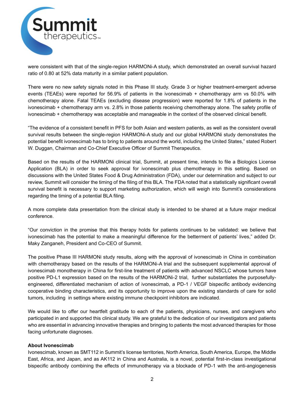2例与单区HARMONi-A研究一致,该研究表明在相似的患者群体中,在52%的数据成熟度下,总生存风险比为0.80。这项III期研究没有发现新的安全信号。ivonescimab +化疗组56.9%的患者报告了3级或更高级别的治疗紧急不良事件(TEAEs),而单独化疗的患者为50.0%。据报道,在ivonescimab +化疗组中,有1.8%的患者出现了致命的TEAEs(不包括疾病进展),而在那些仅接受化疗的患者中,这一比例为2.8%。在观察到的临床获益情况下,ivonescimab +化疗的安全性特征是可以接受和可管理的。“亚洲和西方患者在PFS方面持续获益的证据,以及单区HarMONI-A研究和我们的全球HarMONI研究之间持续的总生存期结果,证明了ivonescimab必须为包括美国在内的世界各地的患者带来潜在益处,”Summit Therapeutics董事长兼联席首席执行官Robert W. Duggan表示。基于HARMONI临床试验的结果,Summit,目前打算提交生物制品许可申请(BLA),以便在这种情况下寻求批准ivonescimab加化疗。基于与美国食品药品监督管理局(FDA)的讨论,在我们的确定下并受我们的审查,Summit将考虑提交本次BLA的时间安排。FDA指出,支持上市许可需要统计上显着的总体生存获益,这将影响Summit对潜在BLA申请时间的考虑。来自临床研究的更完整的数据介绍打算在未来的重大医学会议上分享。Summit总裁兼联合首席执行官Maky Zanganeh博士补充道:“我们对这种疗法对患者的承诺的信念继续得到验证:我们相信ivonescimab有可能为改善患者的生活带来有意义的改变。”阳性的III期harmoni研究结果,随着基于harmoni-A试验结果的ivonescimab联合化疗在中国的批准以及随后基于Harmoni-2试验结果的ivonescimab单药疗法在中国的补充批准用于肿瘤PD-L1表达阳性的晚期NSCLC患者的一线治疗,进一步证实了ivonescimab这一PD-1/VEGF双特异性抗体的有目的的、差异化的作用机制,以及其在现有实体瘤护理标准基础上改进的机会,包括在提示现有免疫检查点抑制剂的环境中。我们要向参与和支持本次临床研究的每一位患者、医师、护士、护理人员表示衷心的感谢。我们感谢我们的研究人员和患者的奉献精神,他们对于推进创新疗法并为那些面临不幸诊断的人带来最先进的疗法至关重要。关于ivonescimab ivonescimab,在Summit的许可地区、北美、南美、欧洲、中东、非洲和日本被称为SMT112,在中国和澳大利亚被称为AK112,是一种新型的、潜在的first-in-class在研双特异性抗体,通过阻断PD-1将免疫疗法的效果与抗血管生成相结合