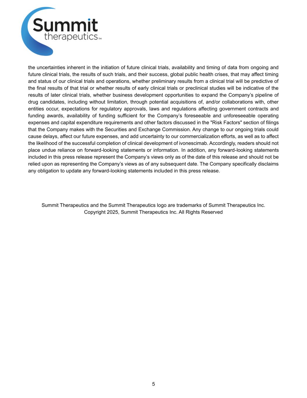 5可能影响我们临床试验和运营的时间和状态的未来临床试验的启动、正在进行和未来临床试验数据的可用性和时间、此类试验的结果及其成功、全球公共卫生危机所固有的不确定性,临床试验的初步结果是否将预测该试验的最终结果或早期临床试验或临床前研究的结果是否将指示后期临床试验的结果,是否扩大公司候选药物管道的业务发展机会,包括但不限于,通过对其他实体的潜在收购和/或合作发生、对监管批准的预期、影响政府合同和资金奖励的法律法规、足以满足公司可预见和不可预见的运营费用和资本支出要求的资金可用性以及公司向美国证券交易委员会提交的文件的“风险因素”部分讨论的其他因素。我们正在进行的试验的任何变化都可能导致延误,影响我们未来的开支,并为我们的商业化努力增加不确定性,以及影响成功完成ivonescimab临床开发的可能性。因此,读者不应过分依赖前瞻性陈述或信息。此外,本新闻稿中包含的任何前瞻性陈述仅代表公司截至本新闻稿发布之日的观点,不应被视为代表公司截至任何后续日期的观点。该公司明确表示不承担更新本新闻稿中包含的任何前瞻性陈述的任何义务。Summit Therapeutics及Summit Therapeutics标识为Summit Therapeutics Inc.的商标,TERM2版权所有2025,Summit Therapeutics Inc.保留所有权利