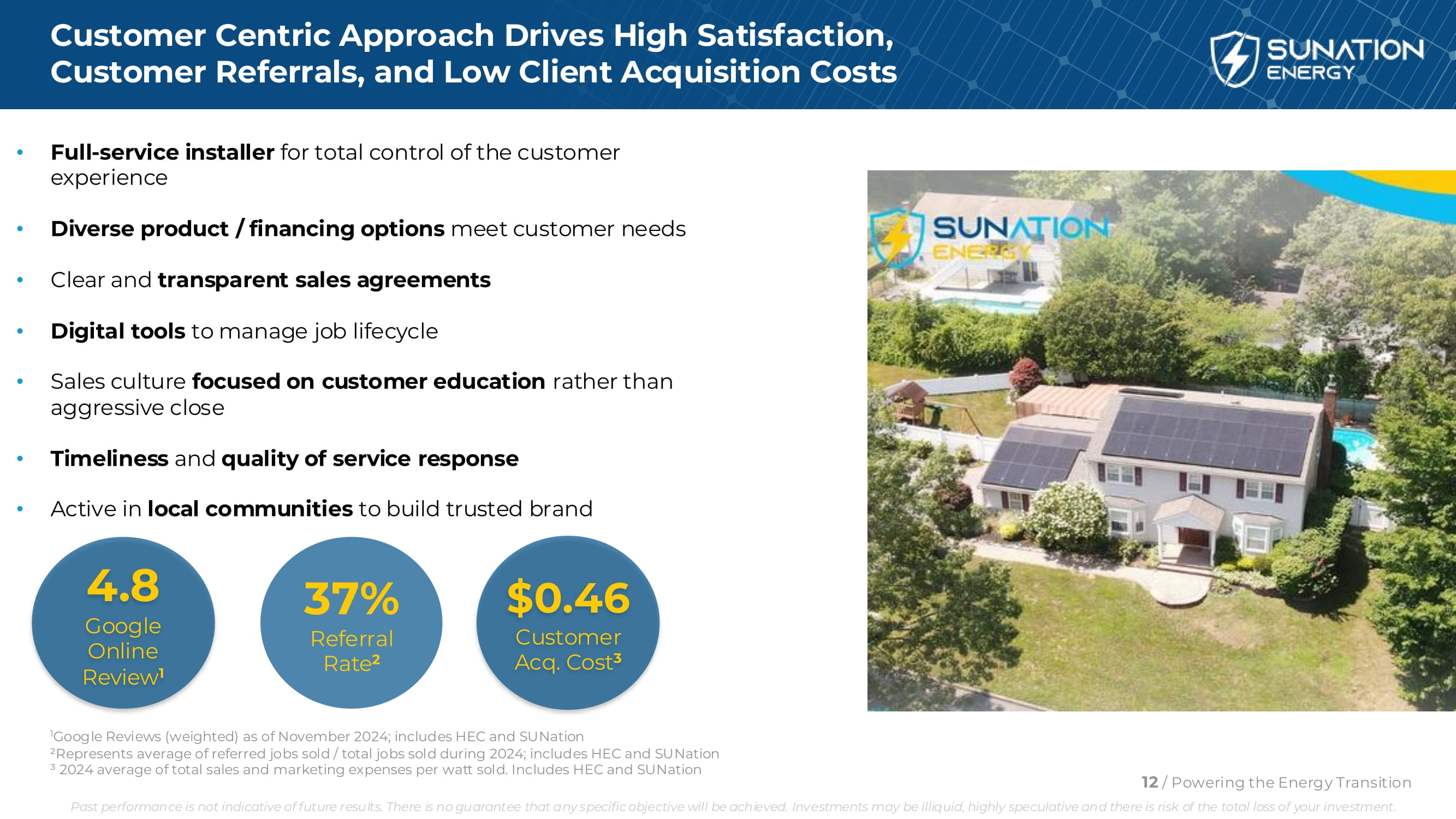 以客户为中心的方法推动高满意度、客户推荐和低客户获取成本•全面服务安装程序,全面控制客户体验•多样化的产品/融资选择满足客户需求•清晰透明的销售协议•管理工作生命周期的数字工具•销售文化侧重于客户教育,而不是积极接近•服务响应的及时性和质量•积极参与当地社区,以建立值得信赖的品牌4.8 Google Online Review 137%推荐率2 $ 0.46 Customer Acq。成本31截至2024年11月的谷歌评论(加权);包括HEC和SUNation ²代表2024年期间出售的推荐工作的平均值/出售的总工作;包括HEC和SUNation ↓ 2024年每售出一瓦的总销售和营销费用的平均值。包括HEC和SUNation12/为能源转型提供动力过去的表现并不代表未来的结果。不能保证任何具体目标都能实现。投资可能缺乏流动性,投机性强,存在投资全损的风险。