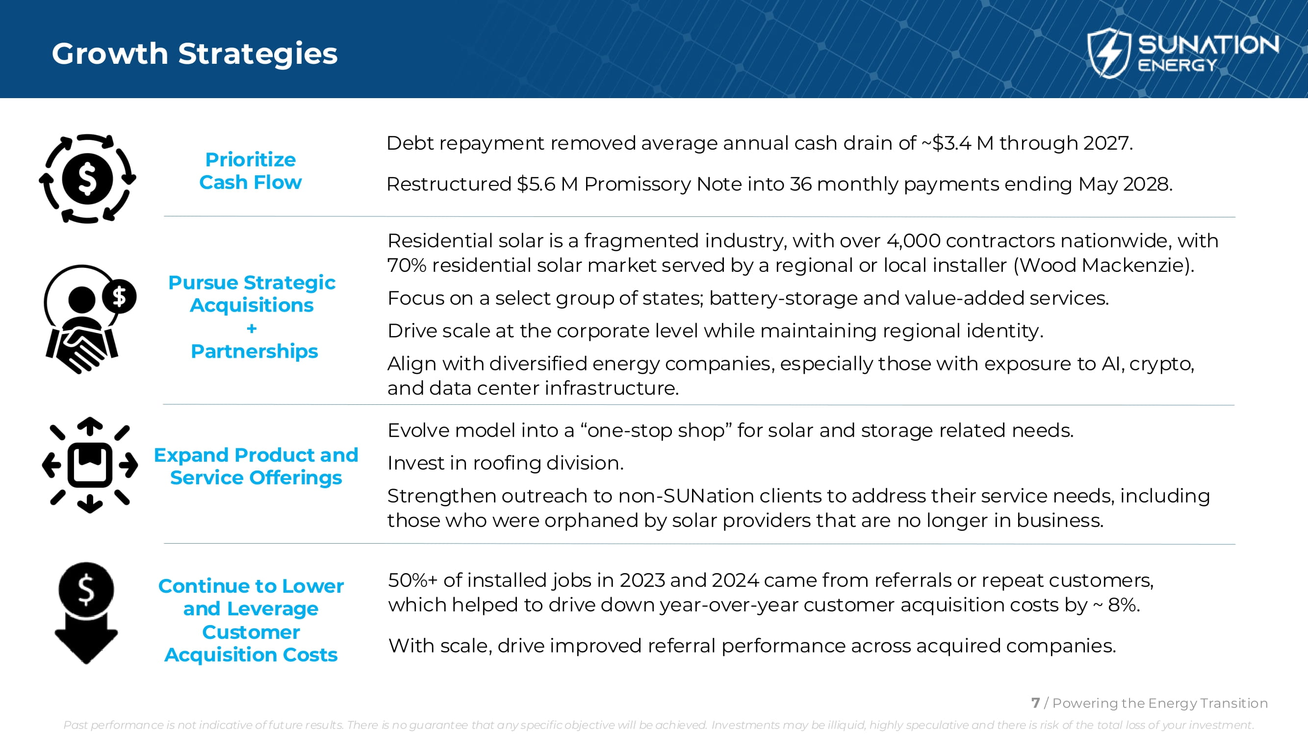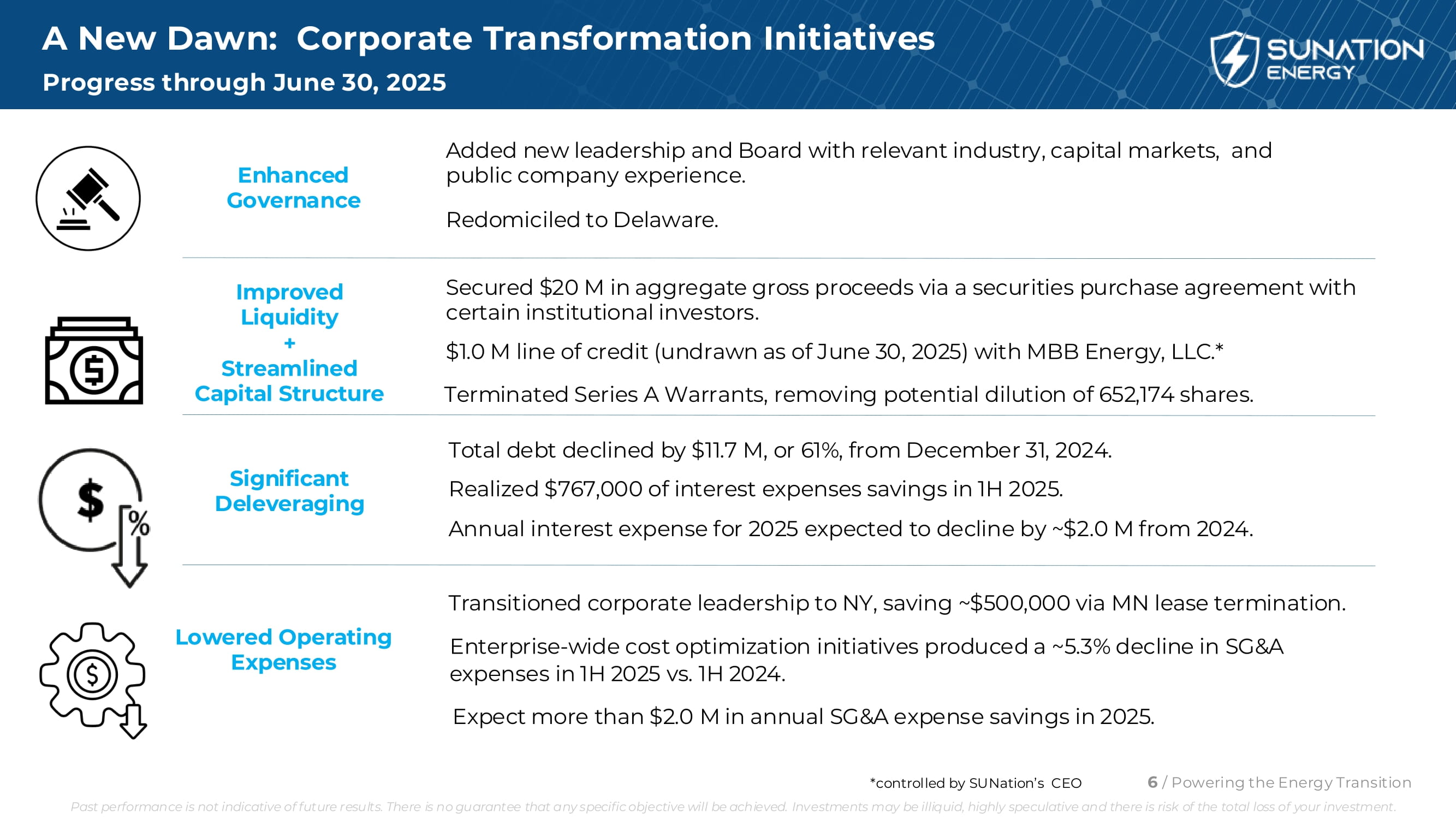 加强治理改善流动性+精简资本Structure显著去杠杆降低运营费用新增领导层和具备相关行业、资本市场、上市公司经验的董事会。搬迁至特拉华州。通过与某些机构投资者的证券购买协议,获得了2000万美元的总收益。与MBB Energy,LLC的100万美元信用额度(截至2025年6月30日未提取)。*终止A系列认股权证,去除潜在摊薄65.2174万股。与2024年12月31日相比,总债务减少了1170万美元,降幅为61%。2025年上半年实现利息支出节省767,000美元。2025年的年度利息支出预计将比2024年下降约200万美元。将企业领导层转移到纽约,通过终止MN租约节省了约50万美元。2025年上半年与2024年上半年相比,全企业范围的成本优化举措使SG & A费用下降了约5.3%。预计2025年每年SG & A费用节省超过200万美元。新曙光:企业转型举措进展至2025年6月30日6/为能源转型提供动力*由SUNation的CEO控制过去的表现并不代表未来的结果。无法保证任何具体目标都能实现。投资可能缺乏流动性,高度投机性,存在你的投资全盘亏损的风险。