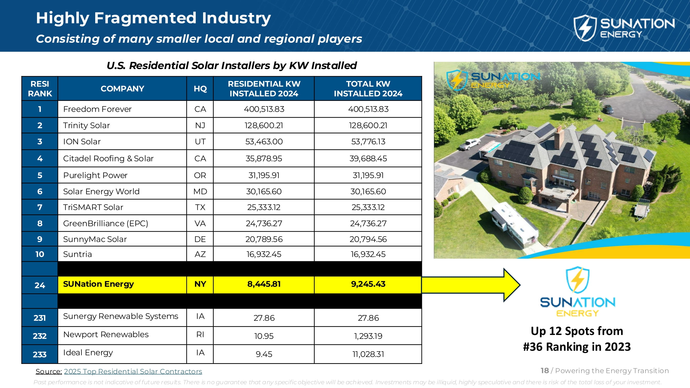 由许多较小的地方组成的高度分散的行业和区域参与者美国住宅太阳能安装商KW安装量Total KW installed 2024 residential KW installed 2024 hQ company RESI rank 400,513.83 400,513.83 加利福尼亚州 freedom forever 1128,600.21 128,600.21 NJ Trinity Solar 253,776.1353,463.00 UT ION Solar 339,688.4535,878.95 加利福尼亚州 Citadel Roofing & Solar 431,195.9 131,195.91 or purelight power 530,165.6030,165.60MD Solar Energy World 625,333.1225,333.12 TX TriSMART Solar 724,736.2724,736.27 VA GreenBrilliance(EPC)820,794。Newport Renewables 23211,028.3 19.45 IA Ideal Energy 233较2023年排名# 36上升12位18/Powering the Energy Transition Source:2025 Top Residential Solar Contractors Past performance is not indicative of future results。不能保证任何具体目标都能实现。投资可能缺乏流动性,投机性强,存在投资全损的风险。