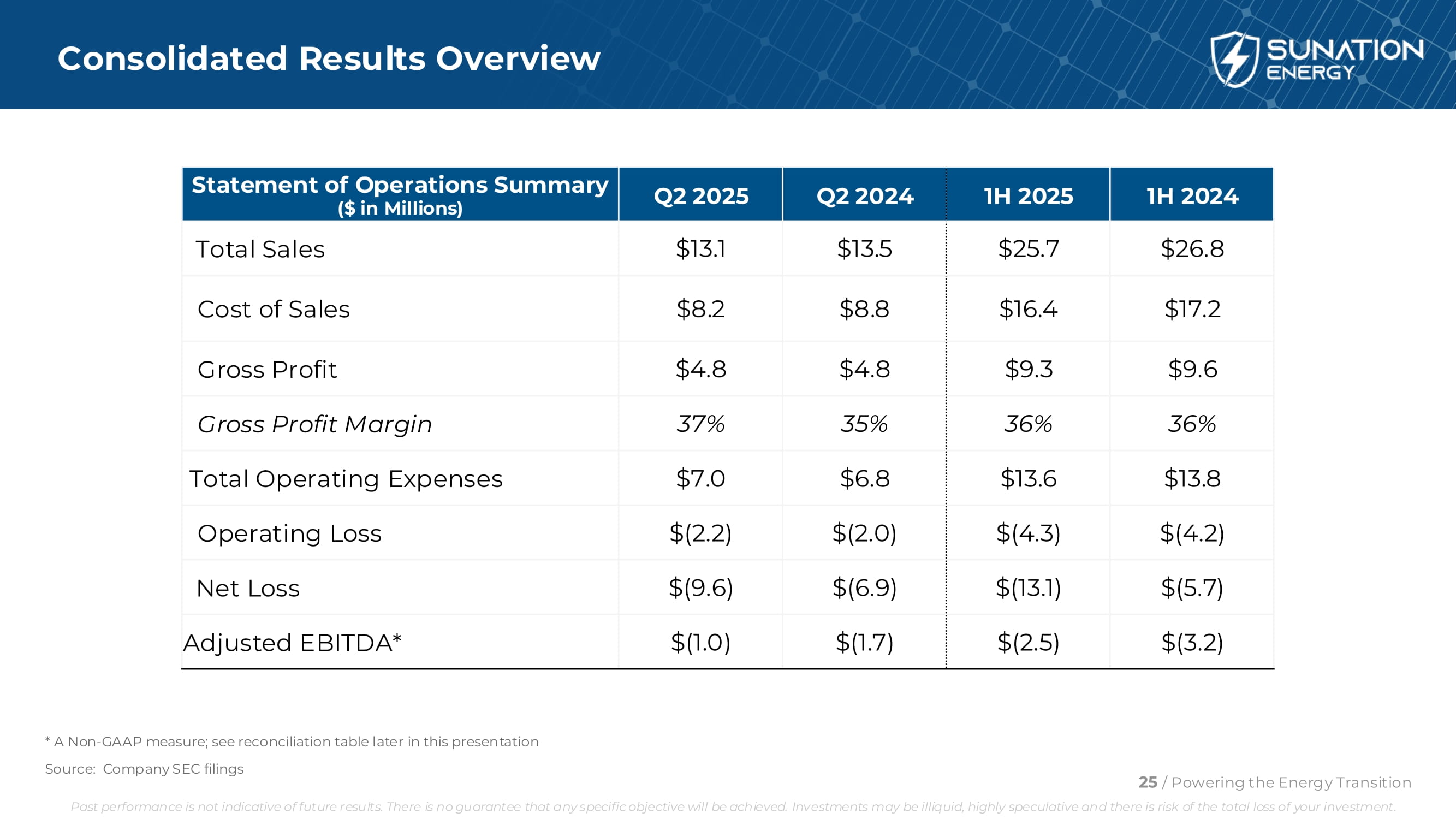 1H 2024 1H 2025 Q2 2024 Q2 2025运营报表摘要(百万美元)$ 26.8 $ 25.7 $ 13.5 $ 13.1总销售额$ 17.2 $ 16.4 $ 8.8 $ 8.2销售成本$ 9.6 $ 9.3 $ 4.8毛利润36% 36% 35% 37%毛利率$ 13.8 $ 13.6 $ 6.8 $ 7.0总运营费用$(4.2)$(4.3)$(2.0)$(2.2)运营亏损$(5.7)$(13.1)$(6.9)$(9.6)净亏损$(3.2)$(2.5)$(1.7)$(1.0)调整后EBITDA*资料来源:公司SEC文件25/Powering the Energy Transition过去的表现并不代表未来的结果。不能保证任何具体目标都能实现。投资可能缺乏流动性,投机性强,存在投资全损的风险。*一种非公认会计原则的衡量标准;见本演示文稿后面的调节表合并结果概览