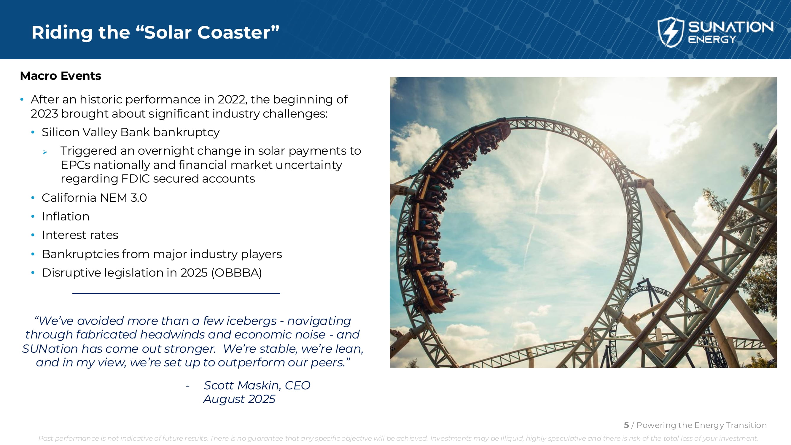 乘坐“太阳能过山车”宏观事件•在2022年取得历史性表现之后,2023年的开始带来了重大的行业挑战:•硅谷银行破产»引发了一夜之间全国向EPC支付太阳能款项的变化,以及有关FDIC担保账户的金融市场不确定性•加州NEM 3.0•通货膨胀•利率•主要行业参与者的破产• 2025年的颠覆性立法(OBBBA)“我们避免了不止几座冰山——在捏造的逆风和经济噪音中航行——而且阳光已经变得更加强大。我们很稳定,我们很精干,在我看来,我们的表现要优于同行。”-斯科特·马斯金,首席执行官2025年8月5日/为能源转型提供动力过去的表现并不代表未来的结果。不能保证任何具体目标都能实现。投资可能缺乏流动性,投机性强,存在投资全损的风险。