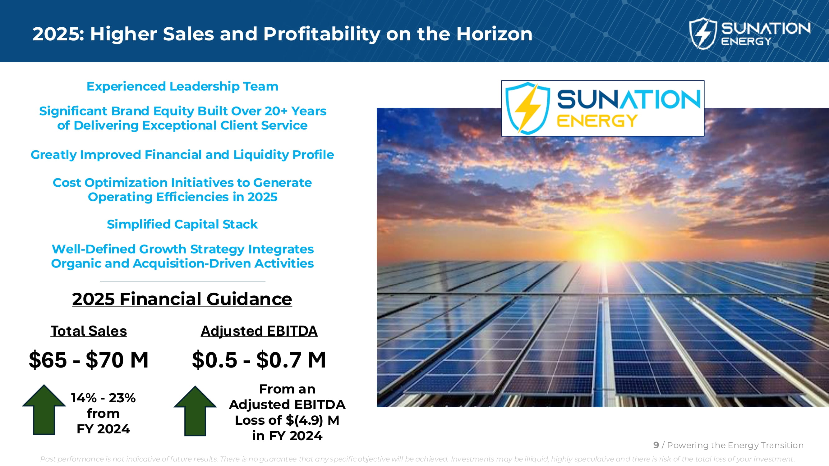 投资结论•更新的领导层为一家备受尊敬、20岁以上的公司规划了新的航向•战略重组基本完成,标志着SUNation增长和发展的转折点•继续专注于增加收入、降低运营费用和改善资产负债表•深思熟虑和衡量收购战略,以补充有机增长计划并利用太阳能行业引人注目的机会我们的2025年目标和展望•更高的总收入,恢复调整后EBITDA盈利能力•继续加强运营和财务状况•更高的住宅和商业太阳能项目积压• OBBBA下的住宅市场再工装方法•扩展服务业务23/为能源转型提供动力过去的业绩并不代表未来的结果。不能保证任何具体目标都能实现。投资可能缺乏流动性,投机性强,存在投资全损的风险。