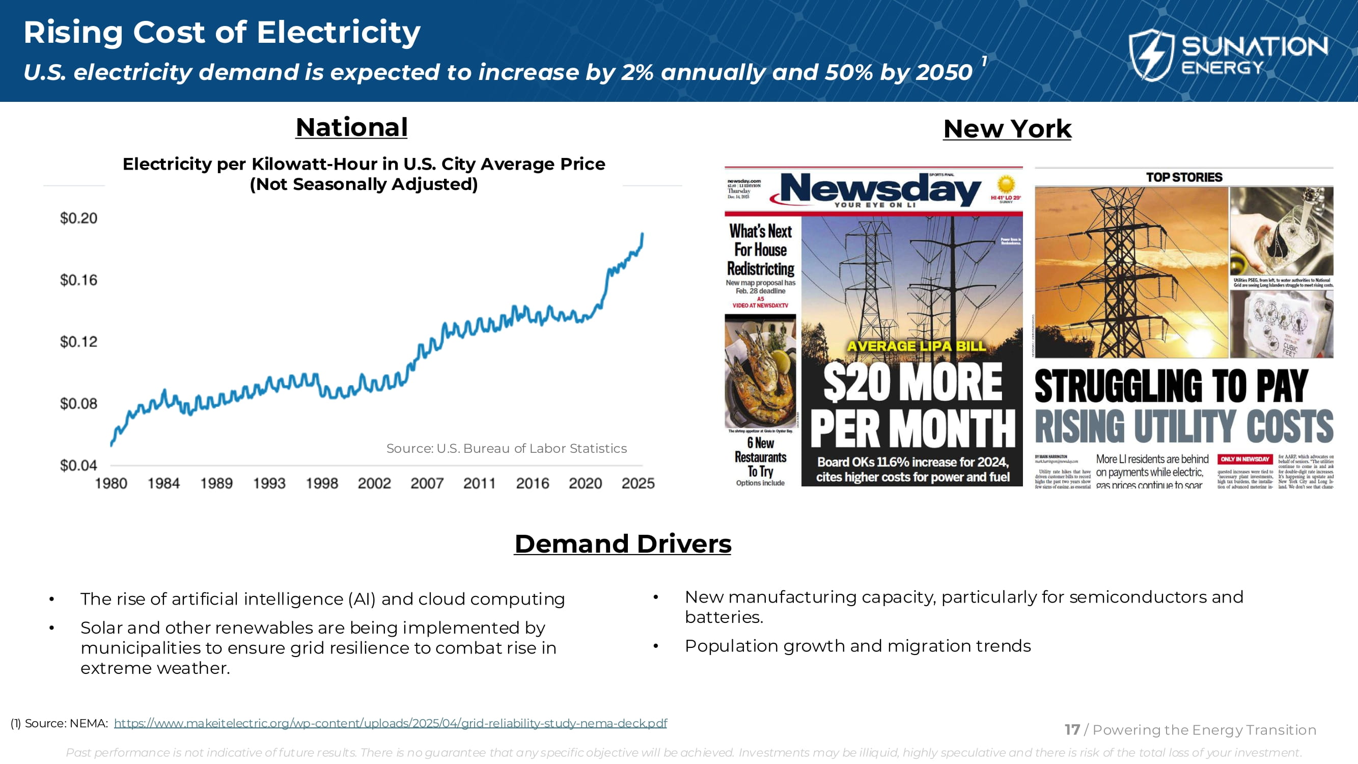 电力成本上涨美国电力需求预计每年将增长2%,到2050年将增长50% 1 •人工智能(AI)和云计算的兴起•市政当局正在实施太阳能和其他可再生能源,以确保电网抵御极端天气下的上涨的弹性。资料来源:美国劳工统计局全国每千瓦时电力-美国城市平均价格(未经季节性调整)纽约•新制造产能,特别是半导体和电池。•人口增长和迁移趋势(1)资料来源:NEMA:https://www.makeitelectric.org/wp-content/uploads/2025/04/grid-reliability-study-nema-deck.pdf 17/为能源转型提供动力过去的表现并不代表未来的结果。不能保证任何具体目标都能实现。投资可能缺乏流动性,投机性强,存在投资全损的风险。需求驱动因素