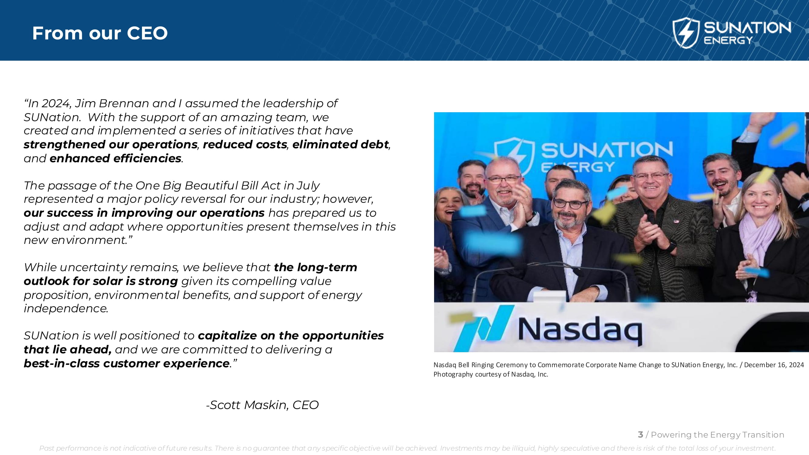 来自我们的首席执行官“2024年,我和吉姆·布伦南担任了SUNation的领导。在一支了不起的团队的支持下,我们创建并实施了一系列举措,这些举措加强了我们的运营,降低了成本,消除了债务,提高了效率。7月份通过的《一大美丽法案》代表了我们行业的重大政策逆转;然而,我们在改善运营方面的成功让我们做好了准备,以便在这个新环境中出现机会的地方进行调整和适应。”尽管不确定性仍然存在,但我们认为,鉴于太阳能令人信服的价值主张、环境效益以及对能源独立性的支持,其长期前景是强劲的。3/为能源转型提供动力过去的表现并不代表未来的结果。不能保证任何具体目标都能实现。投资可能缺乏流动性,投机性很强,存在你的投资全盘亏损的风险。SUNation处于有利地位,可以利用未来的机遇,我们致力于提供一流的客户体验。”-Scott Maskin,纳斯达克首席执行官,为纪念公司名称变更为SUNation Energy,Inc.而举行的敲钟仪式/2024年12月16日摄影由纳斯达克公司提供