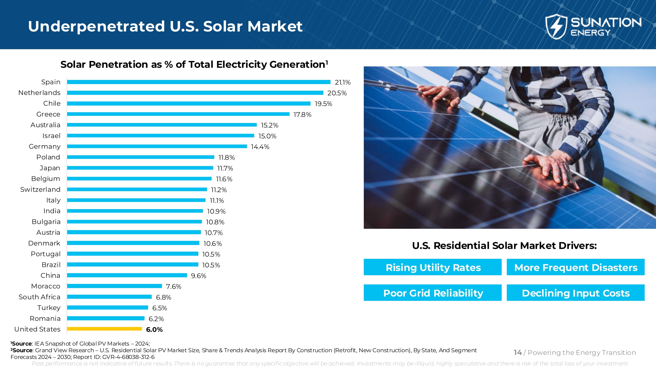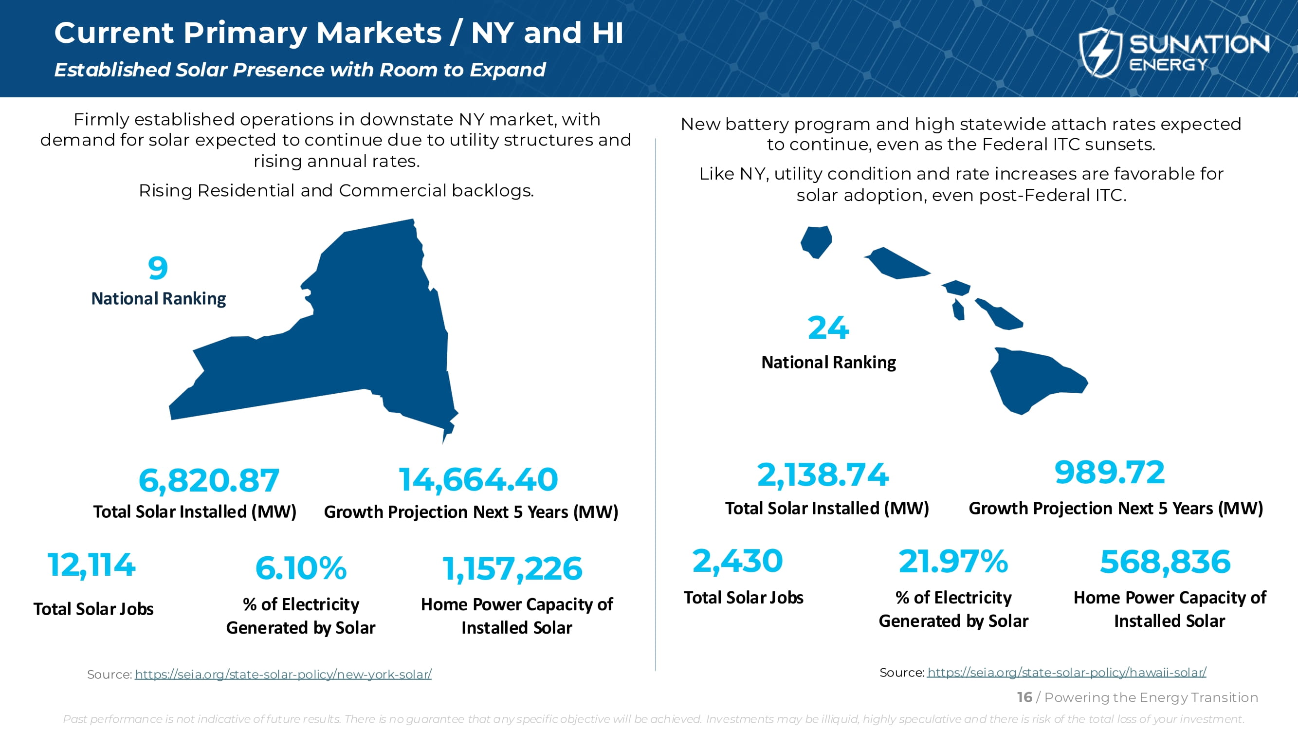 紧随OBBBA住宅的通过而奋进:消除第25D节解决纽约和夏威夷住宅太阳能查询激增的问题。•消费者到2025年底安装的紧迫性增加•关注许可流程加快的市政当局确定新的收入来源;通过扩大在服务/维护和屋顶方面的存在,使我们的商业模式多样化。利用夏威夷的电池激励计划来培育光伏应用。利用第48e款扩大非住宅(商业)建设。• 2026年7月前开始项目或2027年12月31日前投入使用。转向纽约和夏威夷市场的租赁和租赁到自有系统,由于公用事业结构和成本,预计这些市场的太阳能需求将持续存在。强调将储能系统与太阳能捆绑使用,以利用第三方拥有的储能系统保留税收抵免的优势。10/为能源转型提供动力过去的表现并不代表未来的结果。不能保证任何具体目标都能实现。投资可能缺乏流动性,投机性强,存在投资全损的风险。