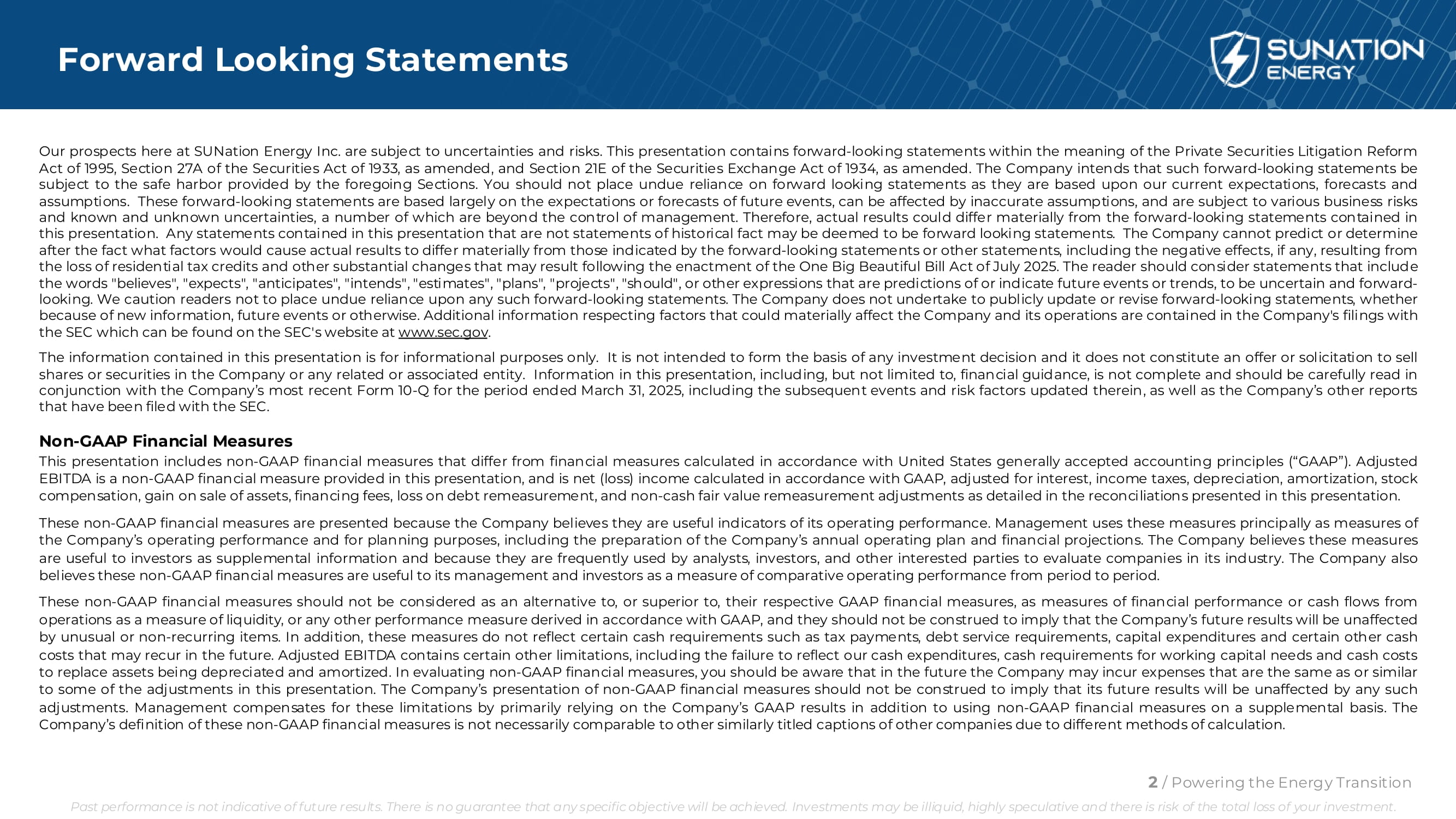 前瞻性陈述2/为能源转型提供动力过去的表现并不代表未来的结果。不能保证任何具体目标都能实现。投资可能缺乏流动性,投机性强,存在投资全损的风险。我们在SUNation Energy Inc.的前景受到不确定性和风险的影响。本演示文稿包含1995年《私人证券诉讼改革法》、经修订的1933年《证券法》第27 A节和经修订的1934年《证券交易法》第21 E节含义内的前瞻性陈述。公司打算将此类前瞻性陈述以上述章节提供的安全港为准。您不应过分依赖前瞻性陈述,因为它们是基于我们当前的预期、预测和假设。这些前瞻性陈述主要基于对未来事件的预期或预测,可能受到不准确假设的影响,并受到各种业务风险以及已知和未知不确定性的影响,其中一些超出了管理层的控制范围。因此,实际结果可能与本演示文稿中包含的前瞻性陈述存在重大差异。本演示文稿中包含的任何非历史事实陈述的陈述均可被视为前瞻性陈述。公司无法预测或事后确定哪些因素会导致实际结果与前瞻性陈述或其他陈述所表明的结果存在重大差异,包括由于失去住宅税收抵免和2025年7月《一大美丽法案》颁布后可能导致的其他实质性变化而产生的负面影响(如果有的话)。读者应将包含“相信”、“预期”、“预期”、“打算”、“估计”、“计划”、“项目”、“应该”等词语的陈述,或其他预测或指示未来事件或趋势的表述,视为具有不确定性和前瞻性。我们提醒读者不要过分依赖任何此类前瞻性陈述。公司不承诺公开更新或修改前瞻性陈述,无论是因为新信息、未来事件或其他原因。有关可能对公司及其运营产生重大影响的因素的其他信息包含在公司提交给SEC的文件中,这些文件可在SEC网站www.sec.gov上找到。本演示文稿中包含的信息仅供参考。其无意构成任何投资决定的基础,亦不构成出售公司或任何相关或关联实体的股份或证券的要约或招揽。本演示文稿中的信息,包括但不限于财务指导,并不完整,应结合公司截至2025年3月31日止期间的最新10-Q表格仔细阅读,包括其中更新的后续事件和风险因素,以及公司已向SEC提交的其他报告。非公认会计原则财务指标本演示文稿包括与根据美国公认会计原则(“GAAP”)计算的财务指标不同的非公认会计原则财务指标。调整后EBITDA是本演示文稿中提供的非GAAP财务指标,是根据GAAP计算的净(亏损)收入,根据利息、所得税、折旧、摊销、股票补偿、出售资产收益、融资费用、债务重新计量损失和非现金公允价值重新计量调整进行调整,详见本演示文稿中的对账。之所以提出这些非公认会计准则财务指标,是因为公司认为它们是衡量其经营业绩的有用指标。管理层主要将这些措施作为衡量公司经营业绩的措施,并用于规划目的,包括编制公司年度经营计划和财务预测。该公司认为,这些措施作为补充信息对投资者很有用,因为分析师、投资者和其他感兴趣的各方经常使用这些措施来评估所在行业的公司。该公司还认为,这些非公认会计准则财务指标对其管理层和投资者有用,可作为衡量不同时期的比较经营业绩的指标。这些非GAAP财务指标不应被视为替代或优于其各自的GAAP财务指标,不应被视为财务业绩或运营现金流量的衡量标准,作为流动性的衡量标准,或根据GAAP得出的任何其他业绩衡量标准, 它们不应被解释为暗示公司未来的业绩将不受影响b y不寻常或非经常性项目。此外,这些措施并不反映某些现金需求,例如纳税、偿债需求、资本支出和未来可能出现的某些其他现金成本。调整后的EBITDA包含某些其他限制,包括未能反映我们的现金支出、营运资金需求的现金需求以及用于替换正在折旧和摊销的资产的现金成本。在评估非GAAP财务指标时,您应该意识到,未来公司可能会产生与本演示文稿中的某些调整相同或相似的费用。该公司提出的非GAAP财务指标不应被解释为暗示其未来业绩将不受任何此类调整的影响。管理层通过主要依赖公司的GAAP业绩以及在补充基础上使用非GAAP财务指标来弥补这些限制。由于计算方法不同,公司对这些非GAAP财务指标的定义不一定与其他公司的其他类似标题标题具有可比性。