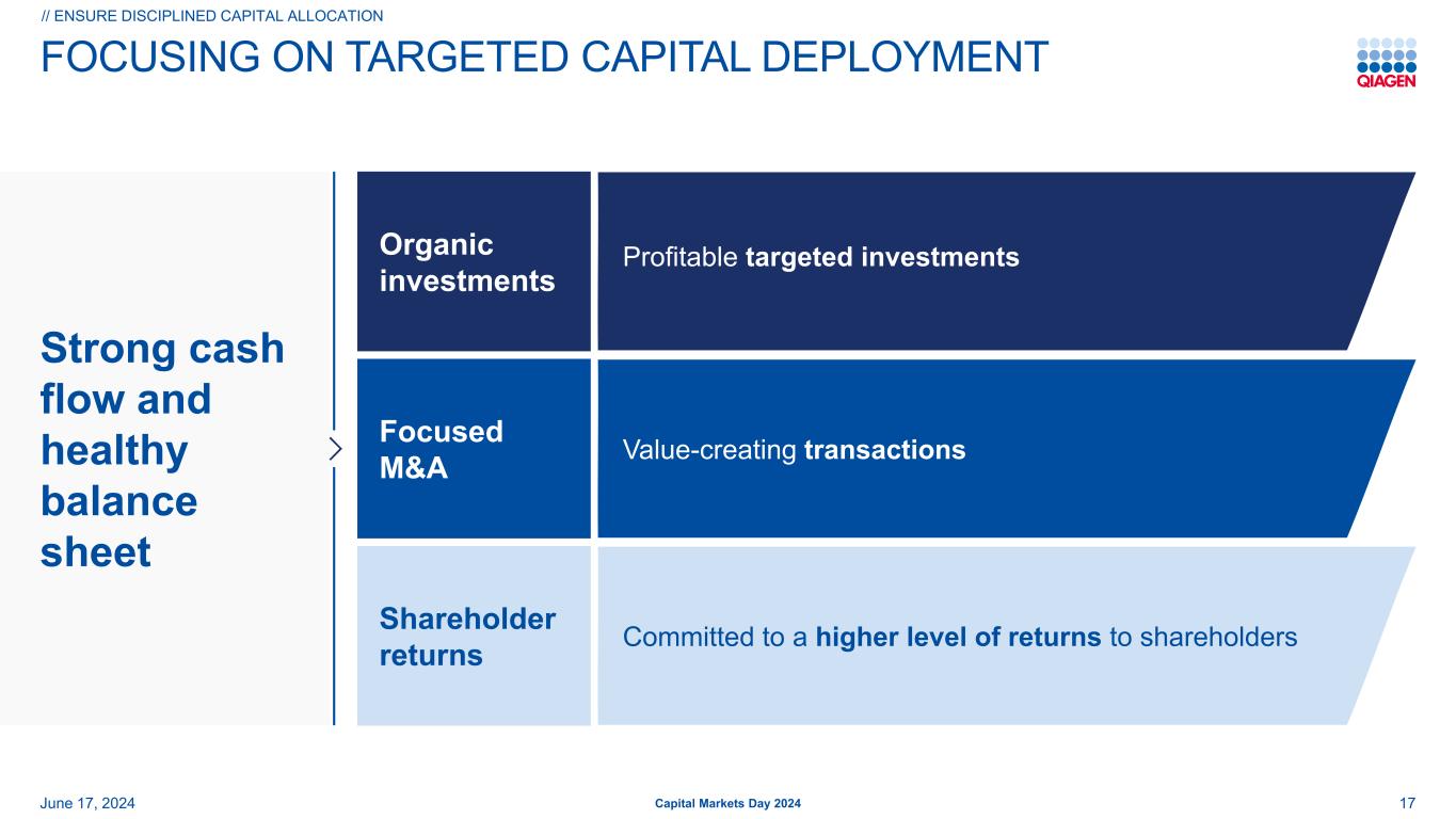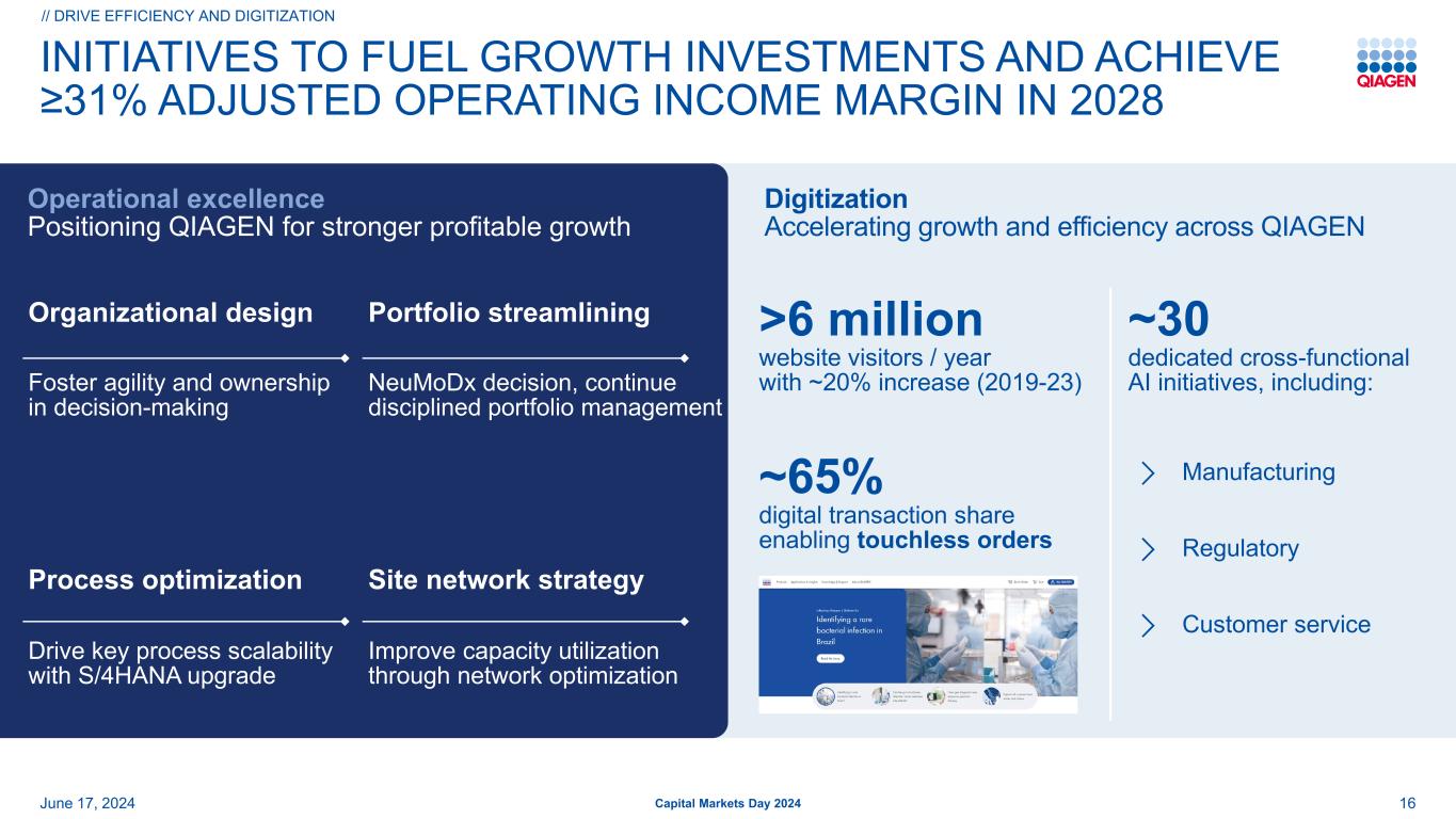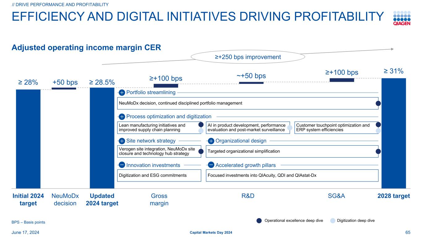 推动利润率的效率和数字化举措调整后的营业利润率CER//驱动业绩和利润率资本市场日2024年6月17日初始2024年目标NeuMoDX决策更新2024年目标毛利率研发SG & A2028年目标≥ 28% + 50bps ≥ 28.5% ≥ 31% ≥ + 250bps改善≥ + 100bps~+ 50bps ≥ + 100bps 65bps –基点重点投资于QIAcuity、QDI和QIAstat-DX目标组织简化Verogen站点整合、NeuMoDX站点关闭和技术中心战略精益制造举措,并在产品开发中改进供应链规划人工智能,绩效评估和上市后监测客户接触点优化和ERP系统效率数字化和ESG承诺NeuModx决策、持续严格的投资组合管理组合精简流程优化和数字化站点网络战略创新投资组织设计加速增长支柱数字化深度挖掘运营卓越