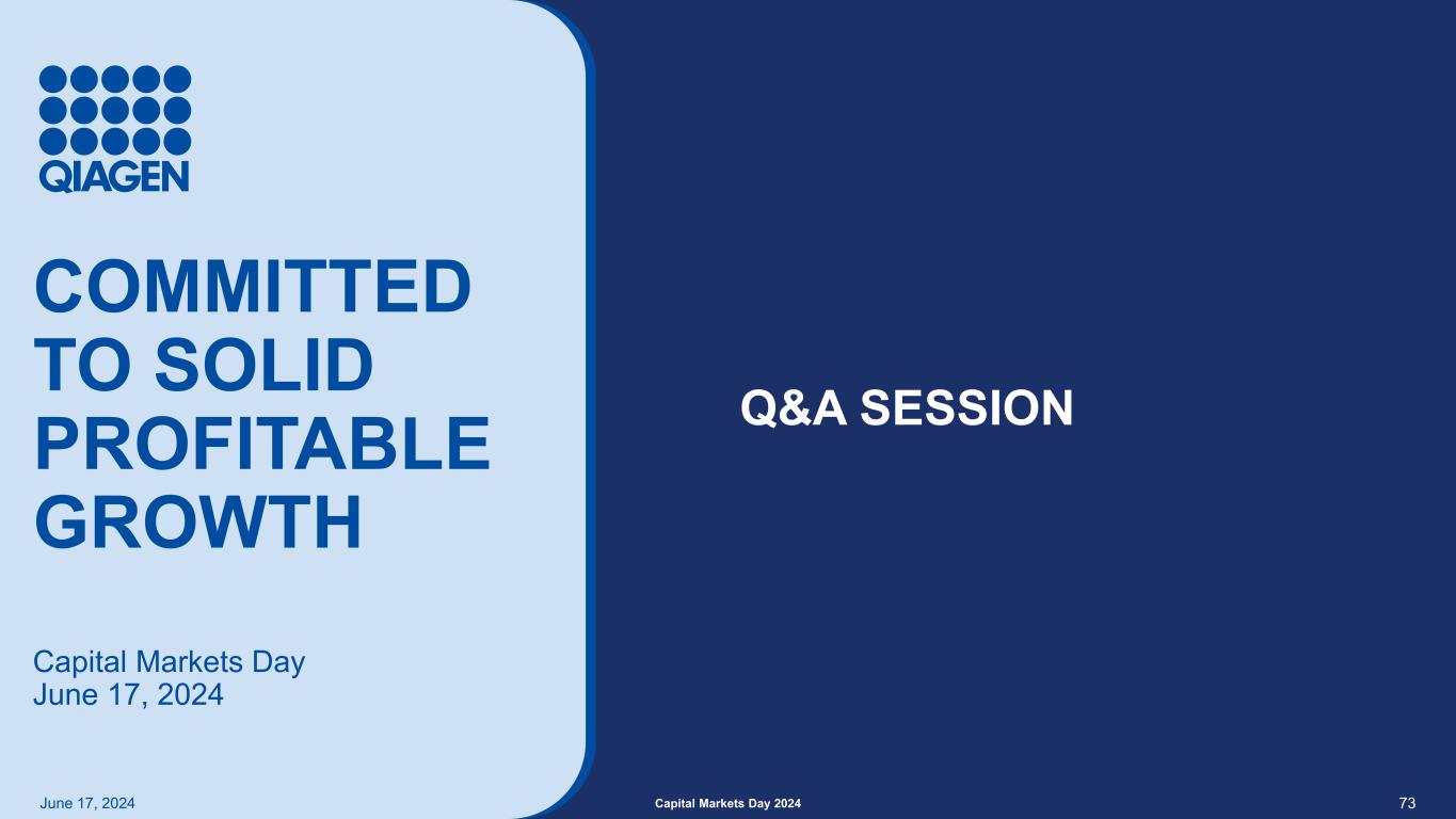 为我们的客户建立可持续的生态系统资本市场日2024 June 17,2024 72 QIAcuity dPCR QIastat-DX QIAGEN Digital Insights样本技术QuantiFERON Pharma/CRO公共机构学术界/医院临床实验室/测试设施
