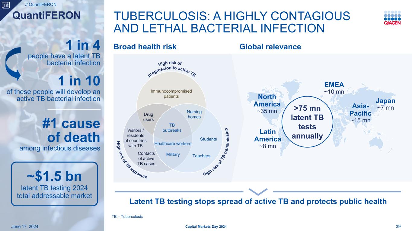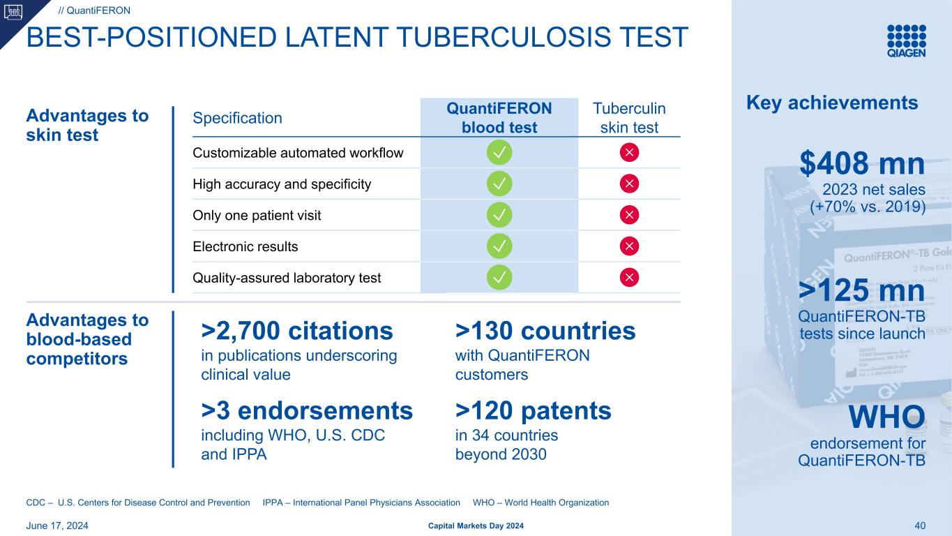 机会瞄准对新型诊断有需求的快速增长市场战略优先事项为什么我们通过在医疗需求未得到满足的领域的差异化投资组合赢得最高领导地位QuantiFERON通过皮肤测试转换和完整的自动化优势扩大# 1的潜在结核病(TB)地位QIASTAT-DX凭借更广泛的全球影响力和差异化的测试菜单取得# 2的地位382024年6月17日资本市场日2024年关键时刻的决定性
