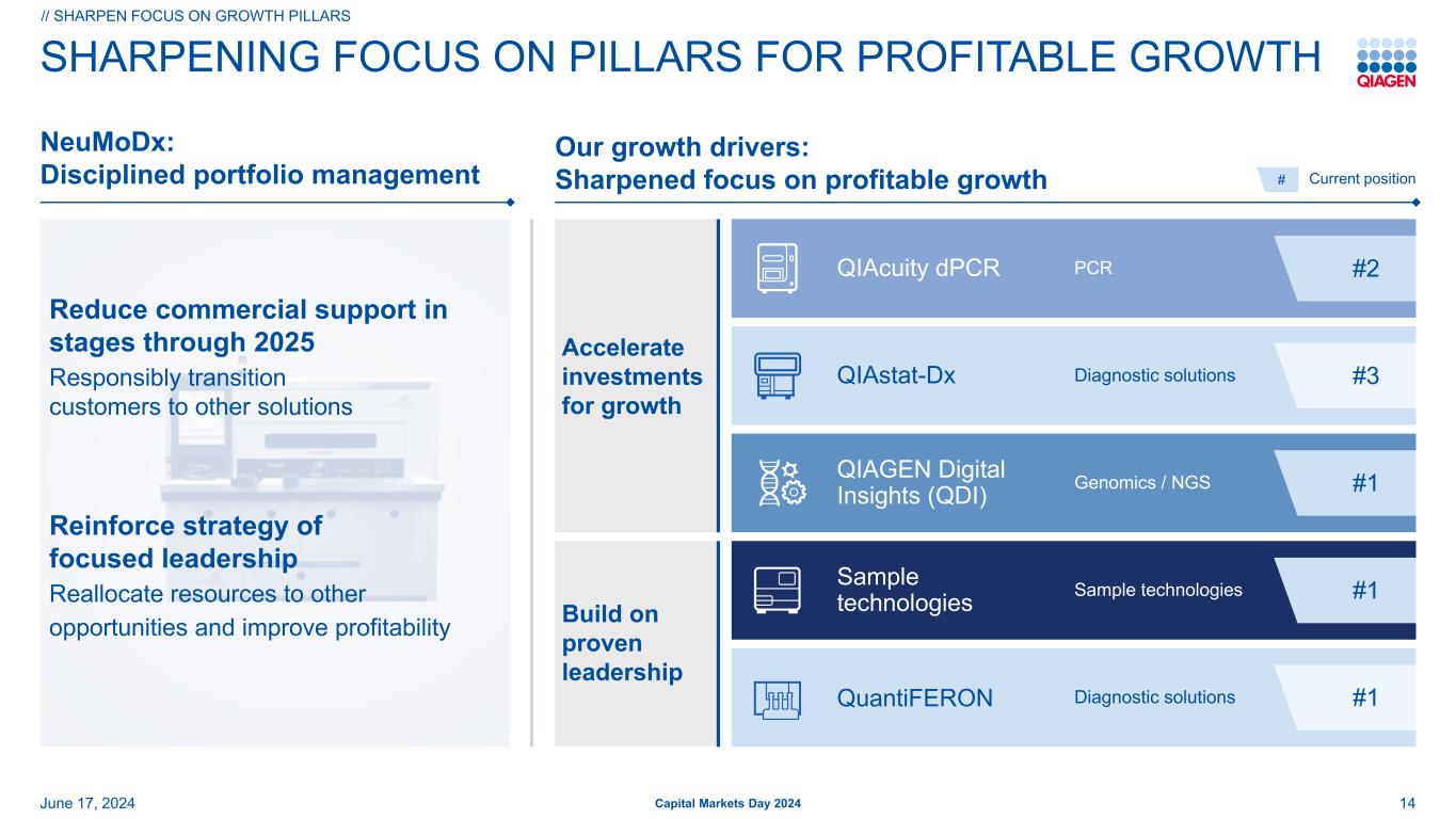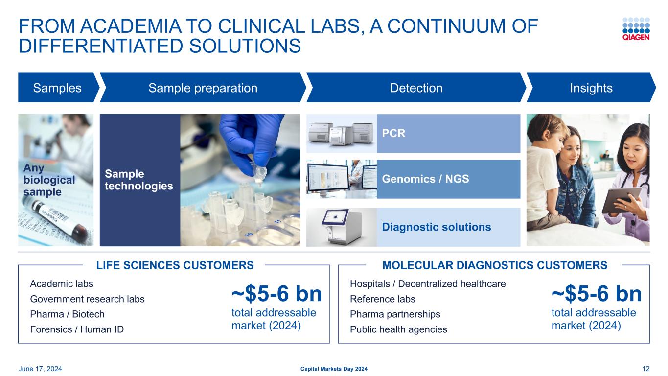 学术实验室政府研究实验室Pharma/Biotech Forensics/Human ID Hospitals/Decentralized Healthcare Reference Labs Pharma Partnership Public Health Agencies Leading From the First Step in Lab WorkFLOWS June 17,2024 Capital Markets Day 2024 Samples Detection Insights Sample Preparation Any biological sample 23 Diagnostic Solutions PCR QiAcuity dPCR Genomics/NGS QIAGEN Digital Insights Sample technologies~50-60亿美元总可寻址市场(2024年)~50-60亿美元总可寻址市场(2024年)生命科学客户分子诊断客户