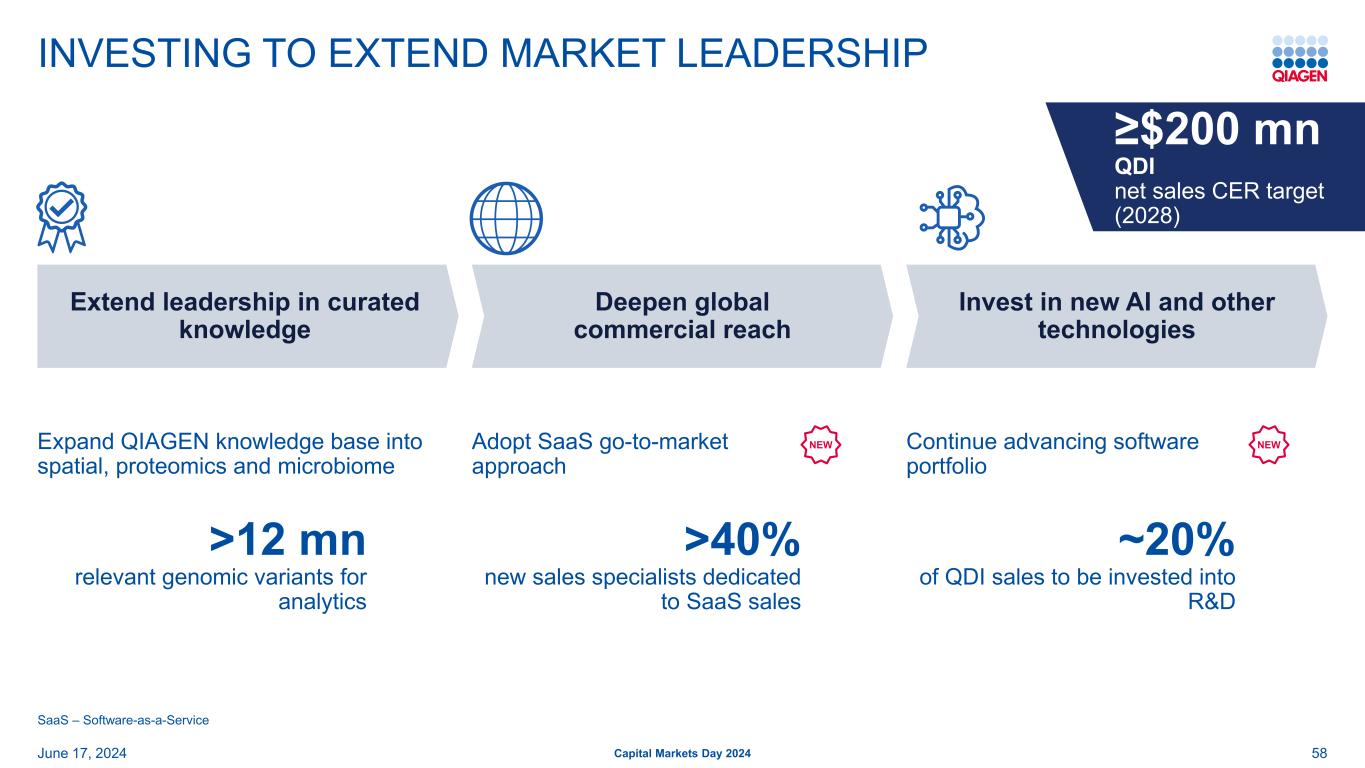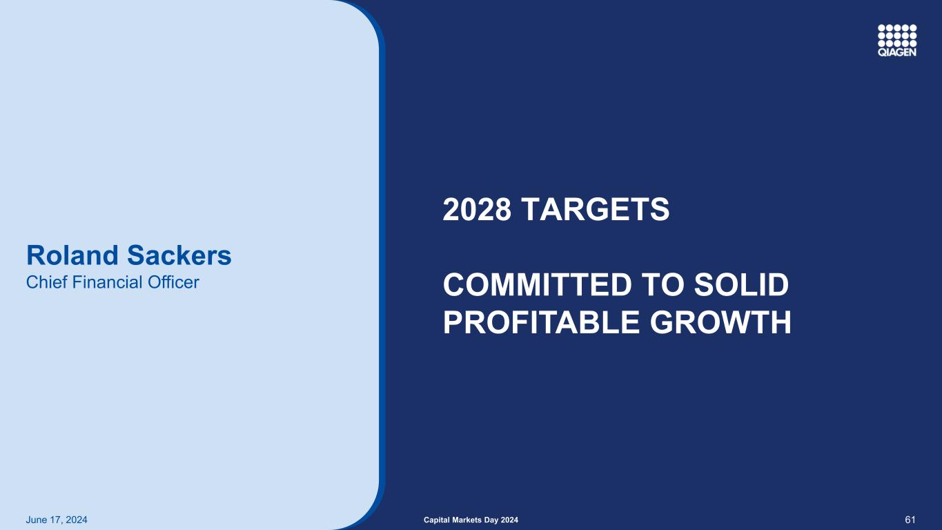 602024年6月17日资本市场日2024 QIAGEN DIGITAL INSIGHTS Powerful Analytics to Understand GENOMICS投资于新的人工智能和其他技术继续推进软件组合扩大在精选知识方面的领先地位扩大知识库的广度深化全球商业覆盖采用SaaS上市方法QDI ≥ 2亿美元vs. > 1.1亿美元(2024)CER –不变汇率(1)净销售额CER目标净销售额2028年目标(1)