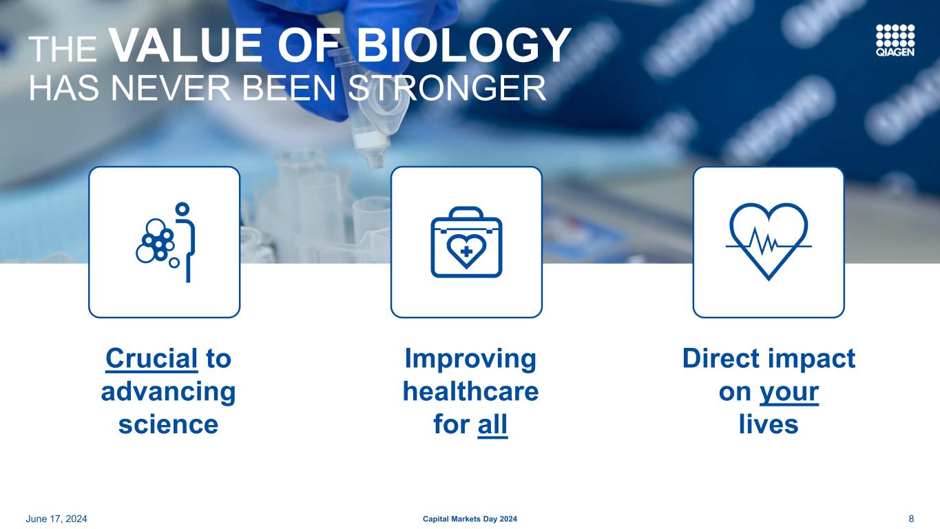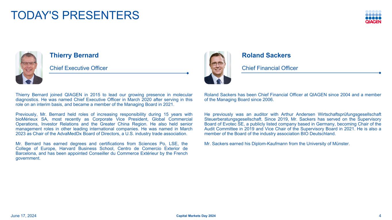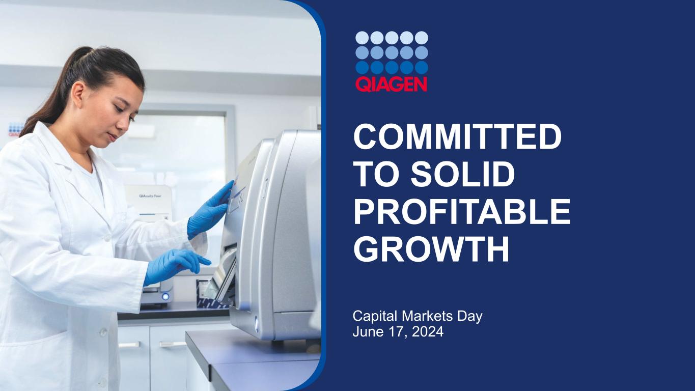 前瞻性和预期用途陈述安全港声明:本演示文稿中包含的某些陈述可能被视为经修订的1933年美国证券法第27A条和经修订的1934年美国证券交易法第21E条含义内的前瞻性陈述。这些陈述可以通过使用前瞻性术语来识别,例如“相信”、“希望”、“计划”、“打算”、“寻求”、“可能”、“将”、“可以”、“应该”、“将”、“预期”、“预期”、“估计”、“继续”、“目标”或其他类似的词。此处包含的与QIAGEN的产品、推出和开发的时间、营销和/或监管批准、财务和运营前景、增长和扩张、合作、市场、战略或经营业绩有关的任何陈述,包括但不限于其预期净销售额、特定产品的净销售额、特定地区的净销售额、调整后的净销售额、调整后的稀释后每股收益结果、调整后营业利润率的扩大、股东回报、产品组合管理、产品发布(包括我们的测序解决方案、测试平台、面板和系统的预期推出)、利用人工智能技术、改善经营和财务杠杆,对美元的汇率变动、对我们的投资组合和股票回购承诺的投资计划、我们对调整后税率、债务到期和偿还的预期、我们以高于销售额的速度增长调整后每股收益的能力、我们提高运营效率和保持有纪律的资本配置的能力,都是前瞻性的,这些陈述是基于当前的预期和假设,其中涉及许多不确定性和风险。此类不确定性和风险包括但不限于与我们依赖新产品的开发和成功相关的风险;管理增长和扩大业务(包括货币波动、税法、监管流程的影响以及对供应商和物流服务的依赖);经营结果的可变性;整合收购的业务;与客户、供应商和战略合作伙伴的关系发生变化;竞争;技术的快速或意外变化;对QIAGEN产品的需求波动(包括由于一般经济状况、客户资金水平和时间、预算和其他因素而产生的波动,包括报销批准或公共卫生资金数额的延迟或限制);我们获得产品监管批准的能力;成功将QIAGEN的产品适用于综合解决方案和生产此类产品的困难;QIAGEN识别和开发新产品以及使我们的产品与竞争对手的产品区分和保护我们的产品的能力;新产品的市场接受度以及所获得的技术和业务的整合;政府的行动、全球或区域经济发展,包括通货膨胀和利率上升、天气或运输延误、自然灾害、网络安全漏洞、政治或公共卫生危机,及其对我们产品的需求和我们业务的其他方面的影响,或其他不可抗力事件;诉讼风险,包括专利诉讼和产品责任;偿债义务;我们普通股的公开交易价格波动;以及与近期或未决收购相关的预期收益可能无法按预期实现;以及我们最近的20-F表格年度报告中“风险因素”标题下讨论的其他因素。有关更多信息,请参阅QIAGEN已提交或提供给的报告中的讨论,美国证券交易委员会。G条例:QIAGEN报告调整后的结果,以及基于固定汇率(CER)的结果,以及其他非美国公认会计原则数据(公认会计原则),以提供更多关于业绩的见解。在本演示文稿中,调整后的结果包括调整后的净销售额、调整后的毛收入、调整后的净收入、调整后的毛利润、调整后的营业费用、调整后的营业收入、调整后的营业利润率、调整后的税前净收入、调整后的所得税、调整后的税率、调整后的EBITDA、调整后的每股收益、调整后的摊薄每股收益和自由现金流。调整后的结果是QIAGEN认为应在根据GAAP编制的报告结果之外考虑的非GAAP财务指标,但不应被视为替代品。QIAGEN认为,当某些项目不在其持续的核心业务范围内时,应将其排除在调整后的结果之外,不同时期差异很大, 或影响与其竞争对手和自身前期结果的可比性。由于受未来决策和行动影响的高度可变性和难以做出准确预测和预测,QIAGEN不会将前瞻性的非GAAP财务指标与相应的GAAP指标进行协调。因此,如果不做出不合理的努力,就无法获得这些前瞻性非GAAP财务指标与相应GAAP指标的对账。然而,这些排除项目的实际金额将对QIAGEN的GAAP业绩产生重大影响。62024年6月17日2024年资本市场日