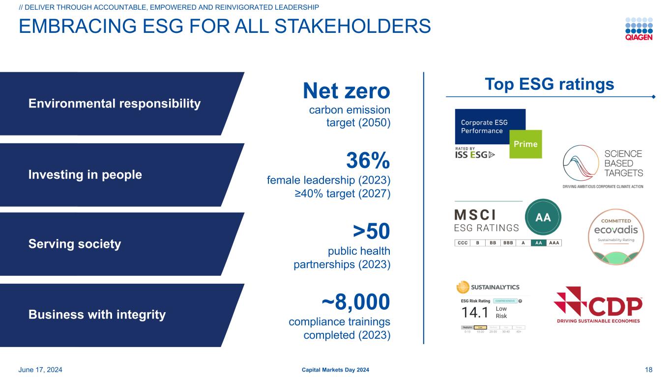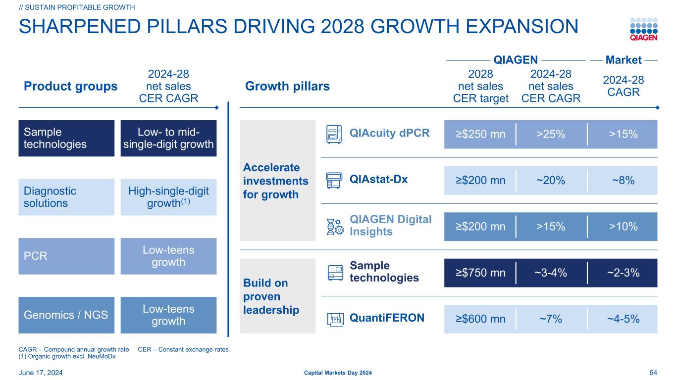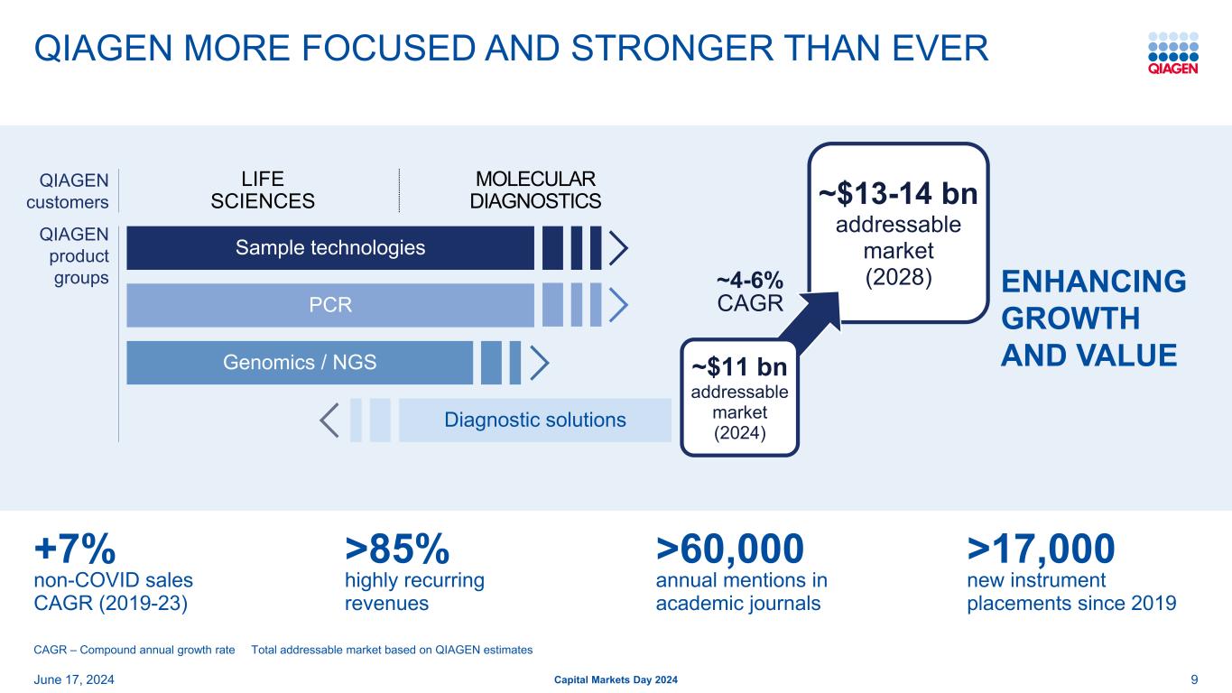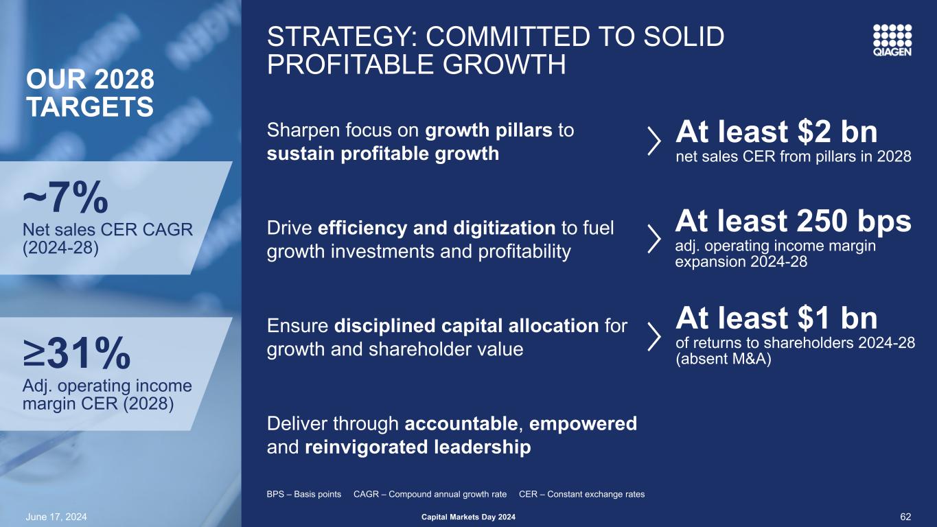 前瞻性和预期用途陈述安全港声明:本演示文稿中包含的某些陈述可能被视为经修订的1933年美国证券法第27A条和经修订的1934年美国证券交易法第21E条含义内的前瞻性陈述。这些陈述可以通过使用前瞻性术语来识别,例如“相信”、“希望”、“计划”、“打算”、“寻求”、“可能”、“将”、“可以”、“应该”、“将”、“预期”、“预期”、“估计”、“继续”、“目标”或其他类似的词。此处包含的与QIAGEN的产品、推出和开发的时间、营销和/或监管批准、财务和运营前景、增长和扩张、合作、市场、战略或经营业绩有关的任何陈述,包括但不限于其预期净销售额、特定产品的净销售额、特定地区的净销售额、调整后的净销售额、调整后的稀释后每股收益结果、调整后营业利润率的扩大、股东回报、产品组合管理、产品发布(包括我们的测序解决方案、测试平台、面板和系统的预期推出)、利用人工智能技术、改善经营和财务杠杆,对美元的汇率变动、对我们的投资组合和股票回购承诺的投资计划、我们对调整后税率、债务到期和偿还的预期、我们以高于销售额的速度增长调整后每股收益的能力、我们提高运营效率和保持有纪律的资本配置的能力,都是前瞻性的,这些陈述是基于当前的预期和假设,其中涉及许多不确定性和风险。此类不确定性和风险包括但不限于与我们依赖新产品的开发和成功相关的风险;管理增长和扩大业务(包括货币波动、税法、监管流程的影响以及对供应商和物流服务的依赖);经营结果的可变性;整合收购的业务;与客户、供应商和战略合作伙伴的关系发生变化;竞争;技术的快速或意外变化;对QIAGEN产品的需求波动(包括由于一般经济状况、客户资金水平和时间、预算和其他因素而产生的波动,包括报销批准或公共卫生资金数额的延迟或限制);我们获得产品监管批准的能力;成功将QIAGEN的产品适用于综合解决方案和生产此类产品的困难;QIAGEN识别和开发新产品以及使我们的产品与竞争对手的产品区分和保护我们的产品的能力;新产品的市场接受度以及所获得的技术和业务的整合;政府的行动、全球或区域经济发展,包括通货膨胀和利率上升、天气或运输延误、自然灾害、网络安全漏洞、政治或公共卫生危机,及其对我们产品的需求和我们业务的其他方面的影响,或其他不可抗力事件;诉讼风险,包括专利诉讼和产品责任;偿债义务;我们普通股的公开交易价格波动;以及与近期或未决收购相关的预期收益可能无法按预期实现;以及我们最近的20-F表格年度报告中“风险因素”标题下讨论的其他因素。有关更多信息,请参阅QIAGEN已提交或提供给的报告中的讨论,美国证券交易委员会。G条例:QIAGEN报告调整后的结果,以及基于固定汇率(CER)的结果,以及其他非美国公认会计原则数据(公认会计原则),以提供更多关于业绩的见解。在本演示文稿中,调整后的结果包括调整后的净销售额、调整后的毛收入、调整后的净收入、调整后的毛利润、调整后的营业费用、调整后的营业收入、调整后的营业利润率、调整后的税前净收入、调整后的所得税、调整后的税率、调整后的EBITDA、调整后的每股收益、调整后的摊薄每股收益和自由现金流。调整后的结果是QIAGEN认为应在根据GAAP编制的报告结果之外考虑的非GAAP财务指标,但不应被视为替代品。QIAGEN认为,当某些项目不在其持续的核心业务范围内时,应将其排除在调整后的结果之外,不同时期差异很大, 或影响与其竞争对手和自身前期结果的可比性。由于受未来决策和行动影响的高度可变性和难以做出准确预测和预测,QIAGEN不会将前瞻性的非GAAP财务指标与相应的GAAP指标进行协调。因此,如果不做出不合理的努力,就无法获得这些前瞻性非GAAP财务指标与相应GAAP指标的对账。然而,这些排除项目的实际金额将对QIAGEN的GAAP业绩产生重大影响。62024年6月17日2024年资本市场日