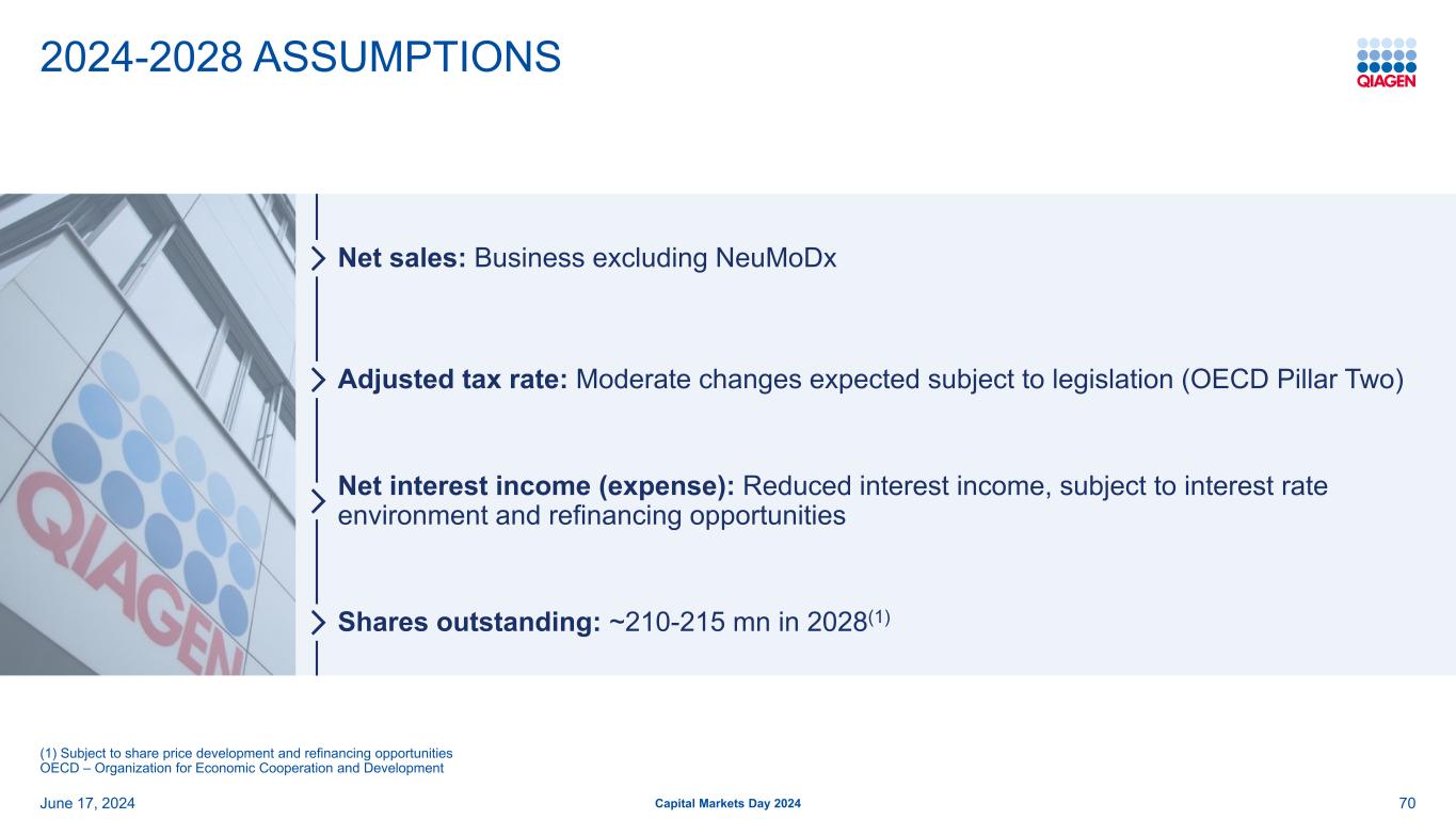 2024-2028年假设资本市场日20242024年6月17日调整后的税率:预计受立法影响的温和变化(经合组织第二支柱)净利息收入(费用):利息收入减少,受制于利率环境和再融资机会流通股:2028年约为2.10-2.15亿(1)70净销售额:不包括NeuMoDX的业务(1)受制于股价发展和再融资机会经合组织–经济合作与发展组织