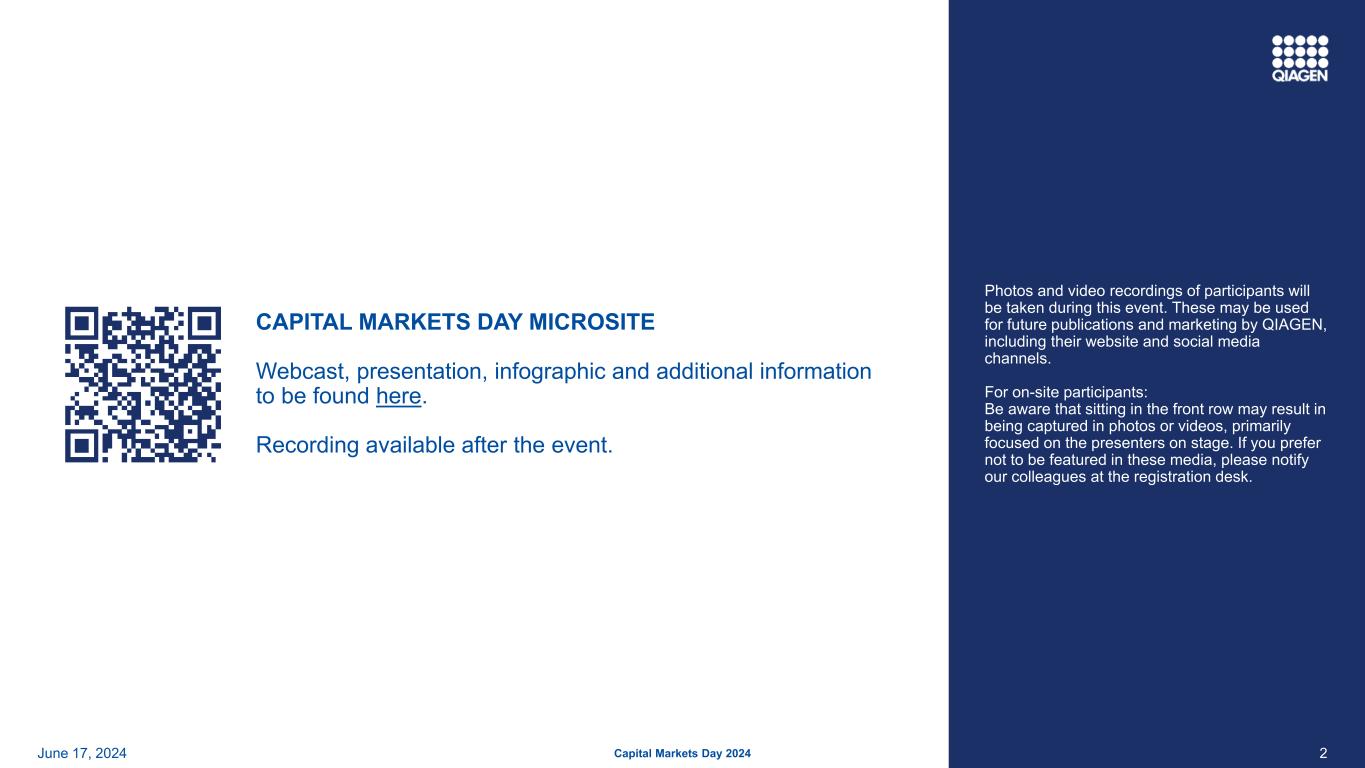 2June 17,2024 Capital Markets Day 2024将在本次活动期间拍摄参与者的照片和视频记录。这些可能会被QIAGEN用于未来的出版物和营销,包括其网站和社交媒体渠道。对于现场参与者:请注意,坐在前排可能会导致被照片或视频捕捉到,主要集中在舞台上的主持人。如果你不想被这些媒体报道,请在登记处通知我们的同事。CAPITAL Markets DAY MICROSITE网络广播、演示文稿、信息图表和其他信息可在此处找到。活动结束后可进行录音。