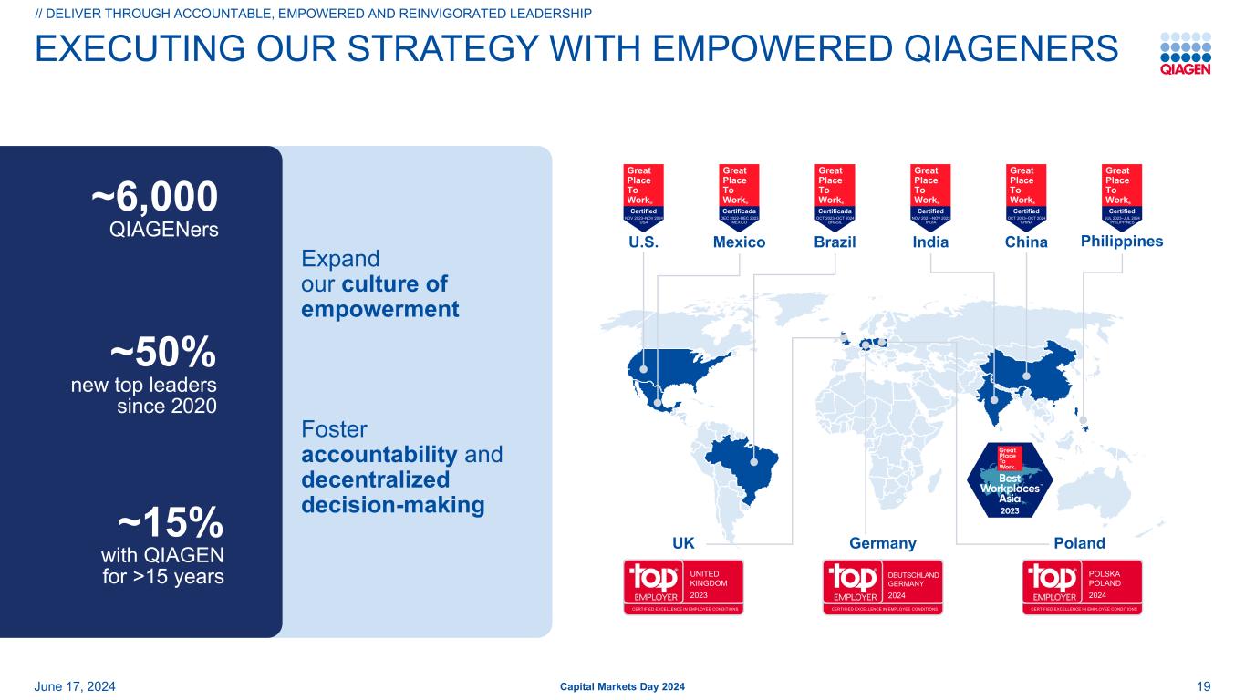 与获授权的QIAGENERS一起执行我们的战略扩大我们的赋权文化促进问责制和分散决策Great Place to Work ®认证2023年11月– 2024年11月美国美国Great Place to Work ®认证2022年12月– 2023年12月墨西哥墨西哥英国波兰Great Place to Work ®认证2023年10月– 2024年10月巴西Great Place to Work ®认证2023年7月– 2024年7月菲律宾Great Place to Work ®认证2021年11月– 2022年11月印度Great Place to Work ®认证2023年10月– 2024年10月中国中国德国~6,000 QIAGENers~自2020年以来50%的新高层领导19资本市场日2024年6月17日,2024~15%与QIAGEN合作> 15年印度英国2023认证的员工条件卓越德国2024认证的员工条件卓越波兰2024认证的员工条件卓越//通过问责制、赋权和重振领导力交付