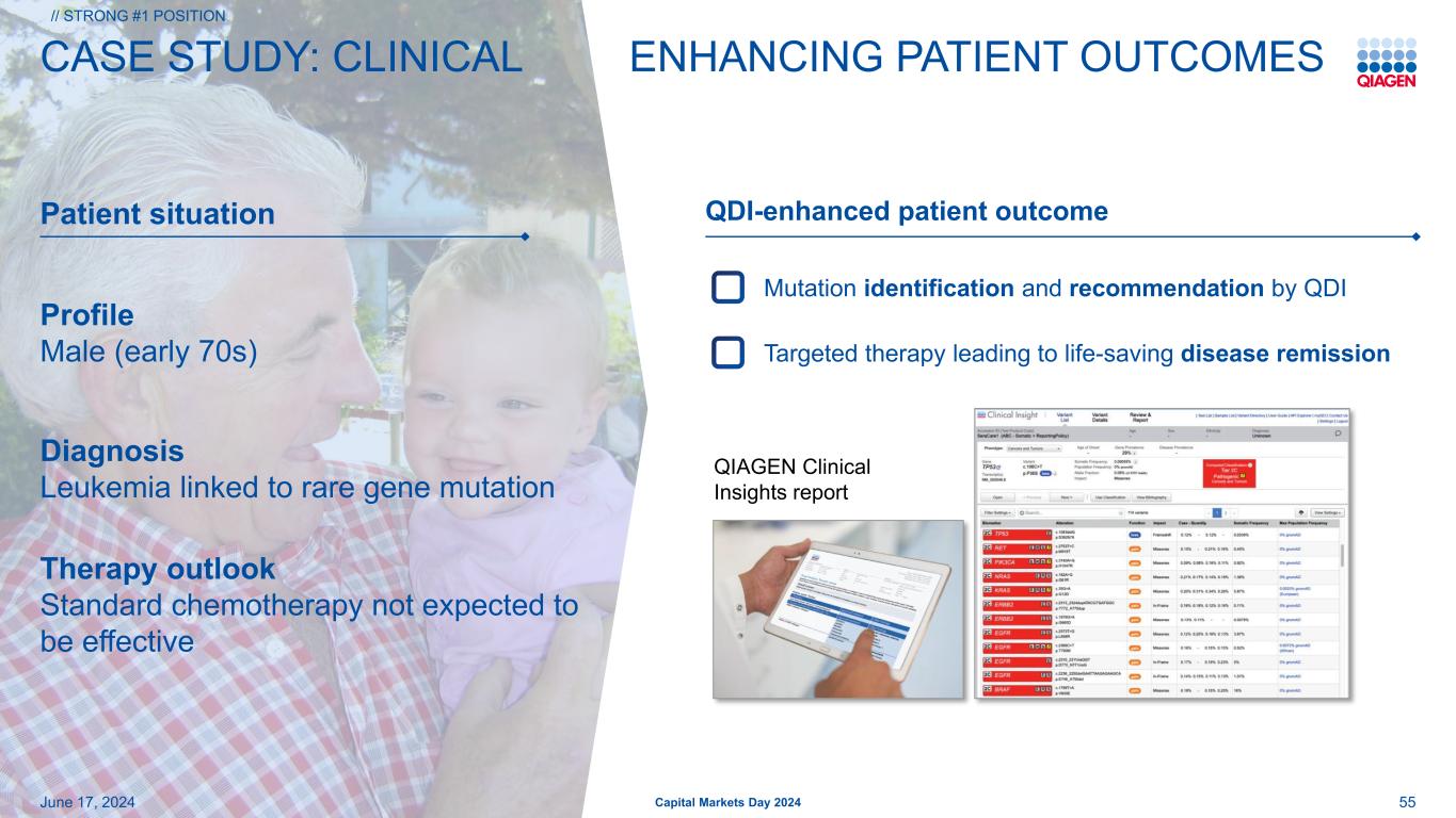 55患者情况2024年6月17日资本市场日2024年案例研究:临床QDII增强型患者预后QIAGEN Clinical Insights报告简介男性(70岁出头)诊断白血病与罕见基因突变治疗前景相关标准化疗预计不会有效的突变识别和推荐QDI增强型患者结果靶向治疗导致挽救生命的疾病缓解//Strong # 1位置