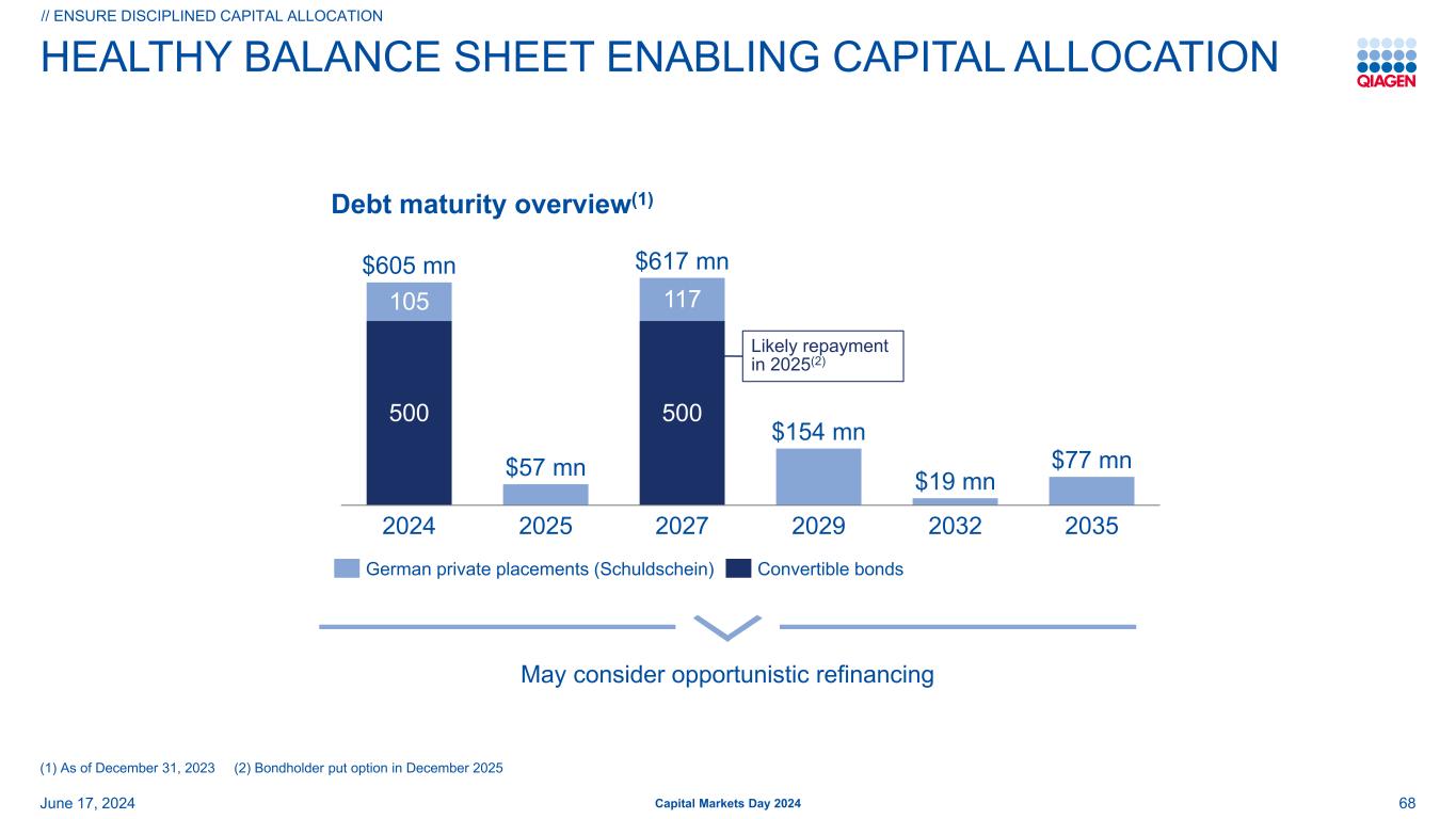 健康资产负债表使能资本分配5005001051172024202520272029203220356.05亿美元5700万美元6.17亿美元1.54亿美元1900万美元7700万美元资本市场日2024年德国私募(SchuldSchein)可转换债券//确保纪律资本分配2024年6月17日可能在2025年偿还(2)债务到期概况(1)68可能考虑机会性再融资(1)截至2023年12月31日(2)2025年12月债券持有人看跌期权
